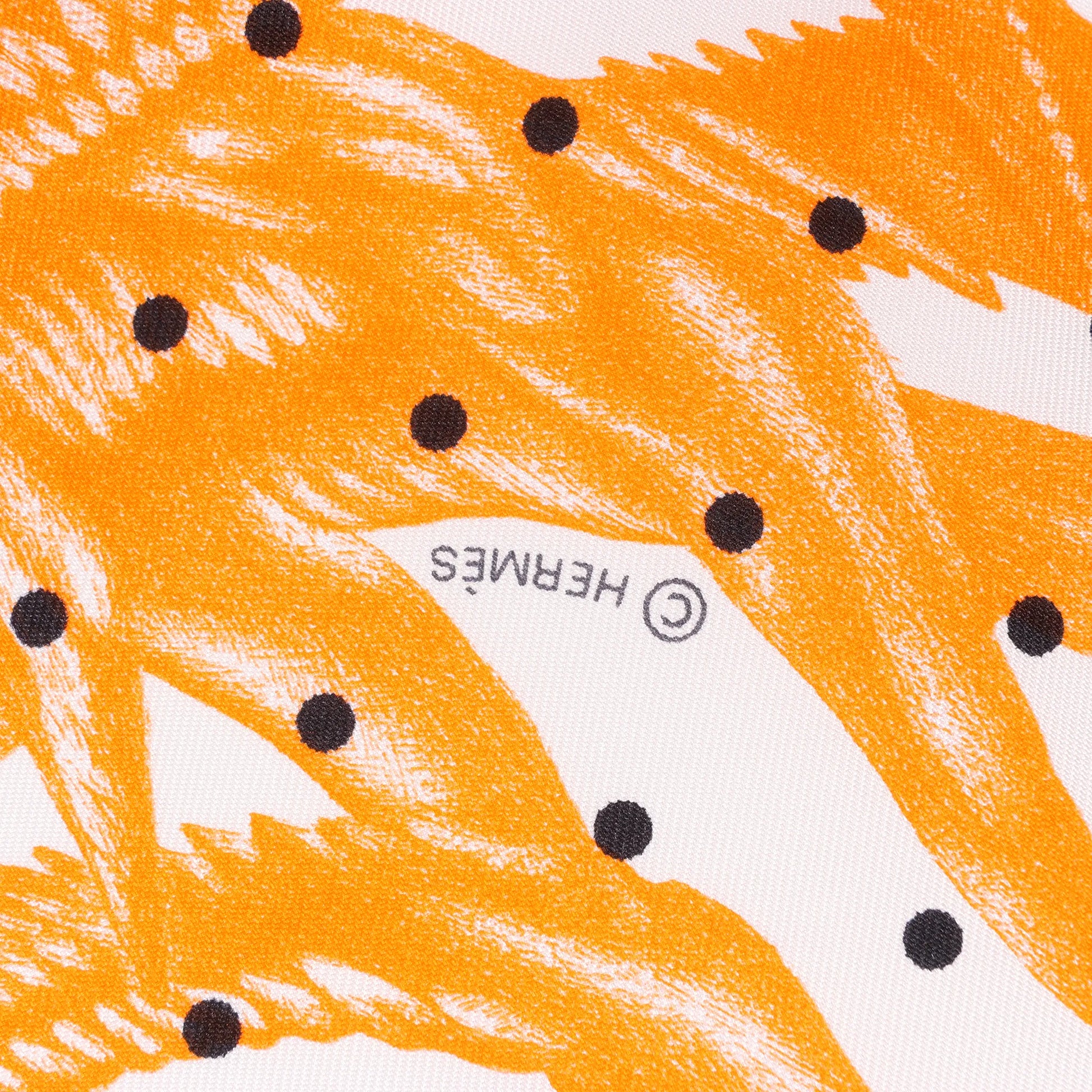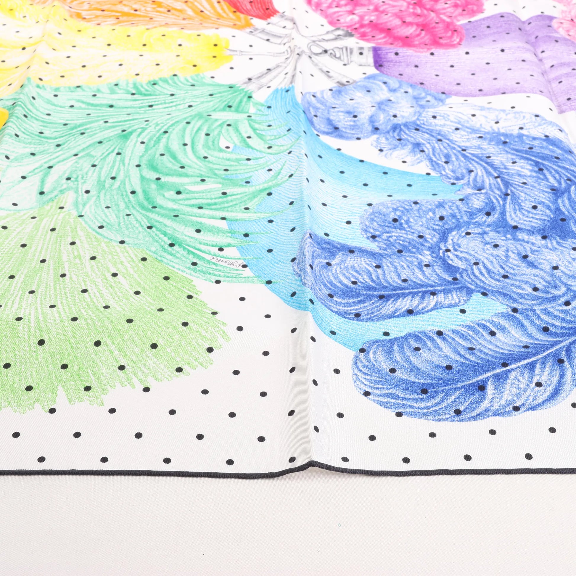The Hermès Carré 90 "Plumets et Panaches" silk scarf in white and multicolor dazzles with an array of ornate plumes and feathers in vibrant hues. Set against a playful polka-dot background, this design captures the theatrical elegance of ceremonial adornments with signature Hermès sophistication.