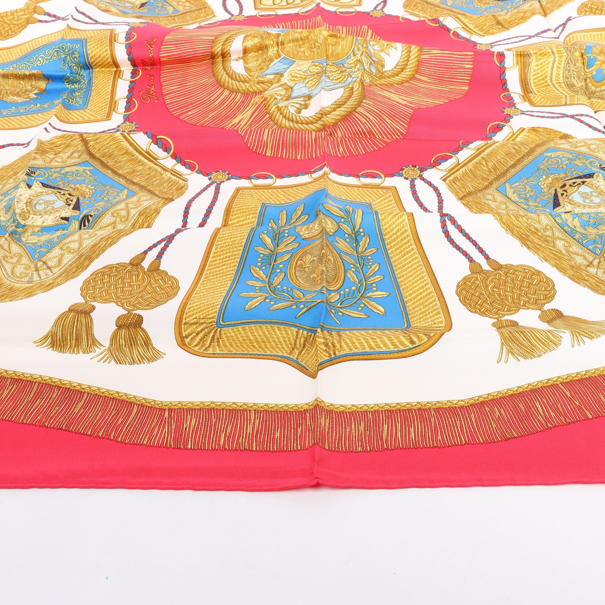 Classic and regal, this Hermès Carré 90 "Poste et Cavalerie" handkerchief in red silk showcases ornate equestrian motifs in gold and blue—an exquisite accessory that celebrates the house’s heritage with timeless elegance.