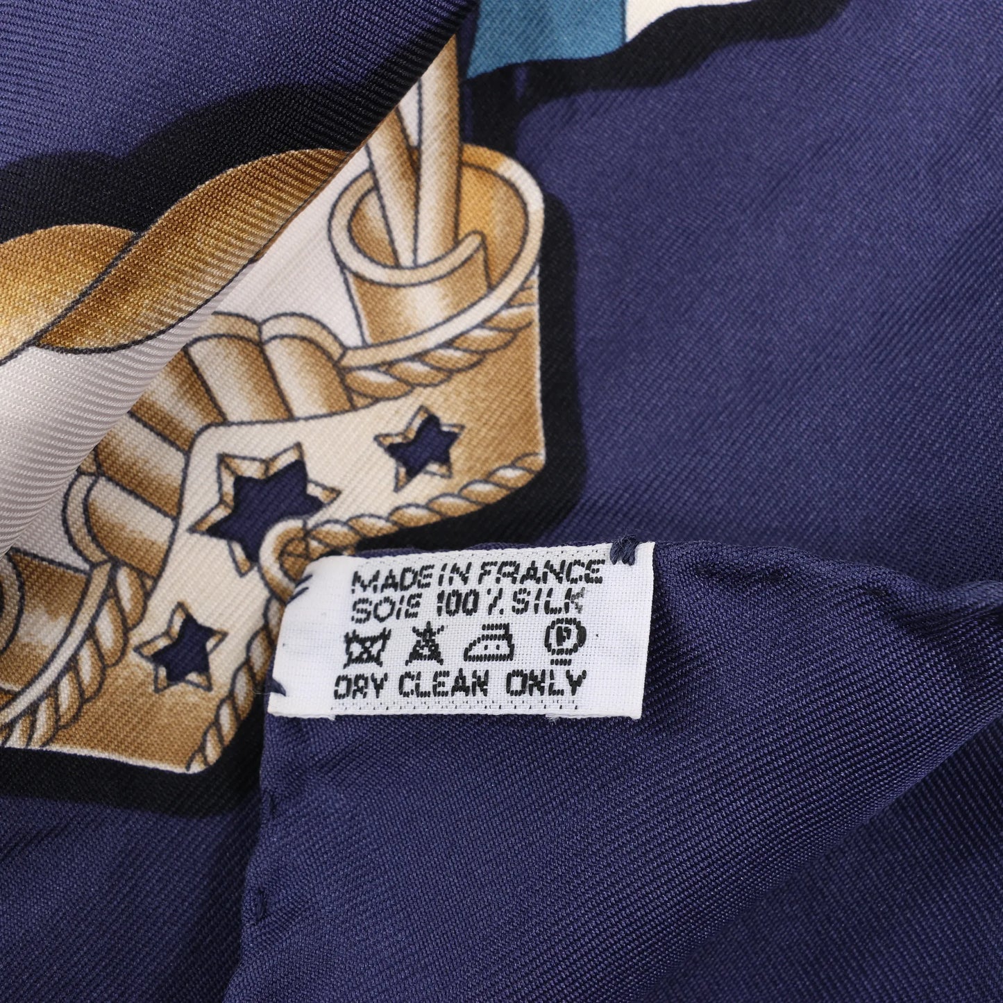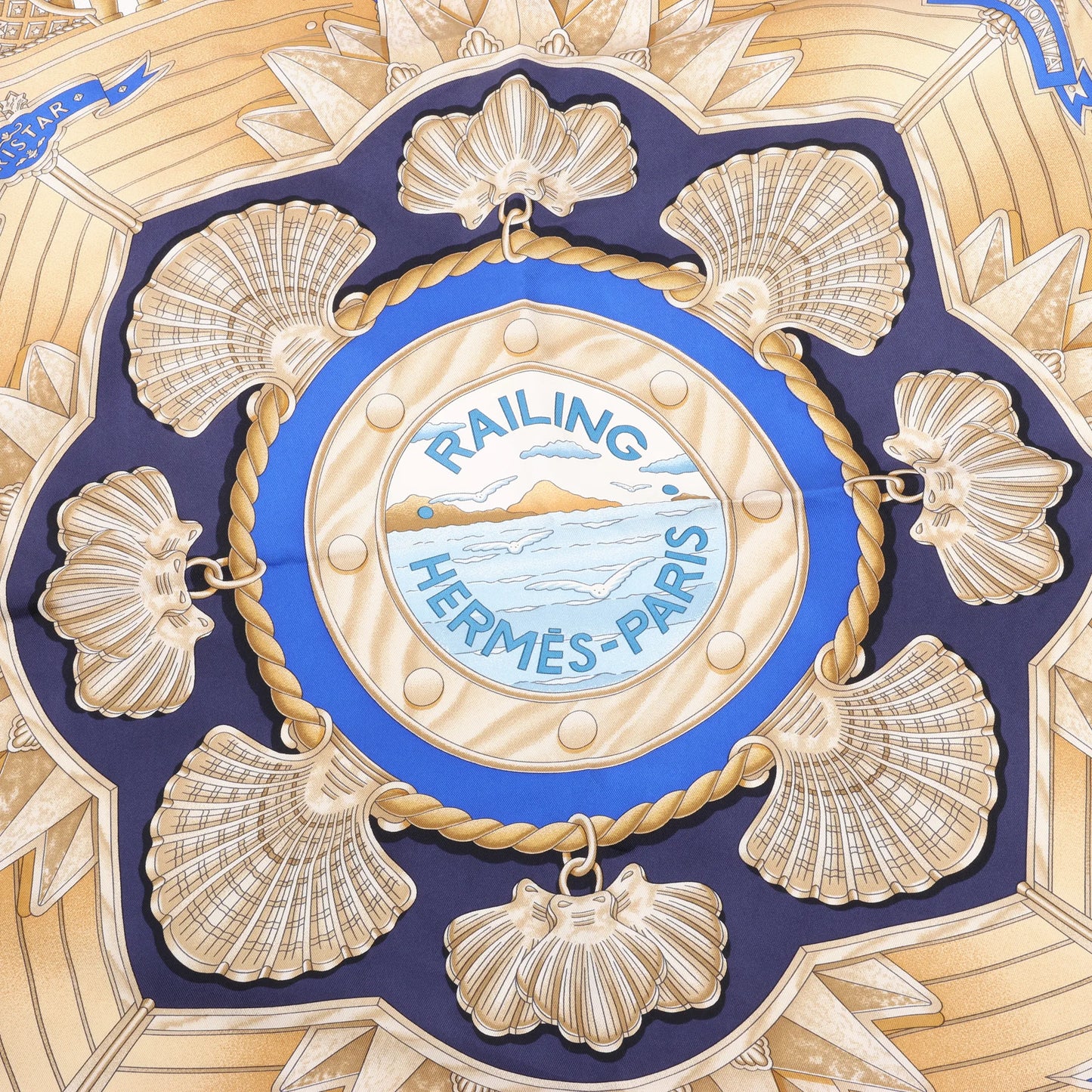 Add a touch of nautical luxury with the Hermès Carré 90 "RAILING" Silk Handkerchief in Navy Blue. Made from 100% silk, this intricately illustrated square scarf showcases maritime motifs and timeless craftsmanship—ideal for refined accessorizing.