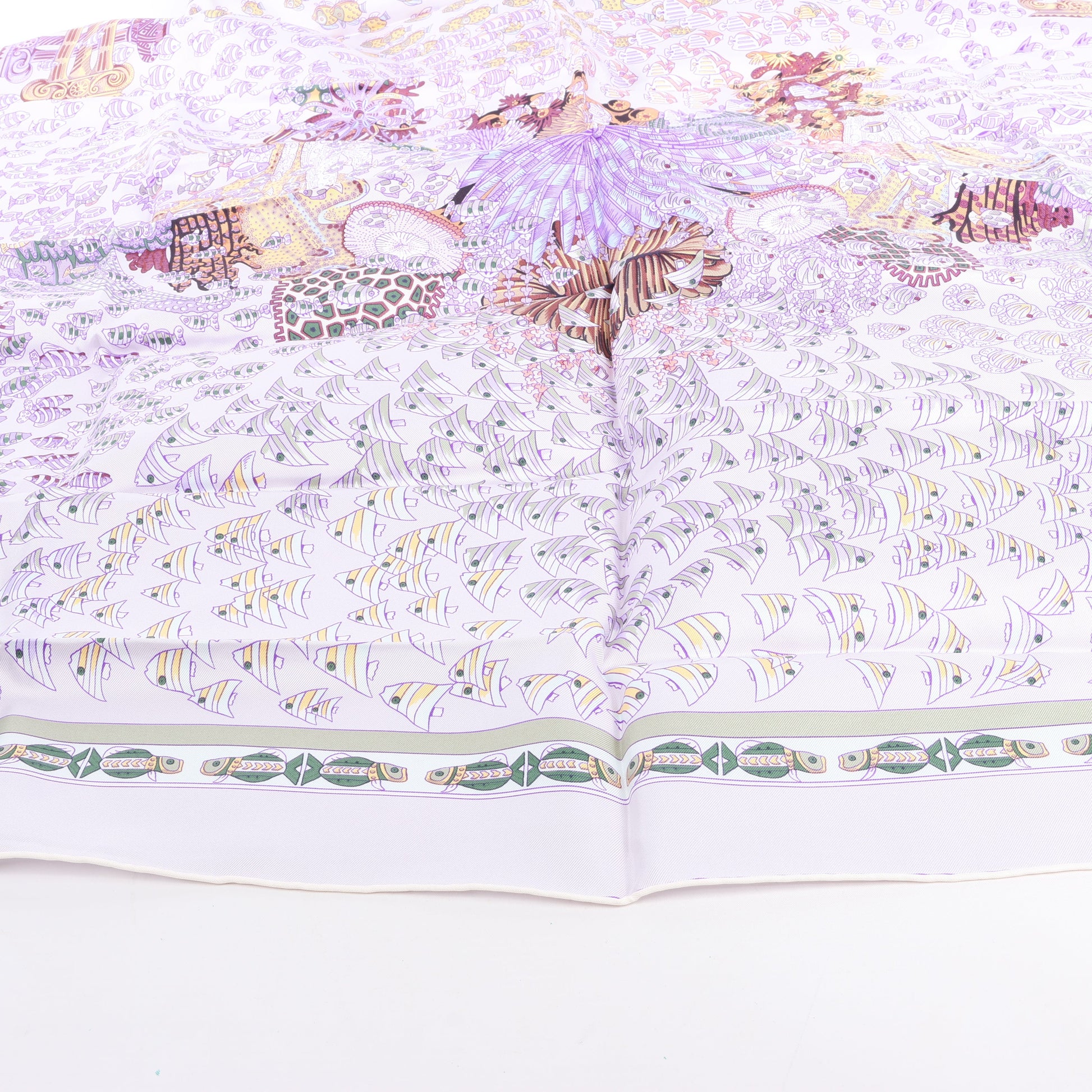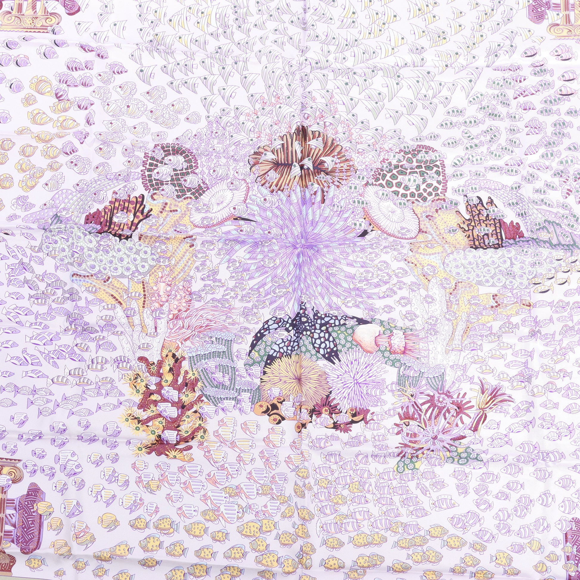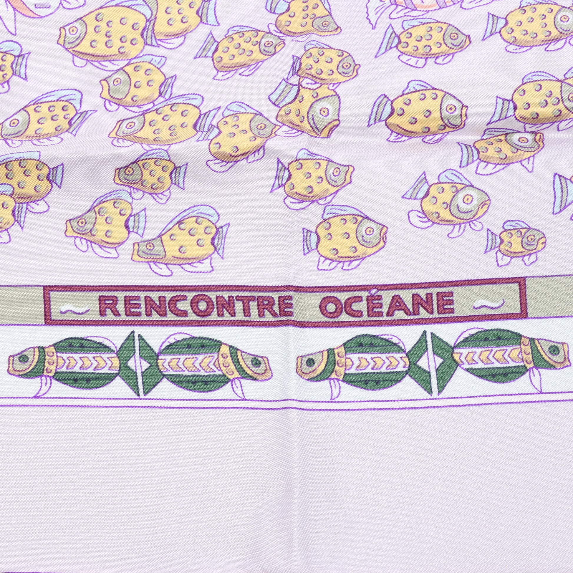 Delicate and dreamy, this Hermès Carré 90 "Rencontre Océane" handkerchief in soft purple silk captures an enchanting underwater world with intricate marine life and coral motifs—an elegant tribute to oceanic beauty.