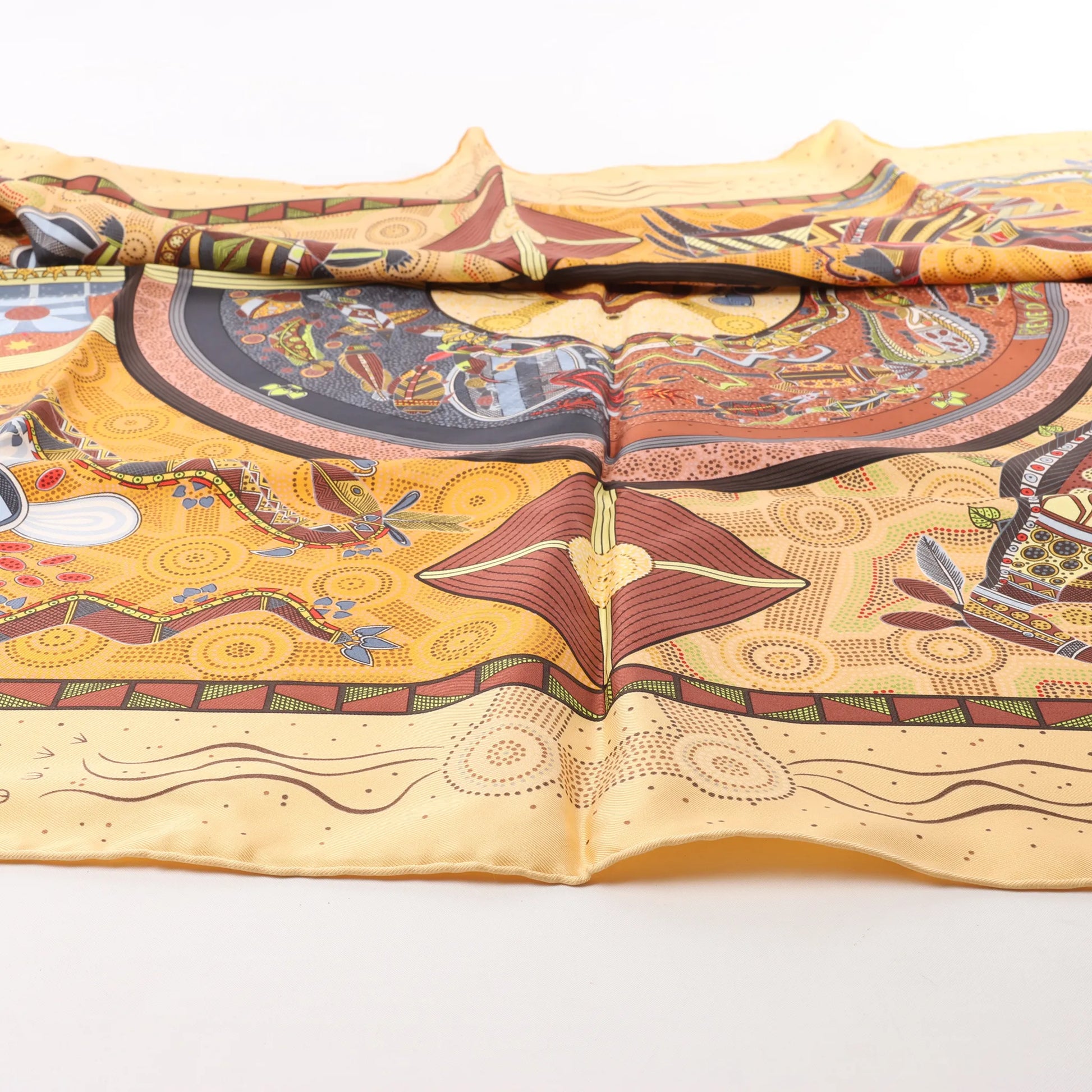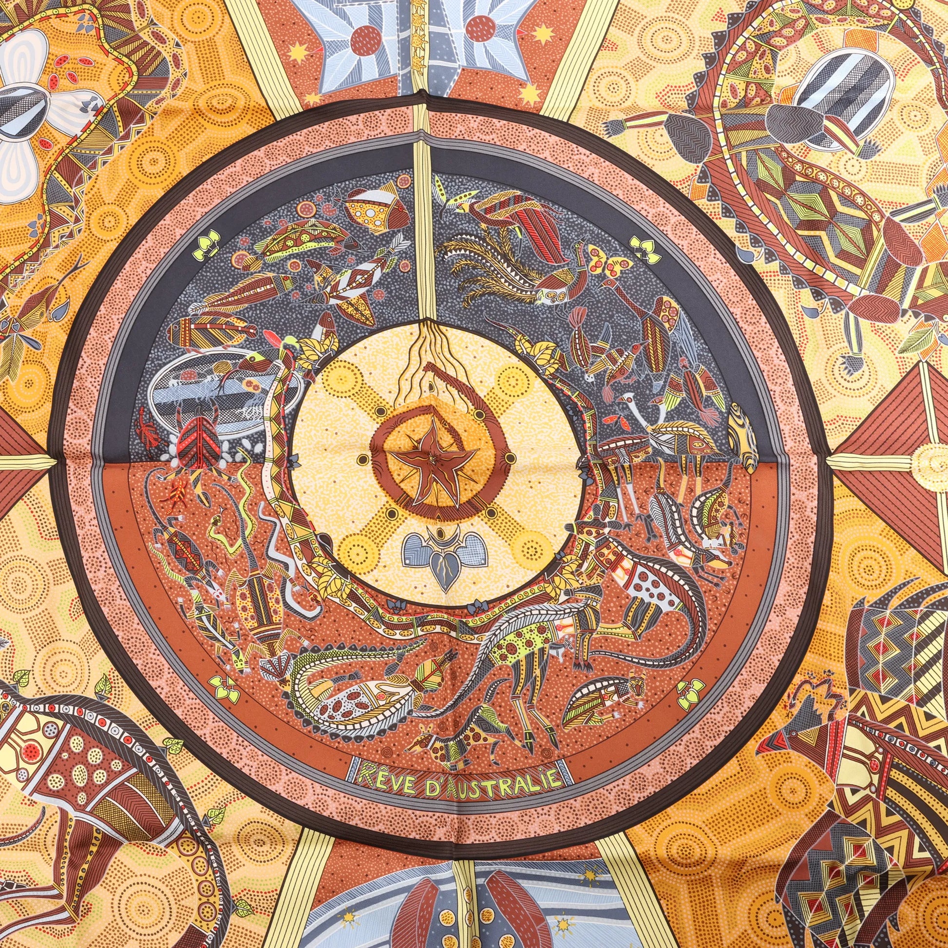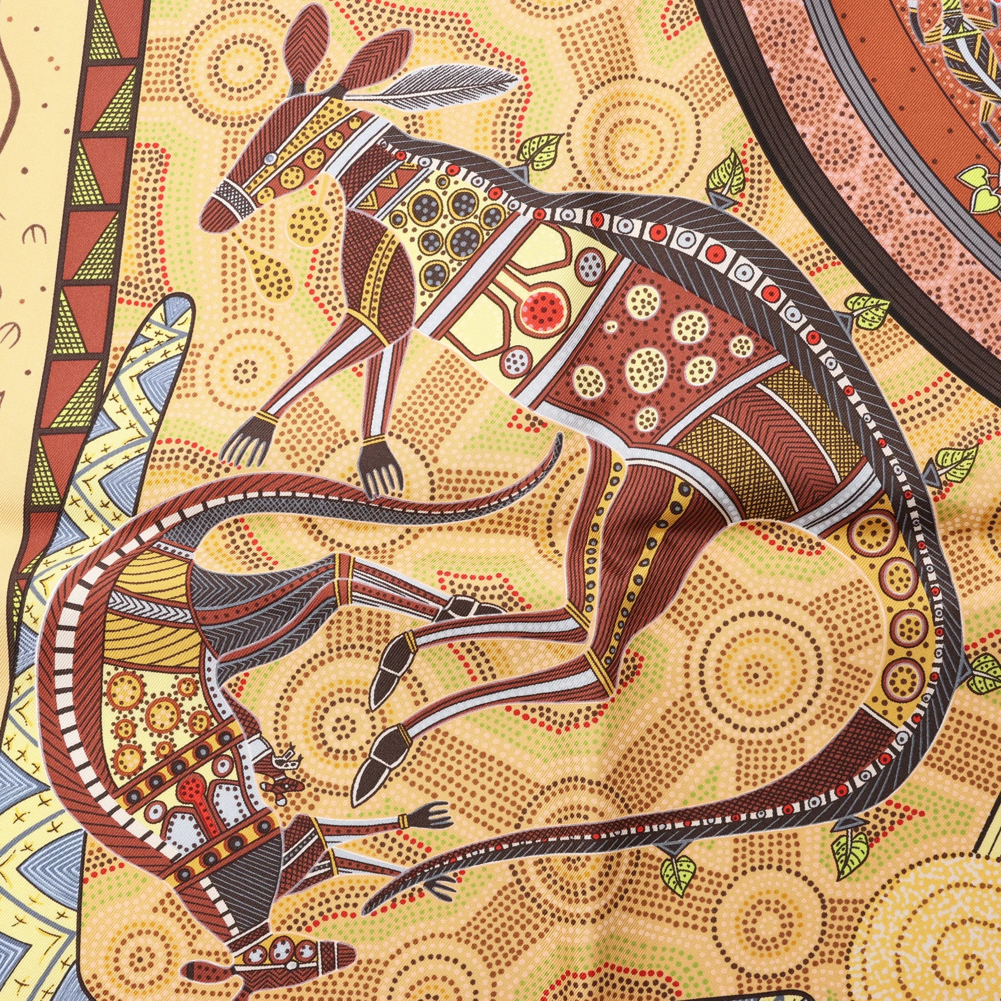 The Hermès Carré 90 "Rêve d’Australie" in beige brings dreamlike storytelling to life through rich, Aboriginal-inspired illustrations. Crafted from pure silk, this scarf features intricate depictions of native animals, celestial symbols, and tribal motifs—perfect for collectors and adventurers alike.