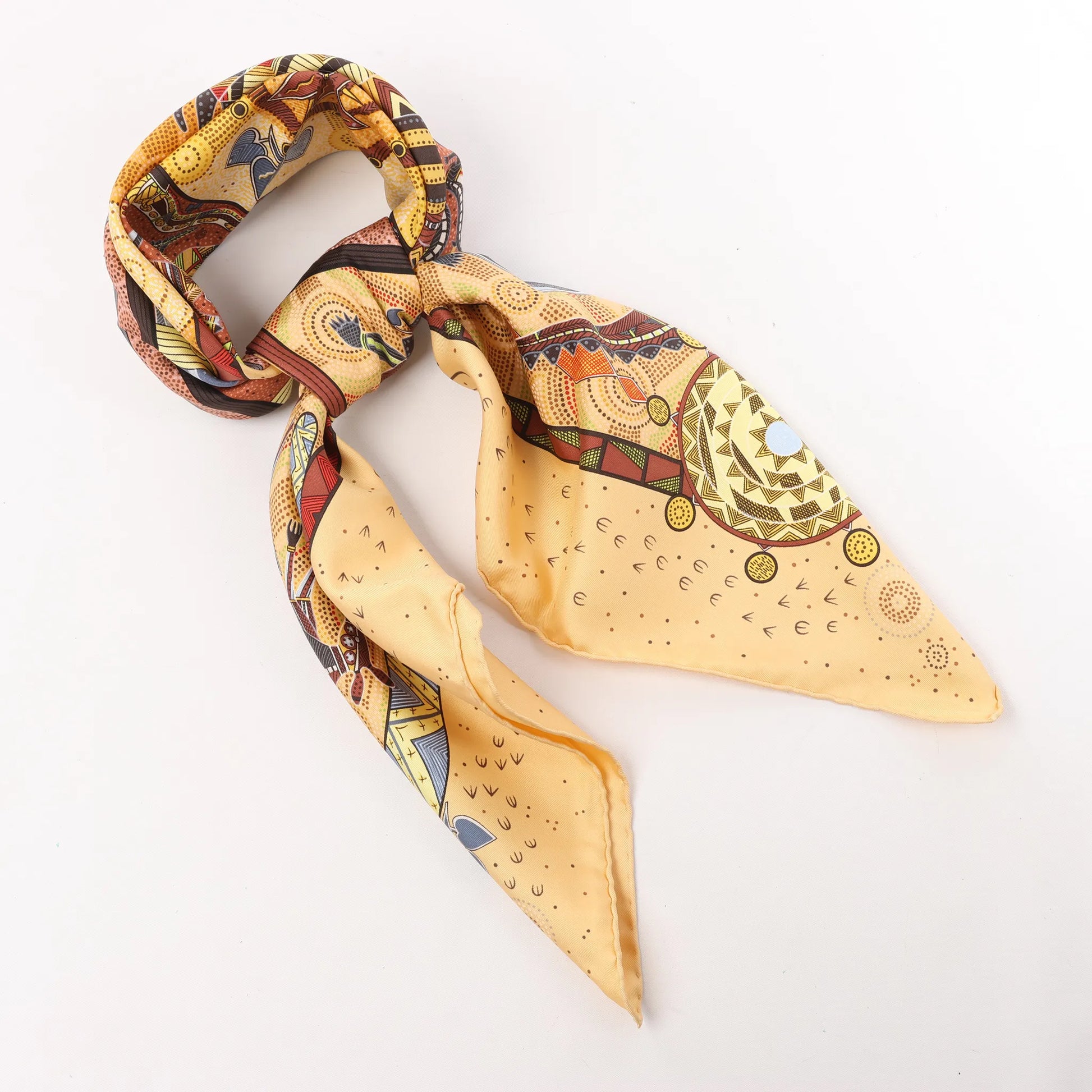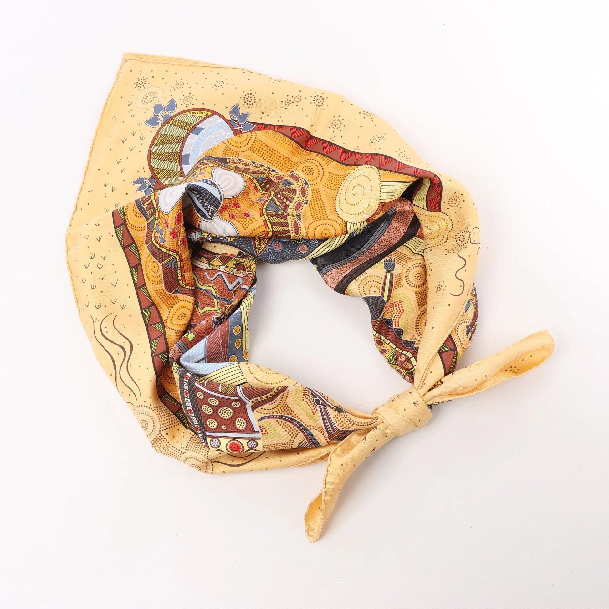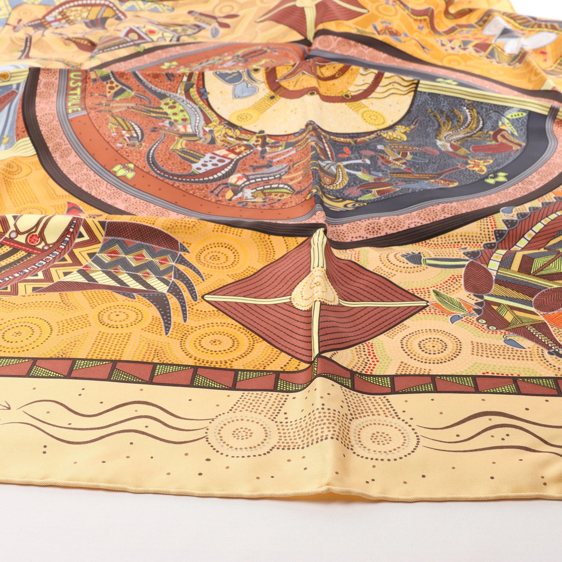 The Hermès Carré 90 "Rêve d’Australie" in beige brings dreamlike storytelling to life through rich, Aboriginal-inspired illustrations. Crafted from pure silk, this scarf features intricate depictions of native animals, celestial symbols, and tribal motifs—perfect for collectors and adventurers alike.