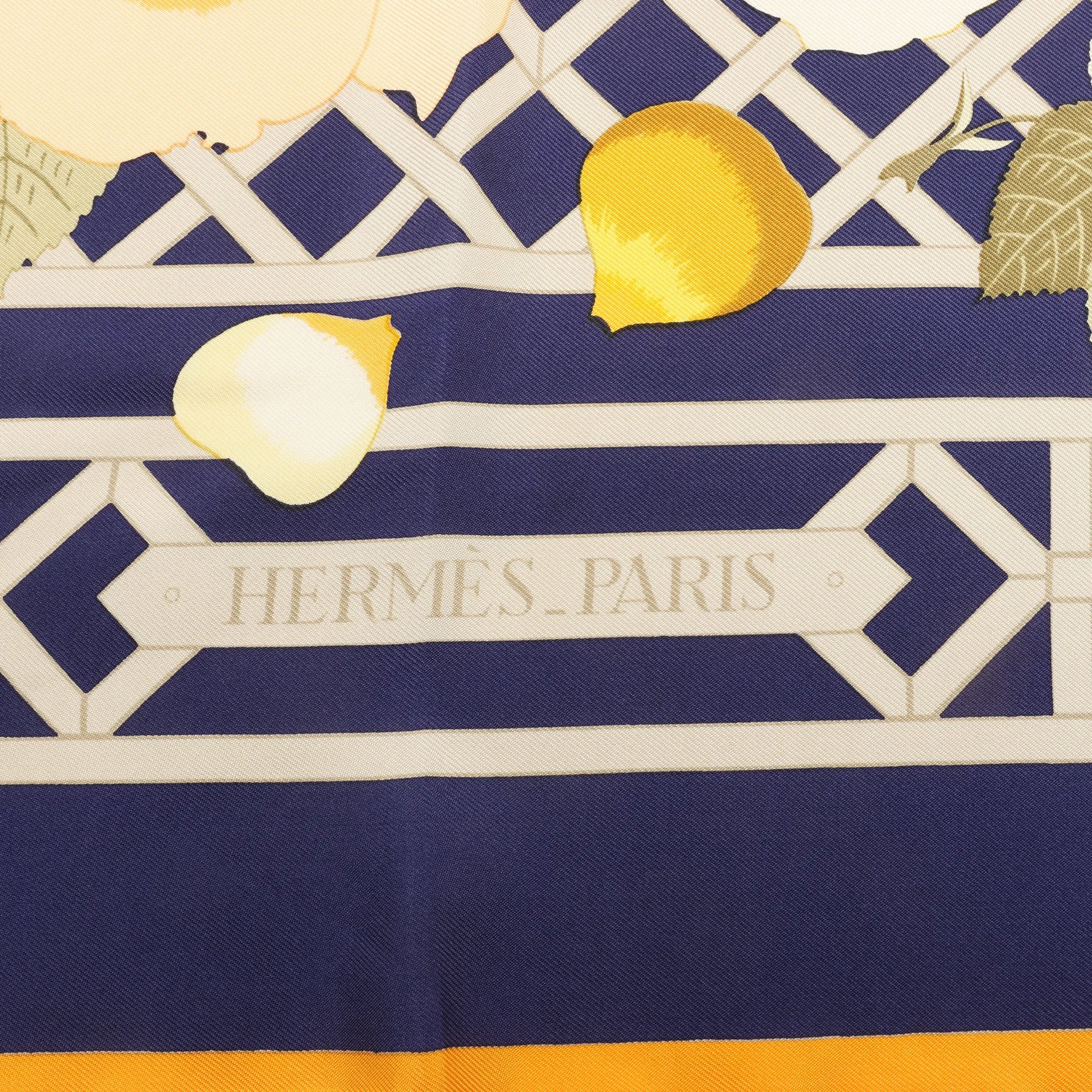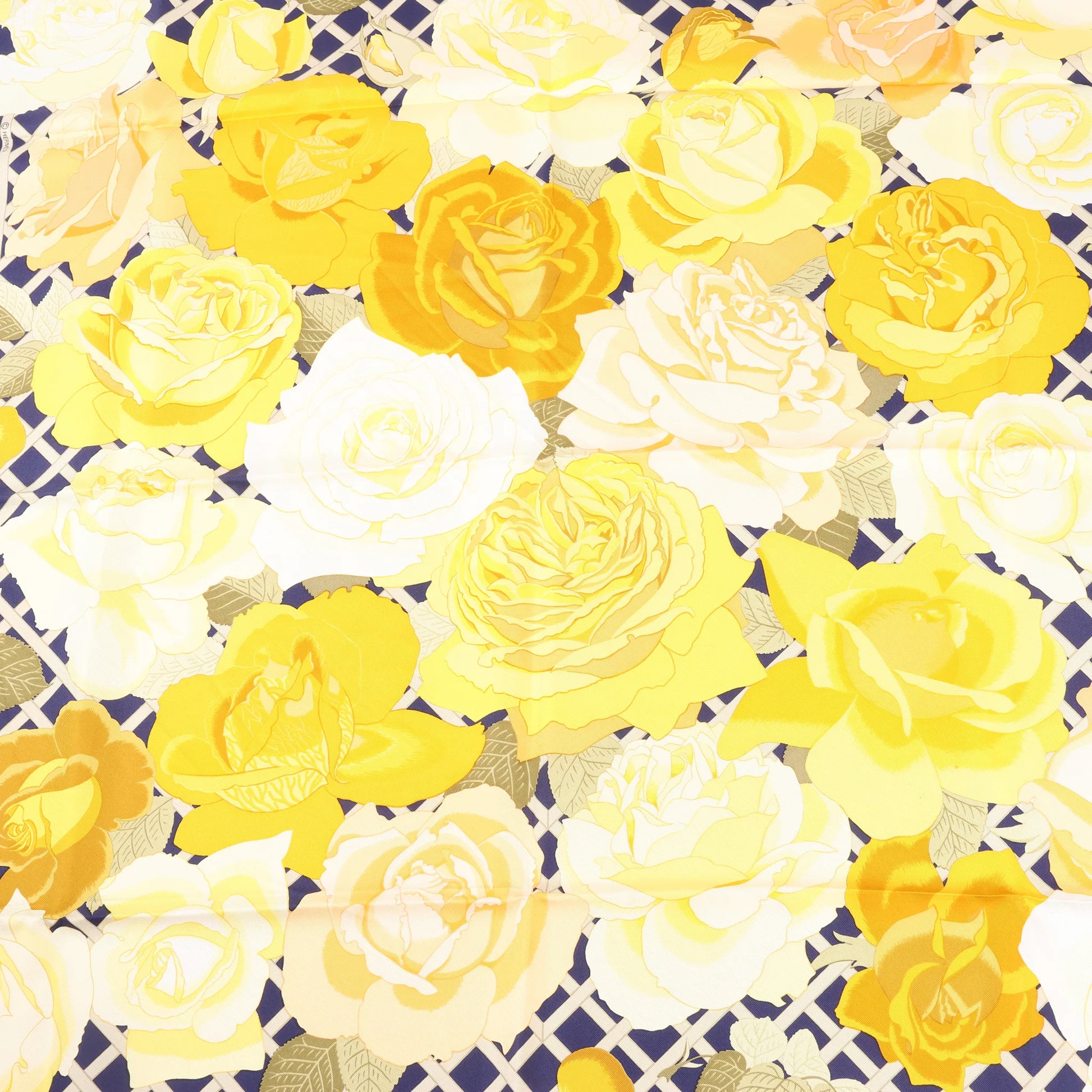 Hermès Carré 90 "ROSERAIE" silk scarf in yellow blooms with vibrant florals set against a lattice garden design. Crafted from 100% silk, it’s a radiant, elegant statement piece.