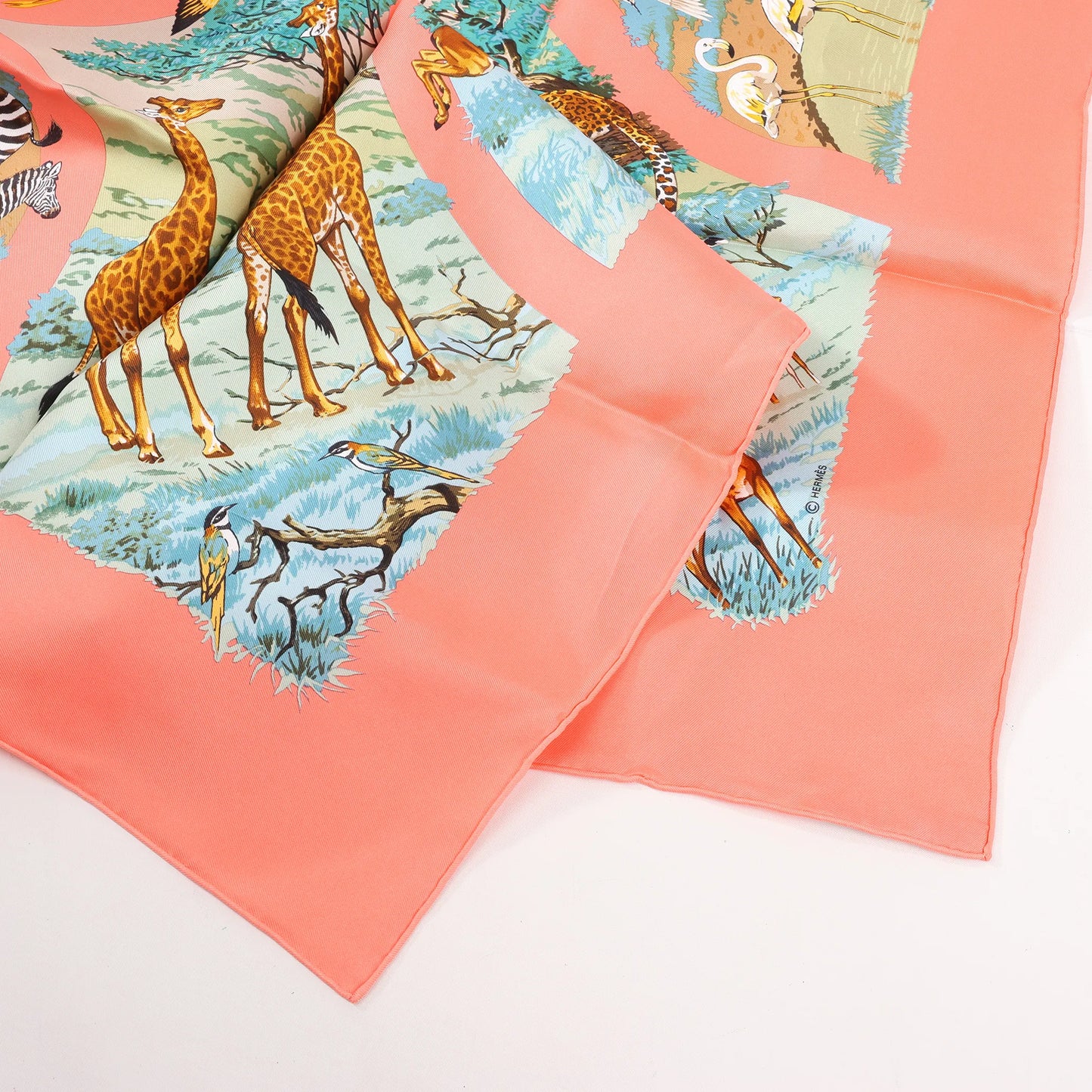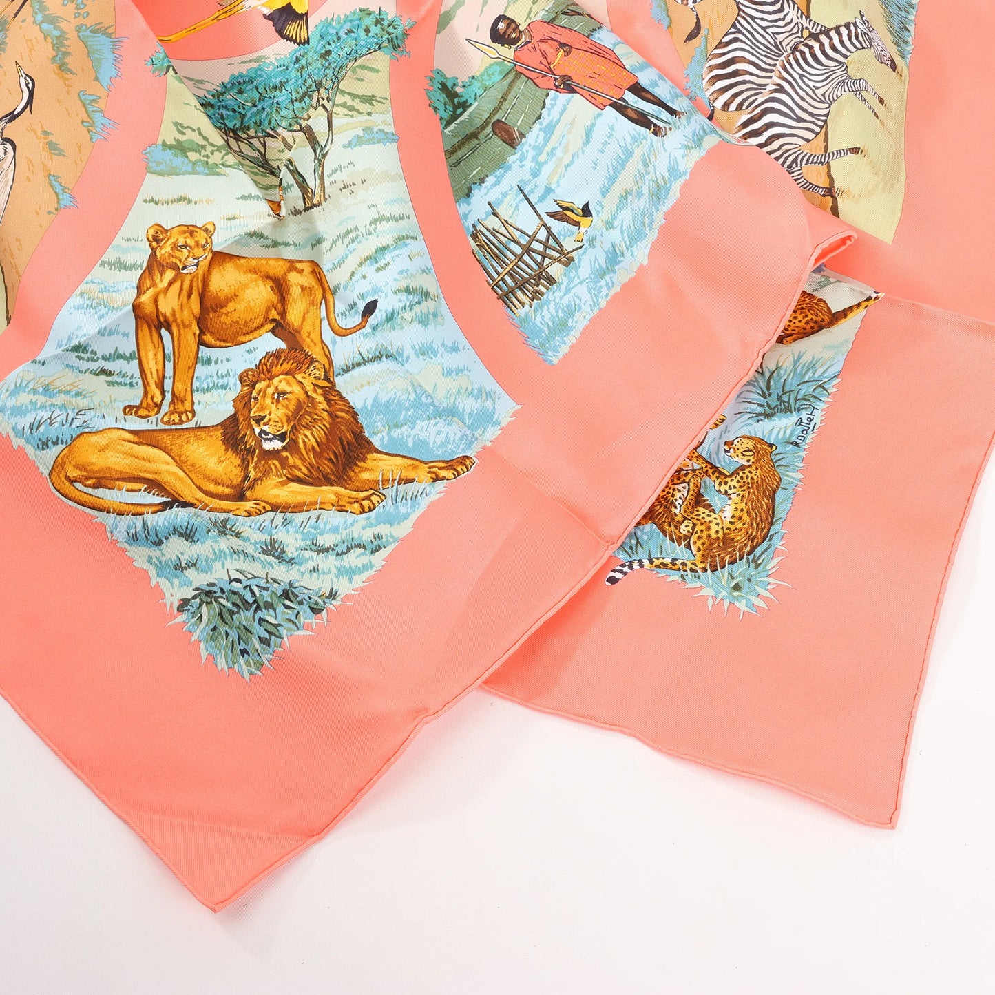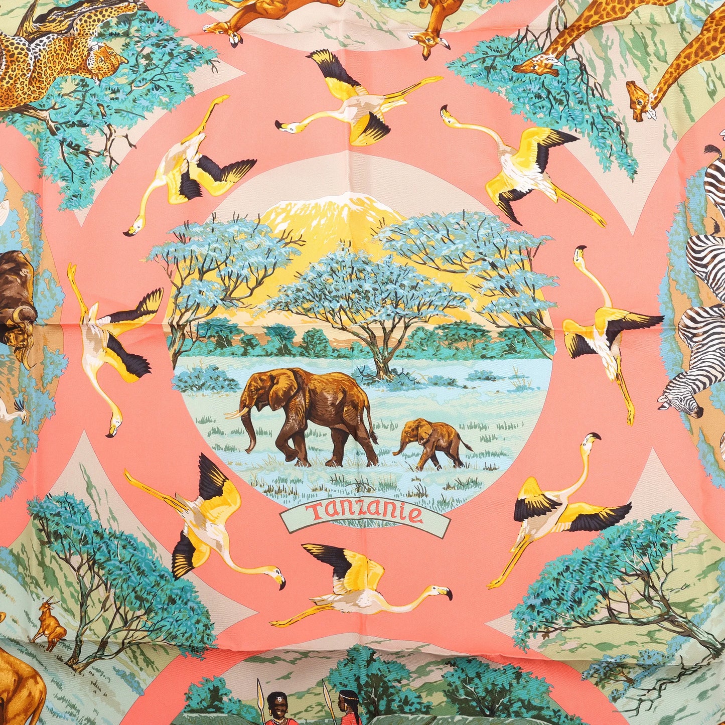 Add a touch of adventure to your wardrobe with the Hermès Carré 90 "Tanzanie" Silk Handkerchief in Pink. Made from 100% silk, this vibrant scarf showcases a rich safari-themed design inspired by Tanzanian wildlife and culture—ideal for collectors and style lovers.