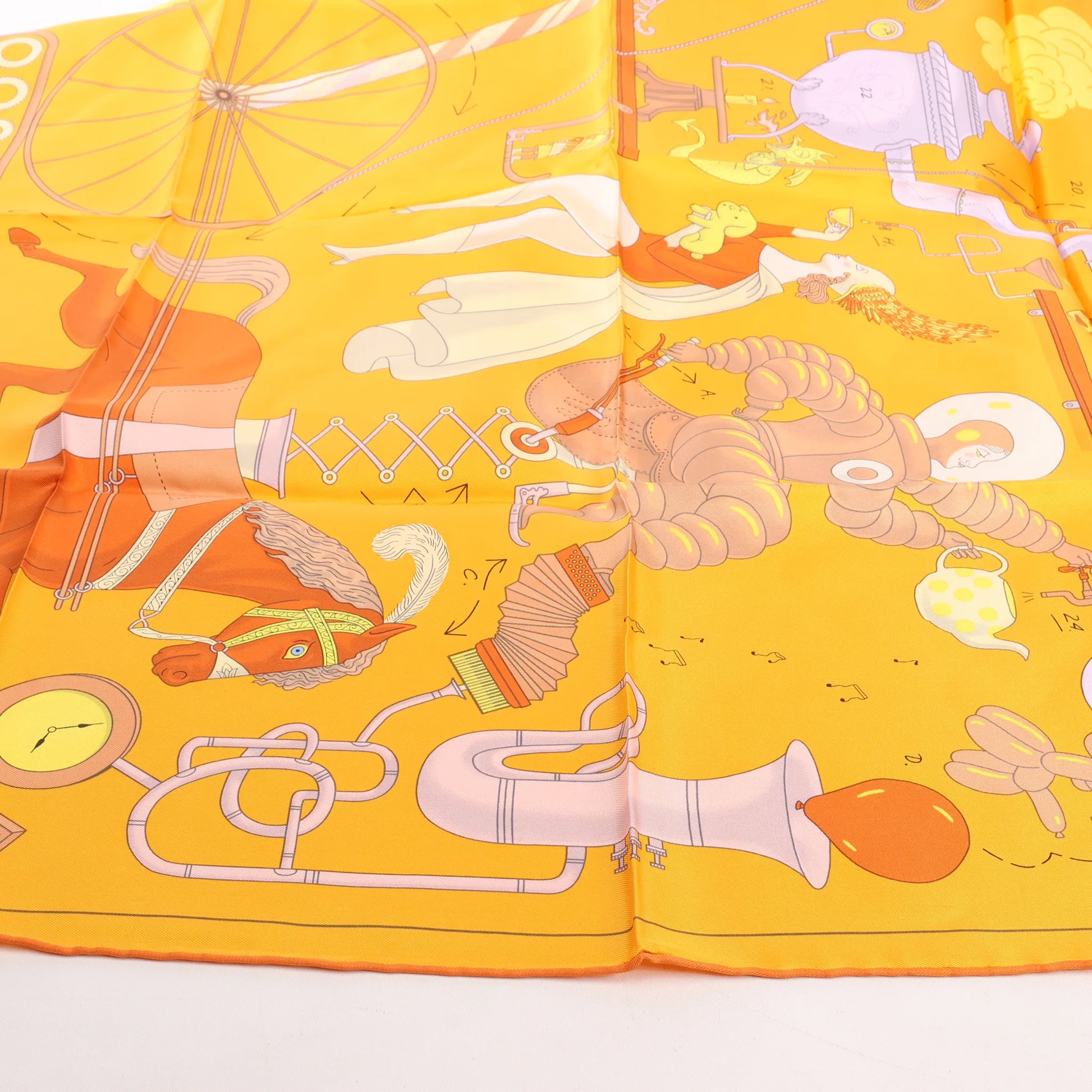 The Hermès Carré 90 "Tea for Two" in orange bursts with whimsical charm, featuring a fantastical scene of tea-making contraptions, playful characters, and imaginative machines. With its vivid citrus tones and surreal artistry, this silk scarf delivers a joyful twist on teatime tradition.