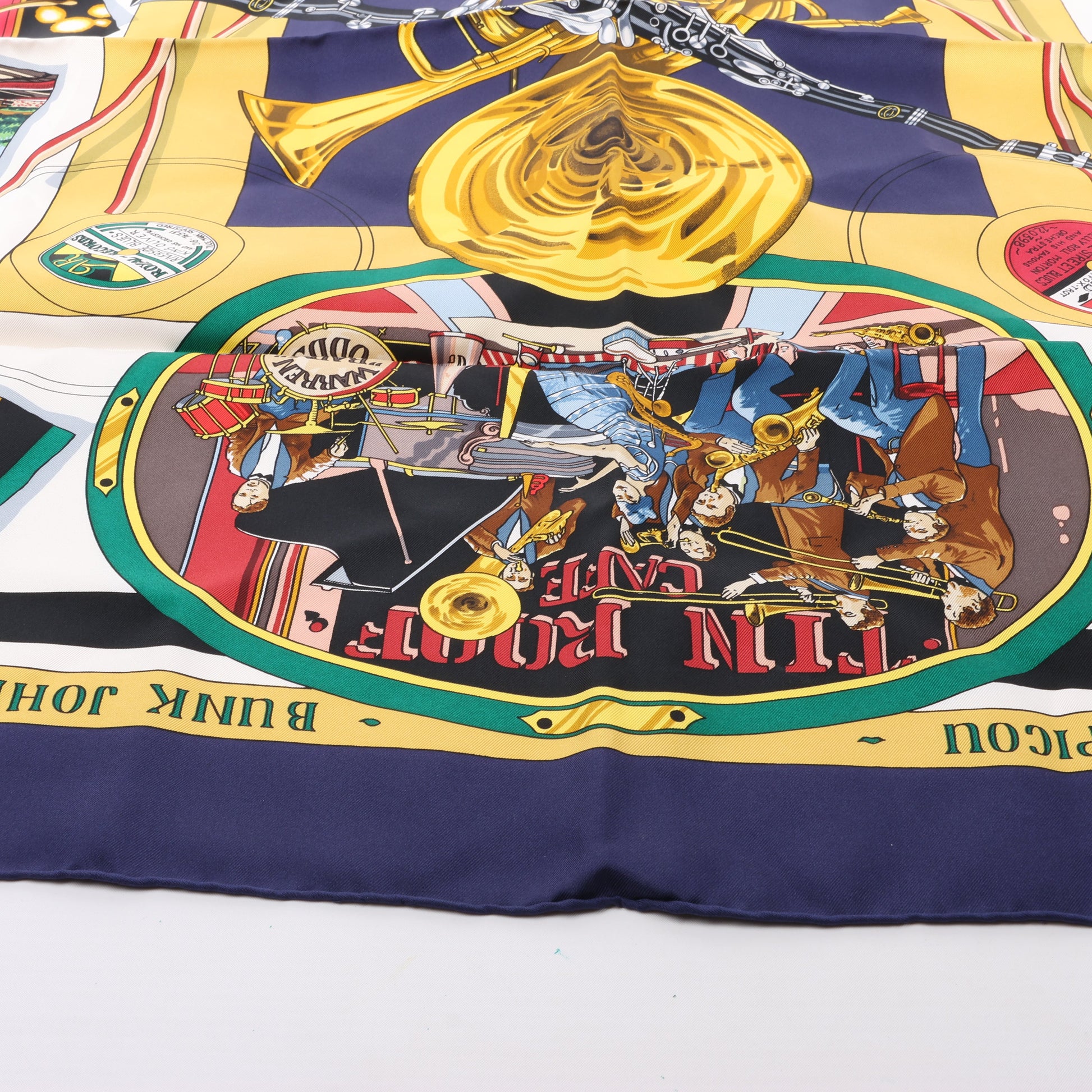 Hermès Carré 90 “The Original New Orleans Creole Jazz 1923” silk handkerchief, celebrating jazz heritage with vibrant musical and cultural motifs on a rich navy blue backdrop. A bold, collectible piece full of rhythm and charm.