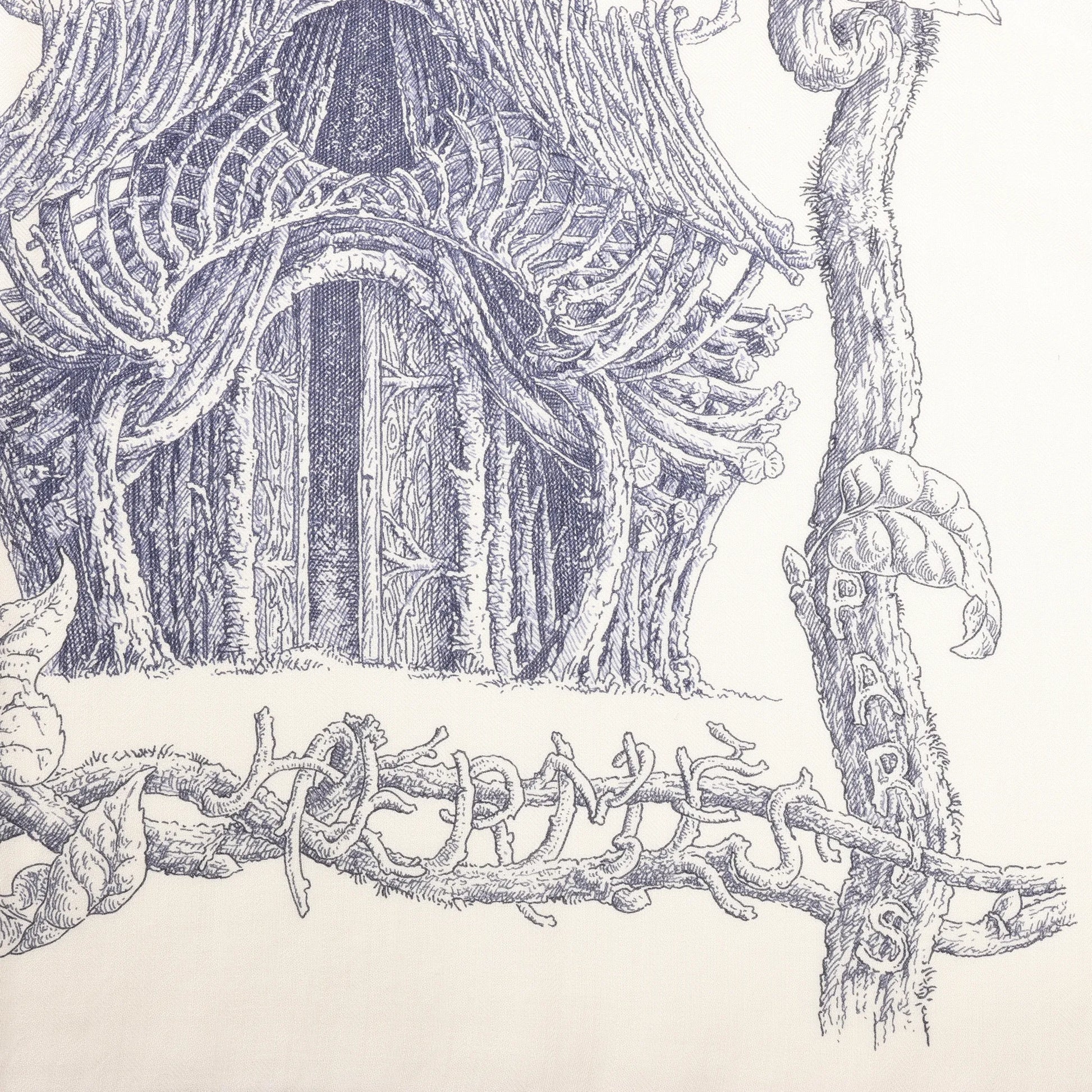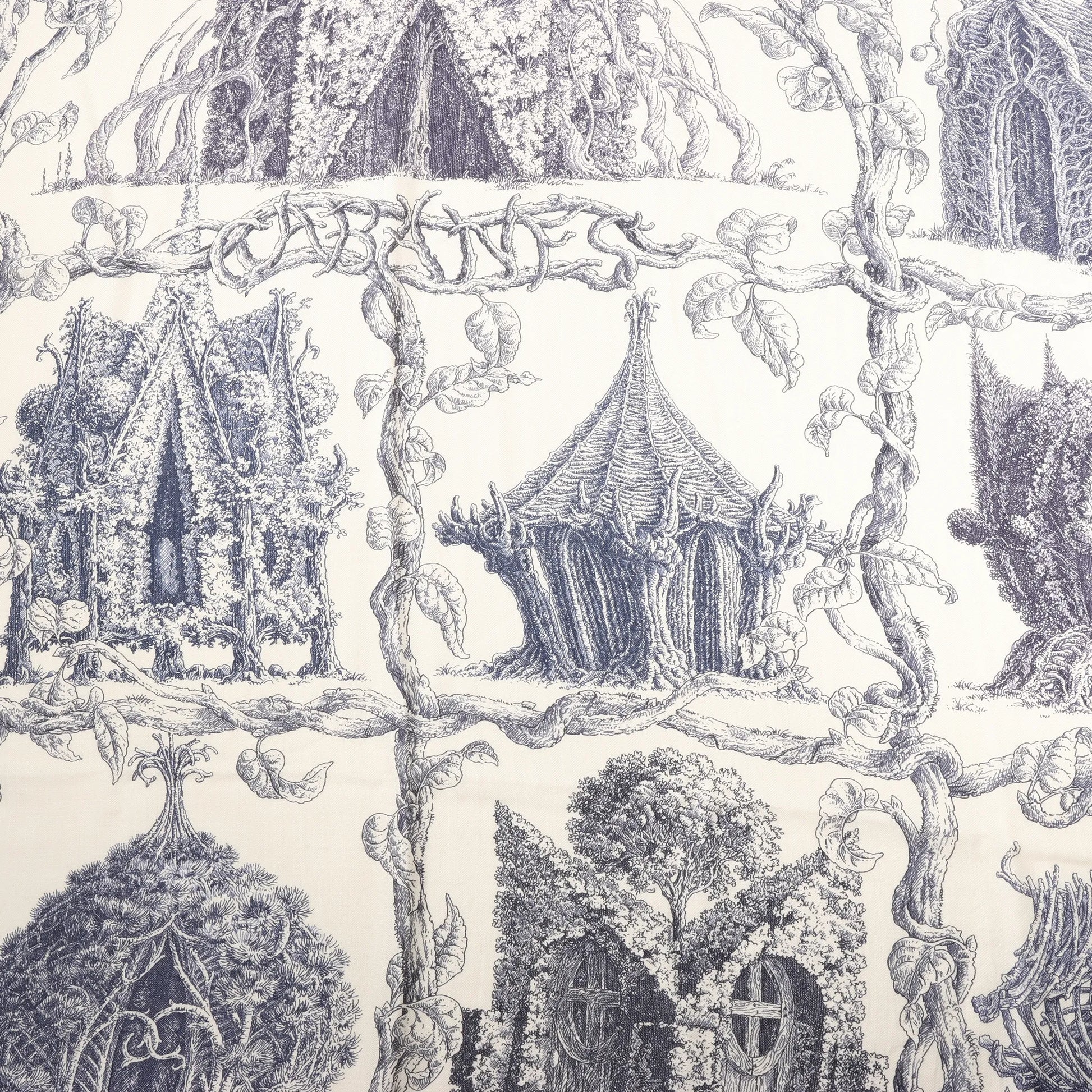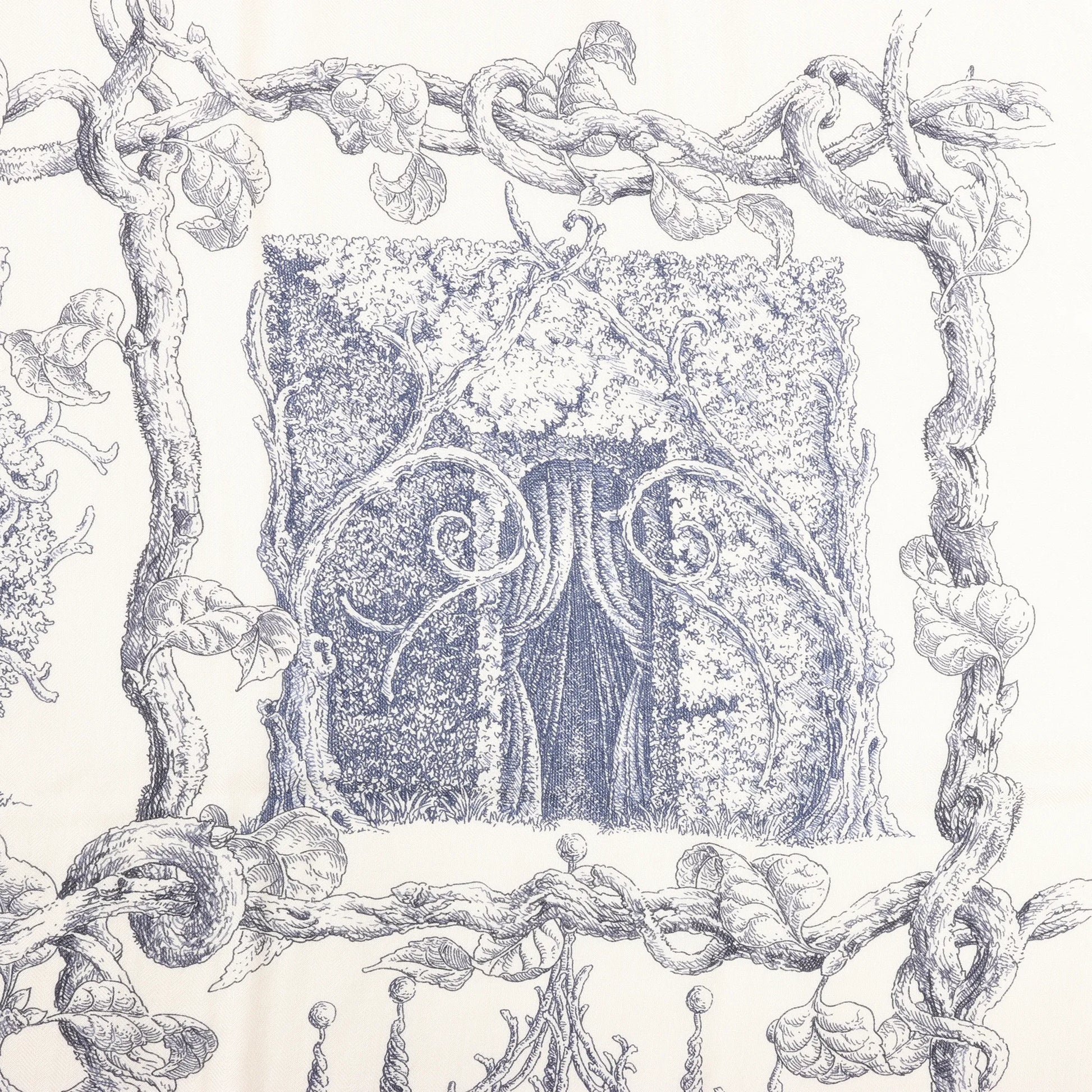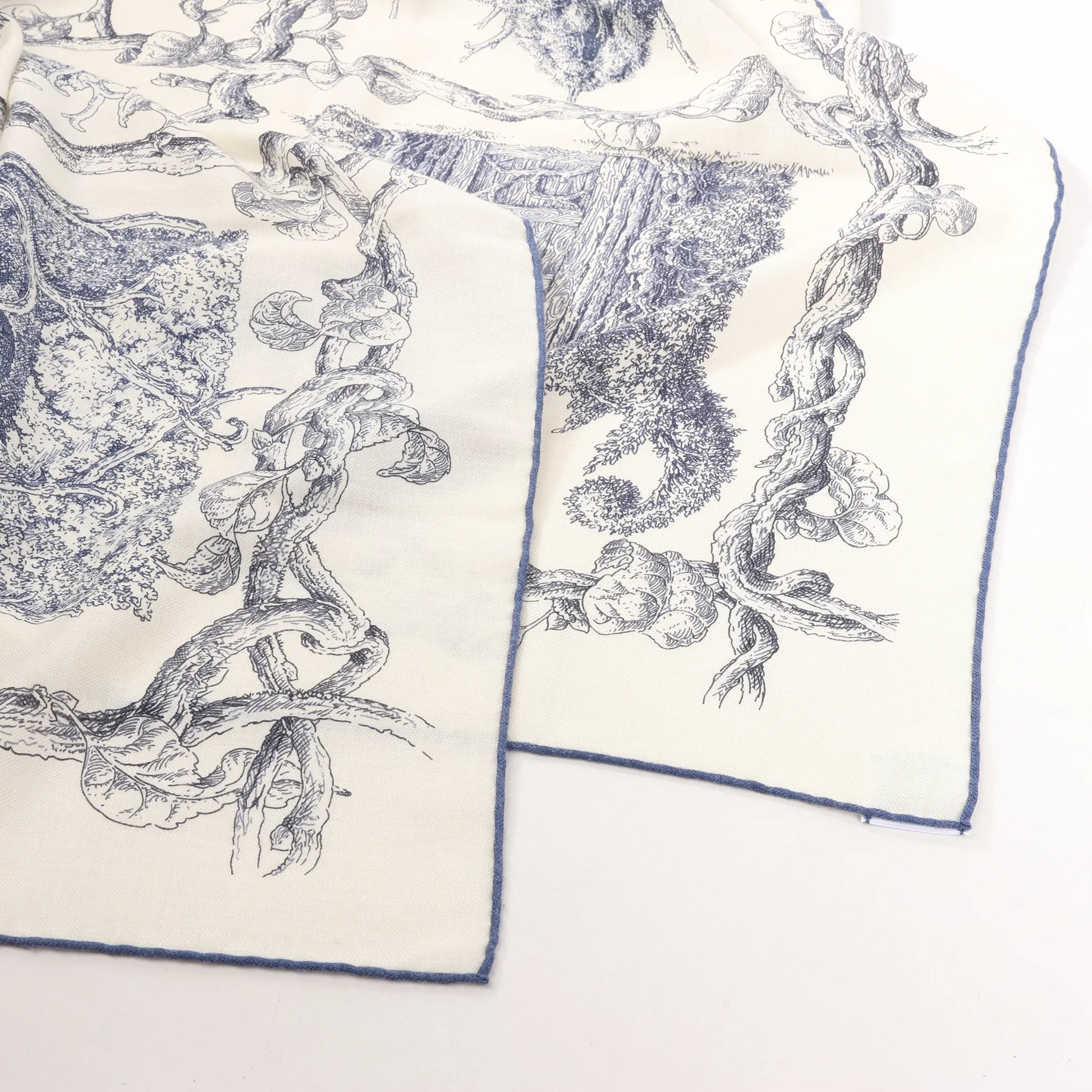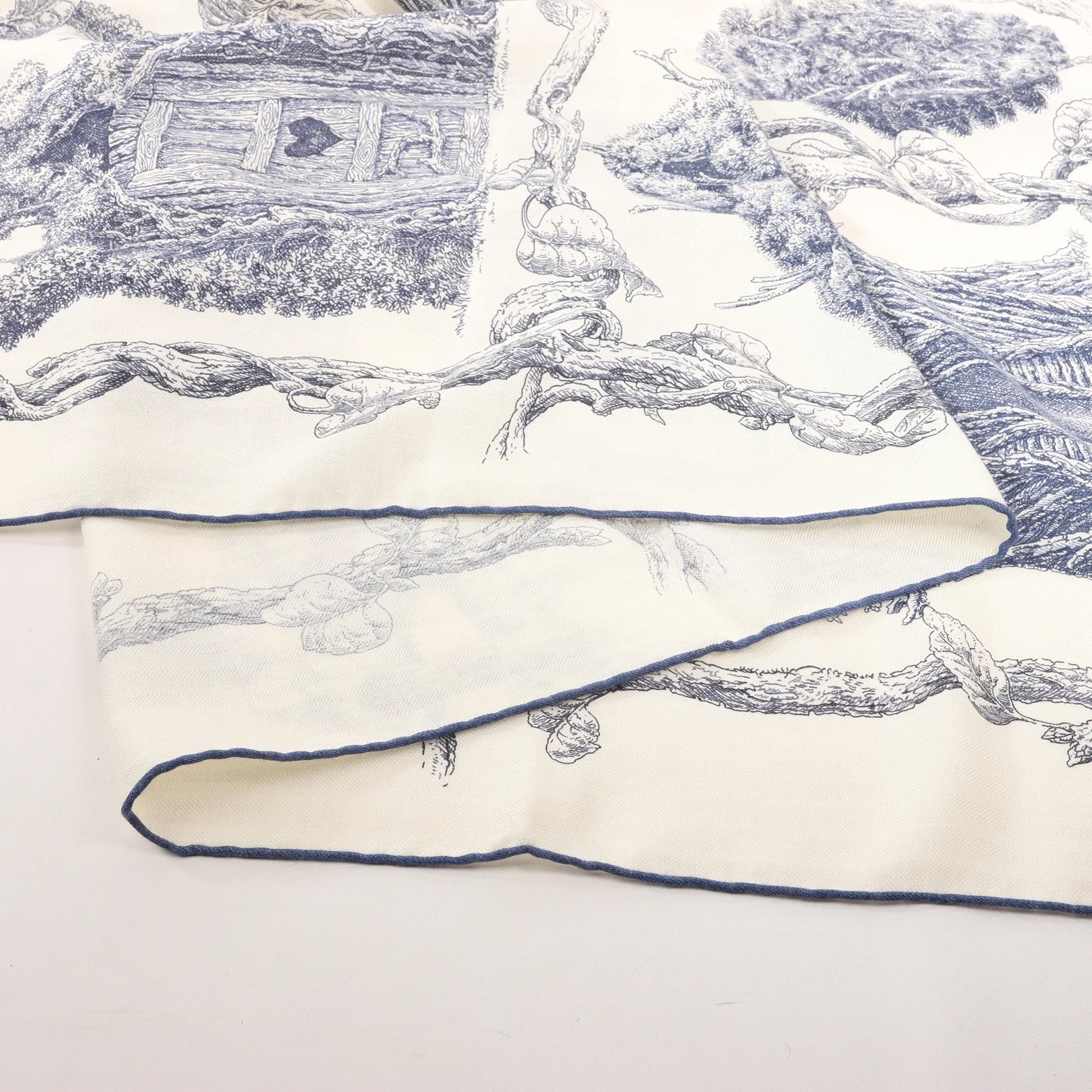 The Hermès Carré Géant "Les Cabanes" scarf in beige and navy blends fantasy and elegance with a whimsical grid of intricately illustrated treehouses. Crafted in a luxurious cashmere and silk blend, it’s both cozy and captivating.