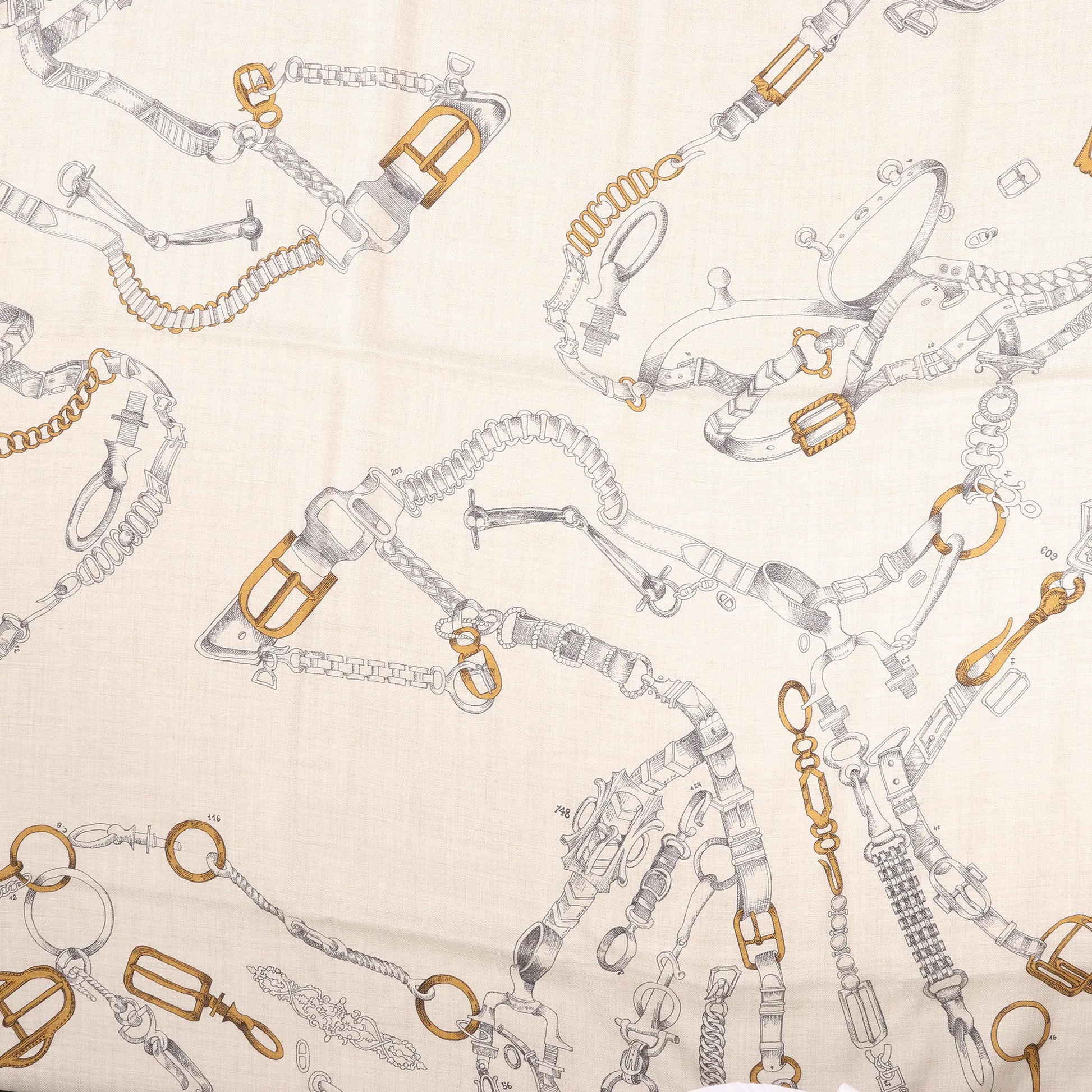 The Hermès Carré Géant "Malines Chevaux Déchène" in beige and navy blue combines equestrian charm with luxurious texture. Crafted from a soft cashmere-silk blend, this oversized scarf features intricate horse and bridle illustrations in a refined palette.