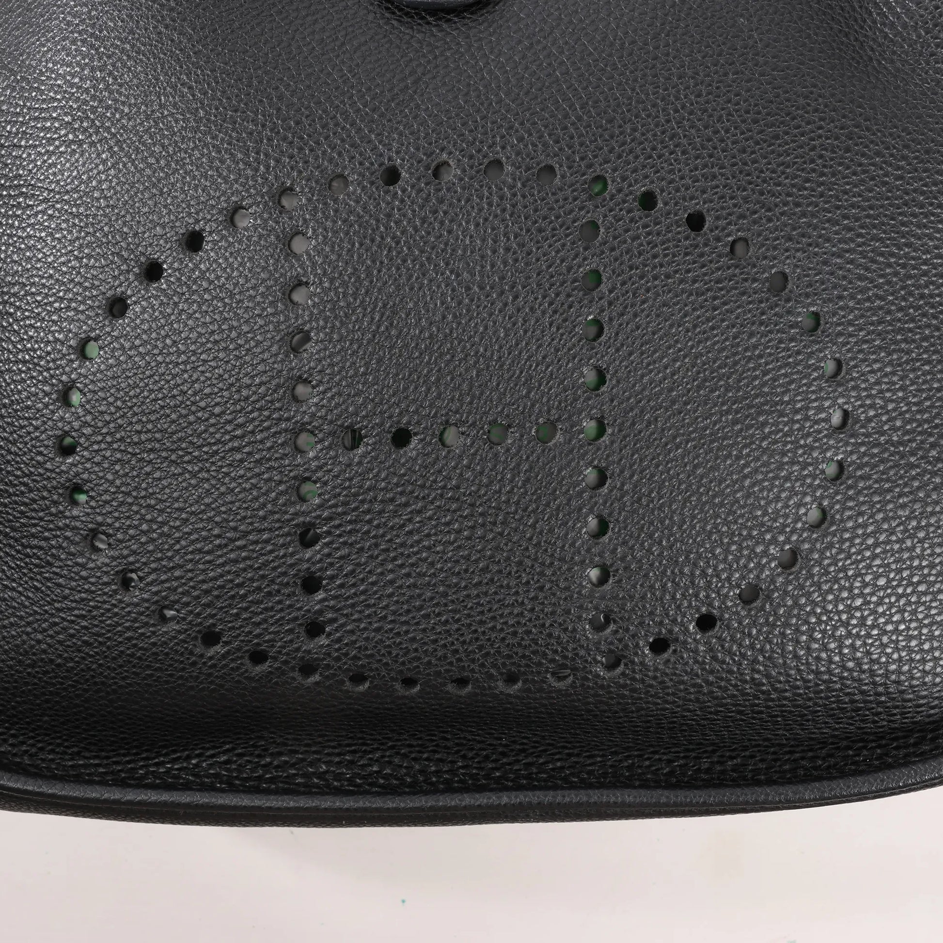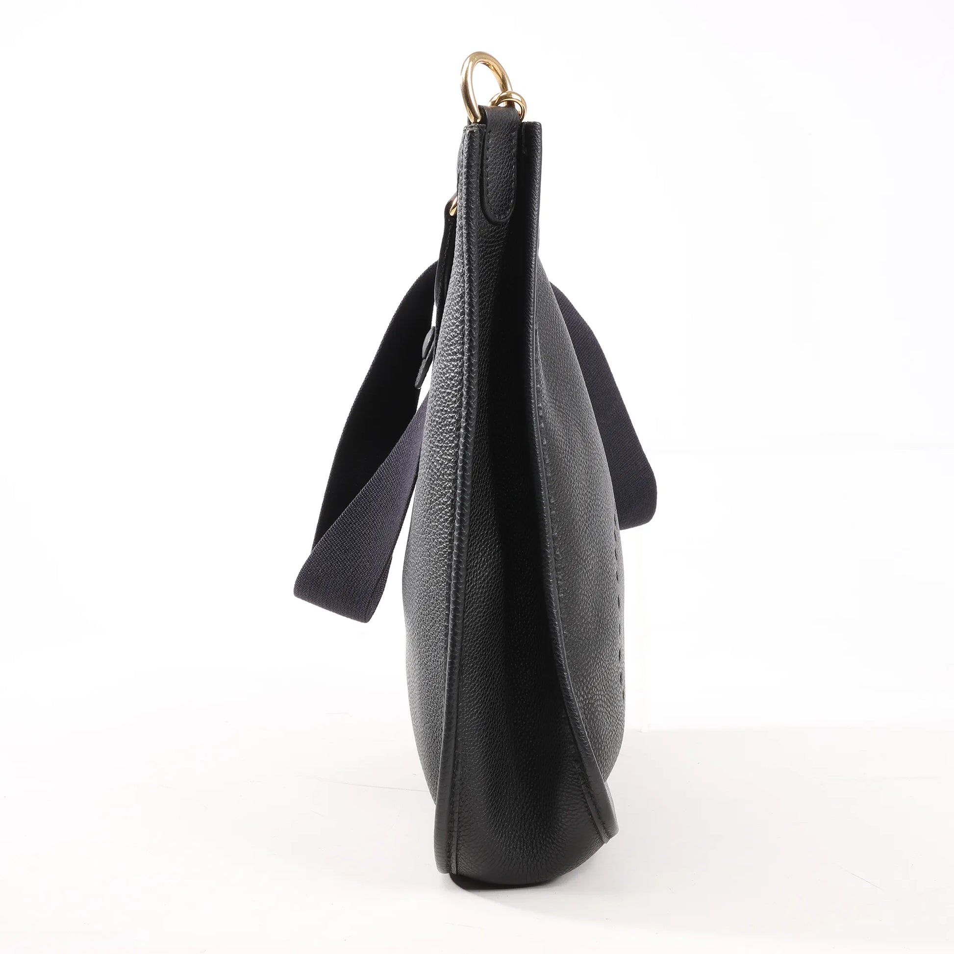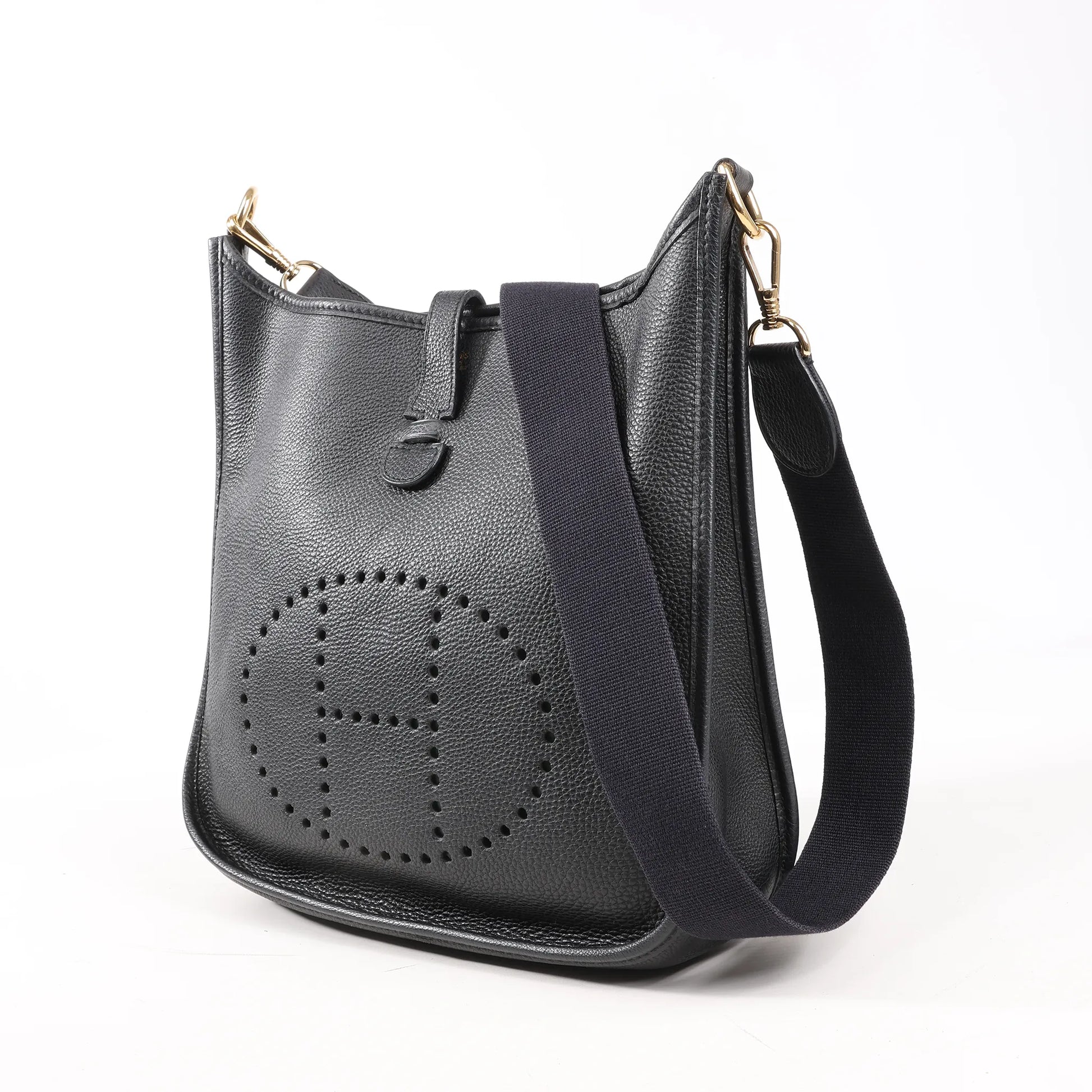 Hermès Evelyne I 29 PM shoulder bag in black Togo leather (□G:2003) features the iconic perforated "H" logo and a wide canvas strap. A timeless blend of function and luxury, perfect for effortless everyday wear.