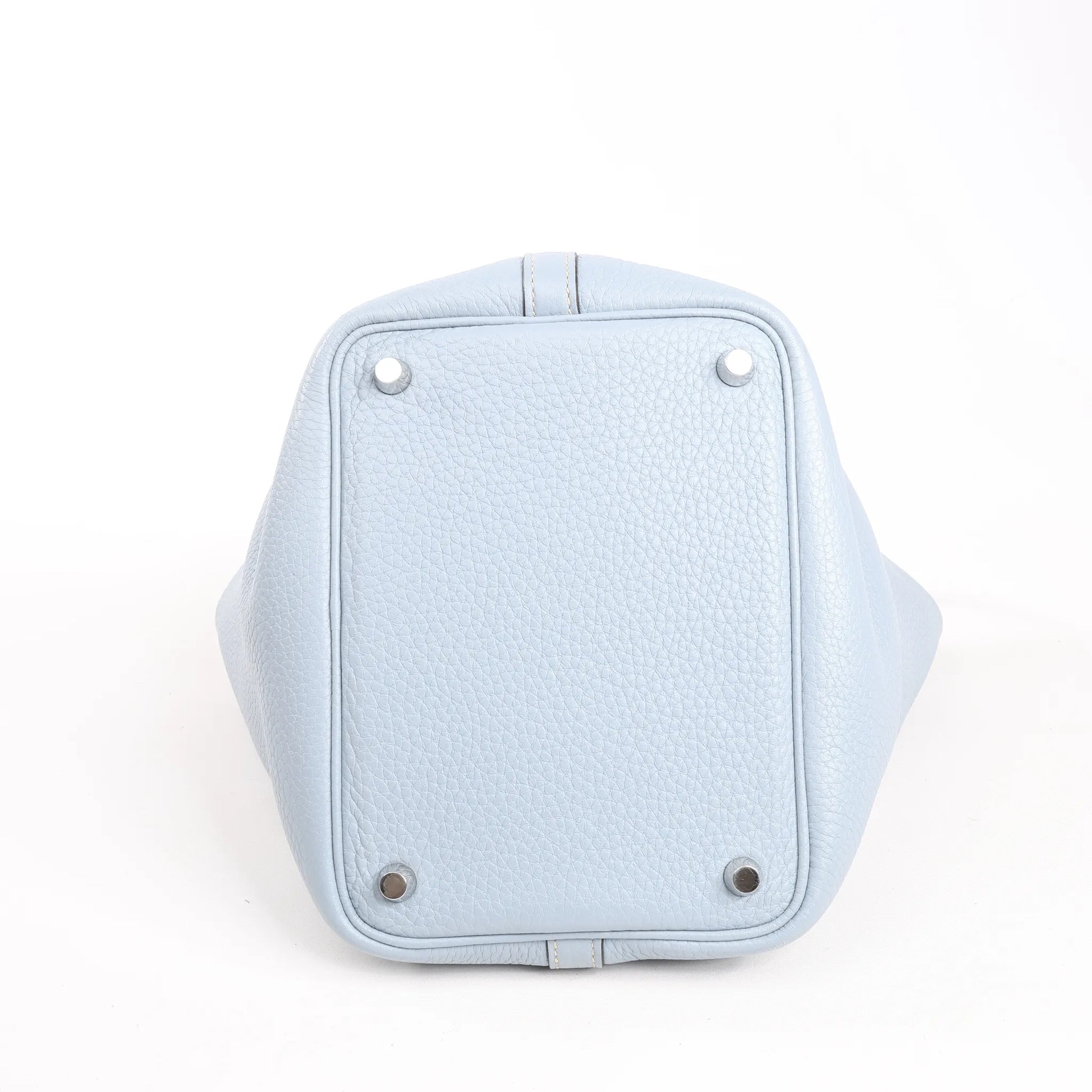 Elevate your everyday look with the HERMES Picotin Lock 18 PM in Taurillon Clemence leather. This 2013 □Q model in soft blue offers luxurious texture, minimalist charm, and iconic padlock detailing - perfect for refined casual elegance.