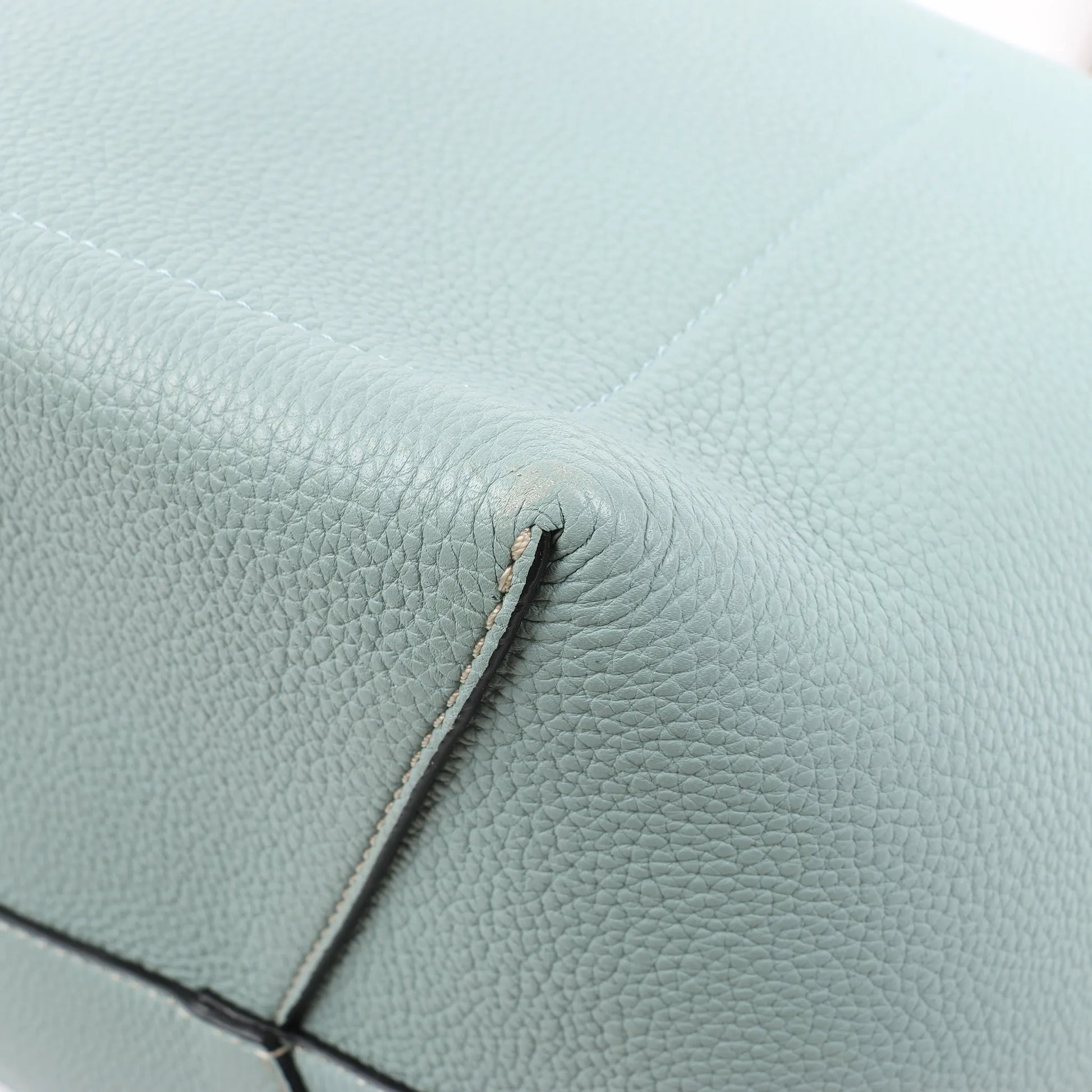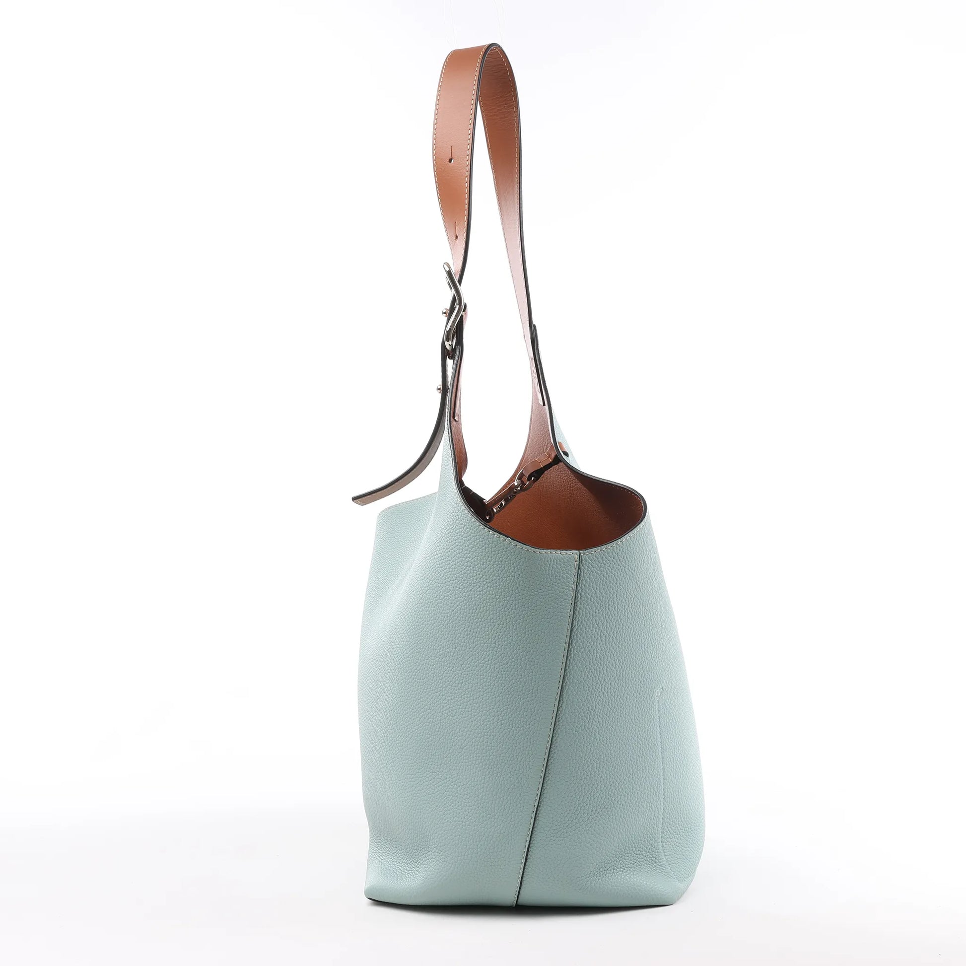The LOEWE Balloon Leather Shoulder Bag in Blue and Brown is a sculptural beauty crafted from smooth calfskin. With its soft blue body and contrasting tan strap and lining, this minimalist bucket bag exudes modern elegance and artisanal craftsmanship.