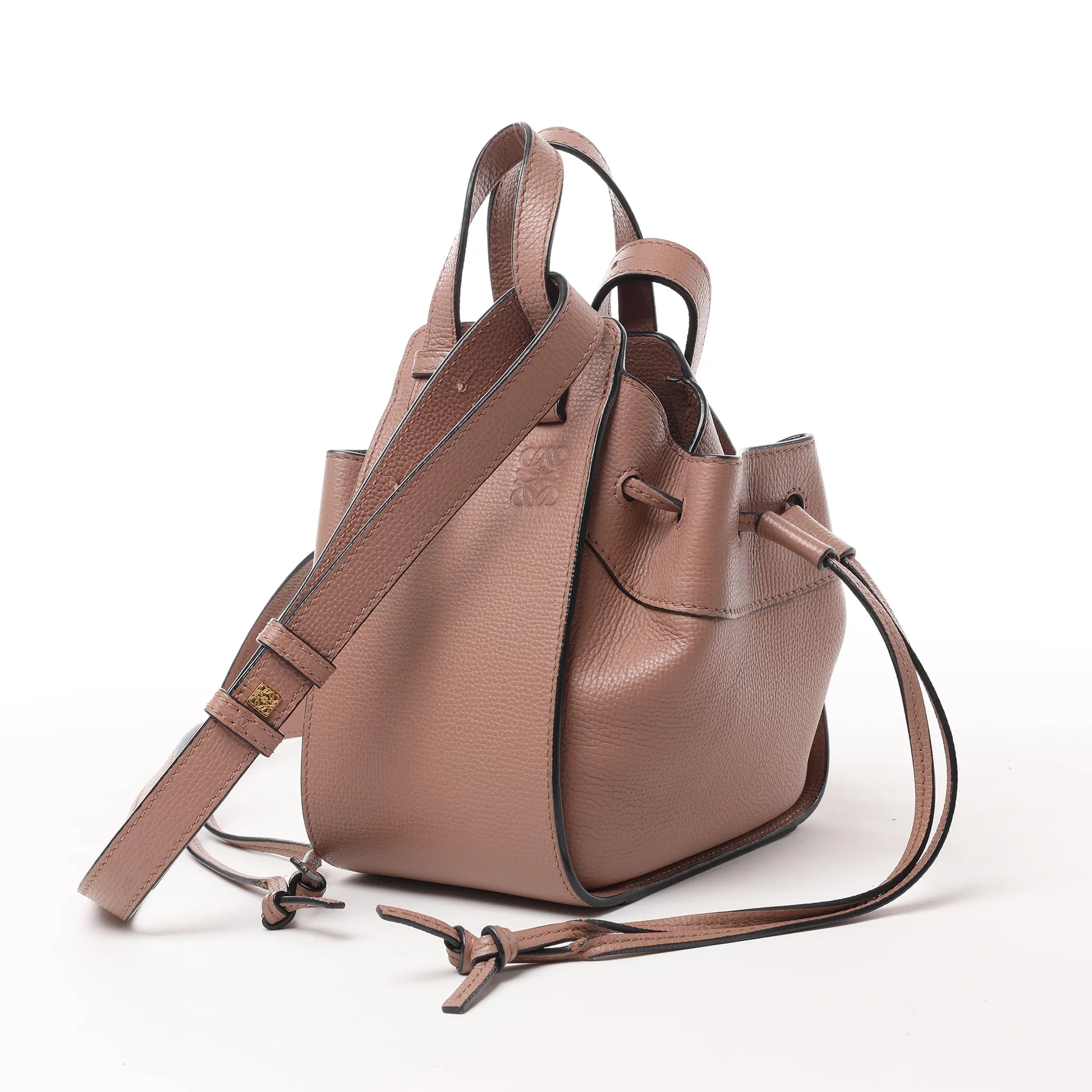 LOEWE Hammock Mini 2Way Handbag in dusty pink grained leather, featuring a versatile silhouette with expandable sides, top handles, and a detachable shoulder strap. A chic blend of form and function with signature Spanish craftsmanship.