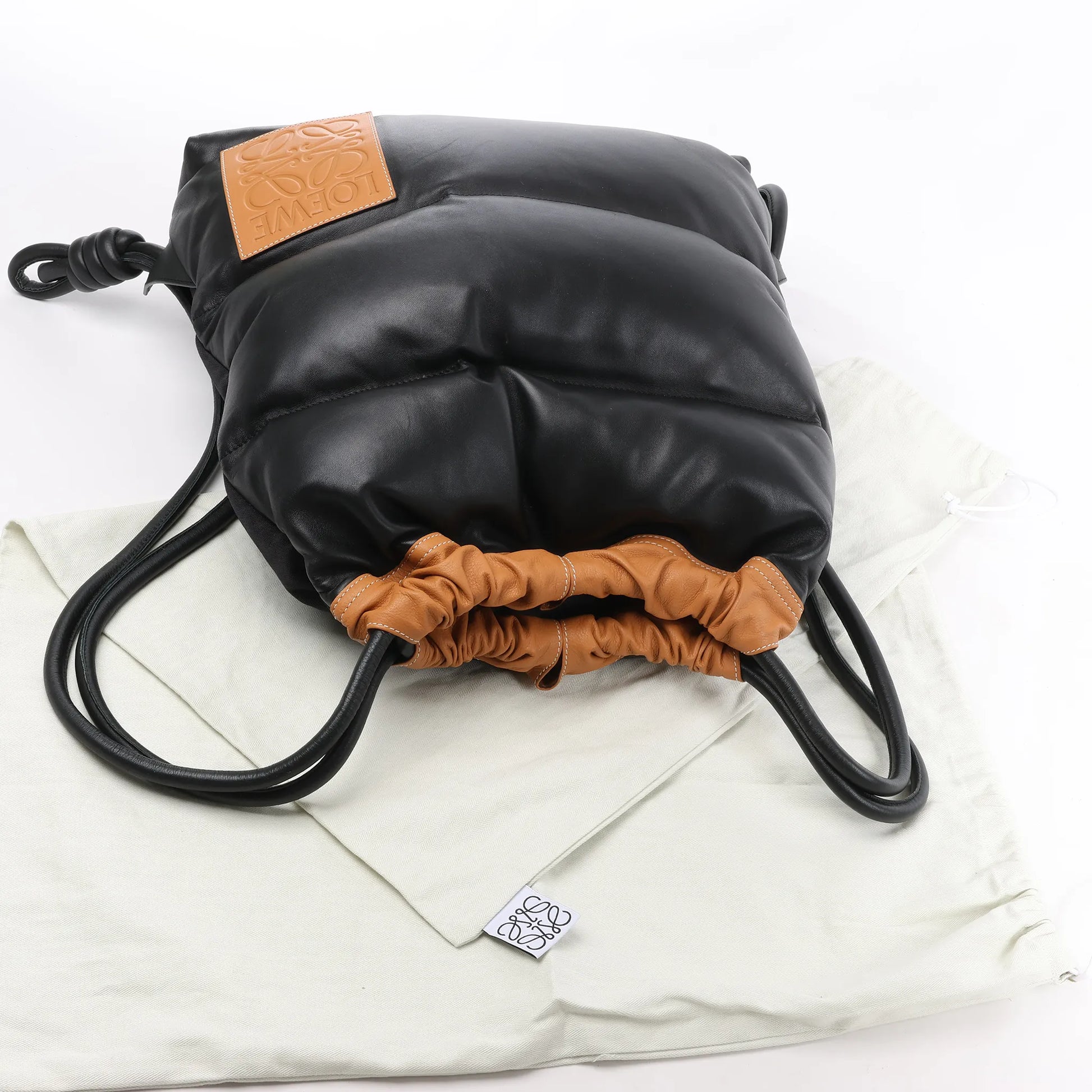The LOEWE Puffy Yago Backpack in Black and Brown combines fashion-forward design with plush practicality. Crafted from soft leather and durable nylon, this modern drawstring style features a padded silhouette and embossed logo patch for standout streetwear appeal.