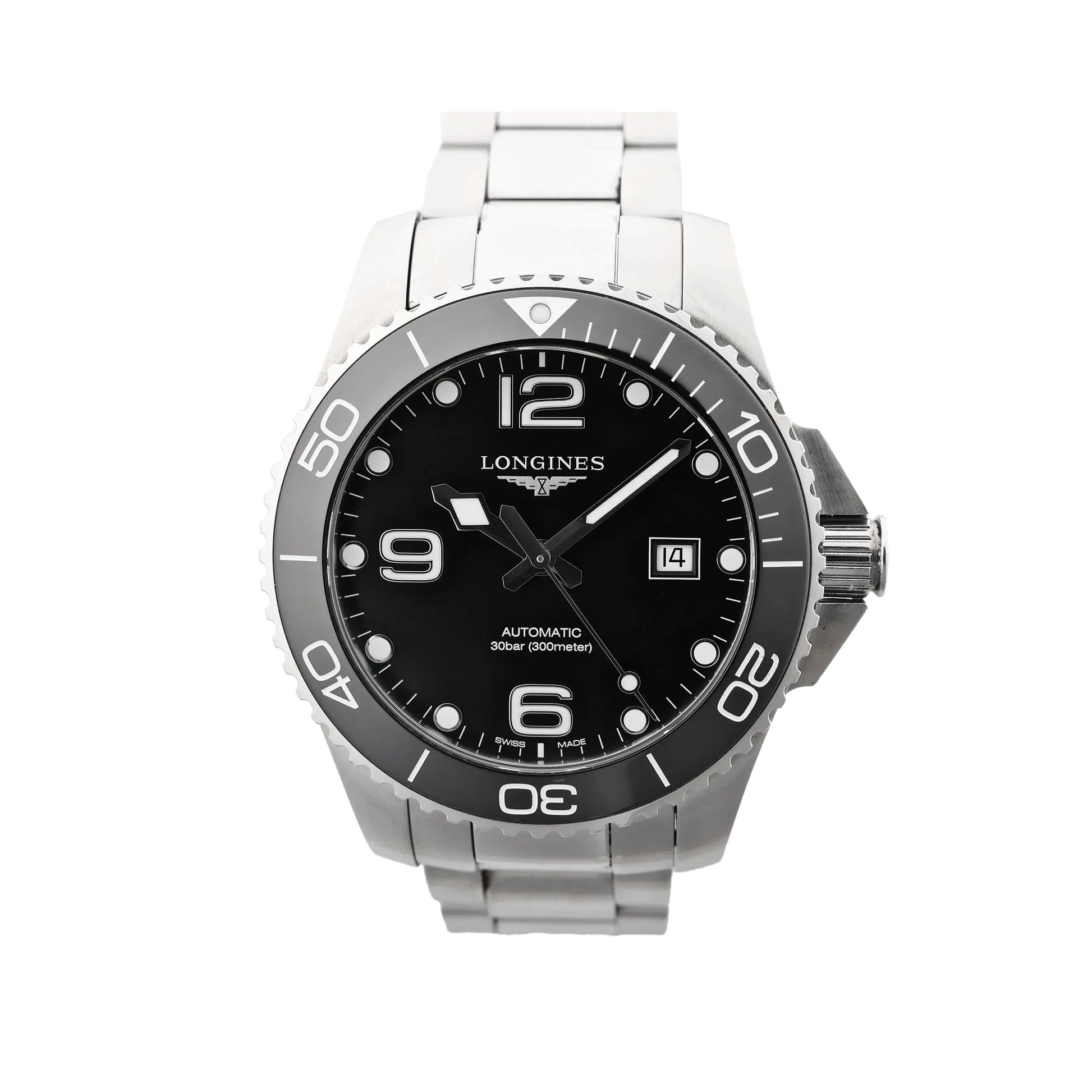 The Longines HydroConquest L3.782.4 is a robust automatic dive watch featuring a stainless steel case and bracelet, black dial, and 300m water resistance. Built for precision and performance, it's a perfect blend of sport and style.