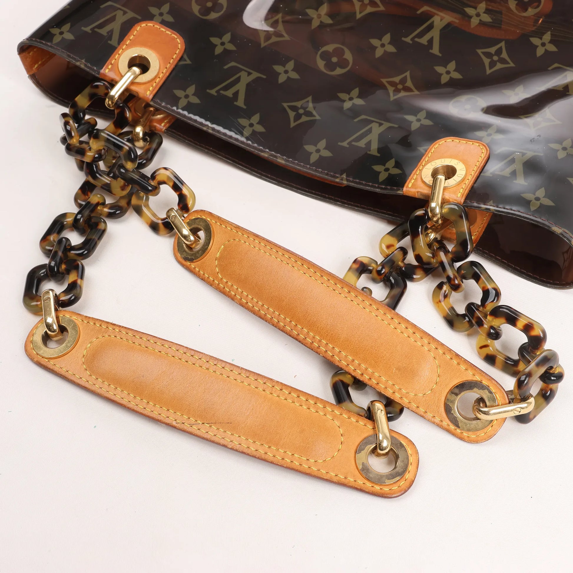 The Louis Vuitton Ambre MM Cabas Monogram in brown vinyl and leather offers a bold, transparent design with iconic monogram pattern and tortoiseshell chain handles—perfect for standout luxury.