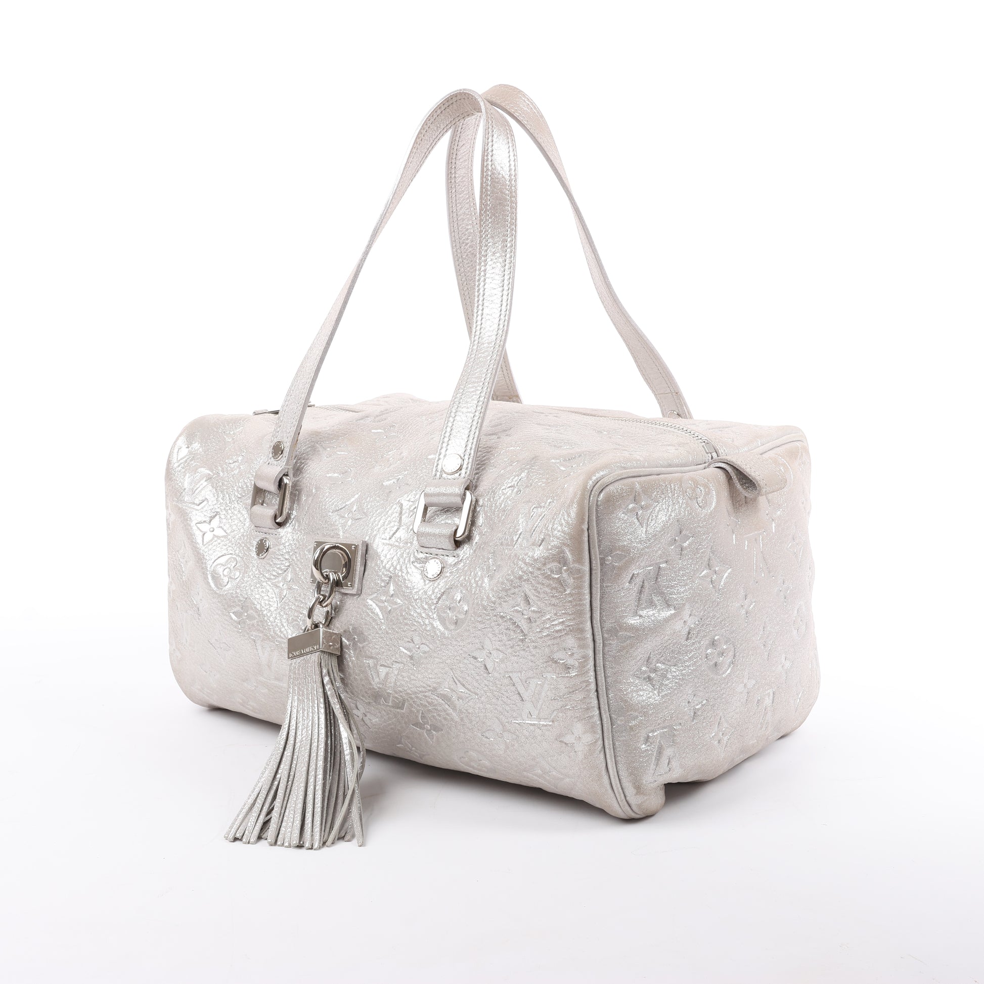 Shine bright with the Louis Vuitton Comète Limited Edition Shoulder Bag in shimmer silver Monogram leather, featuring a chic tassel accent and luxurious metallic finish for standout sophistication.