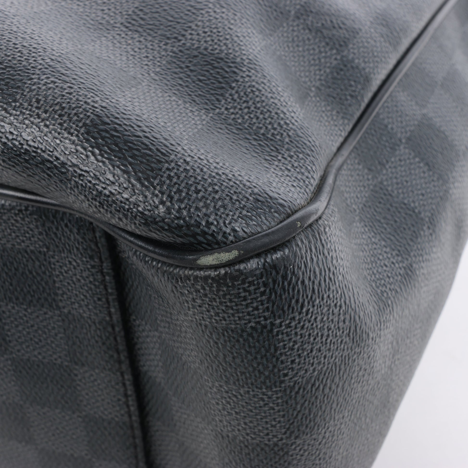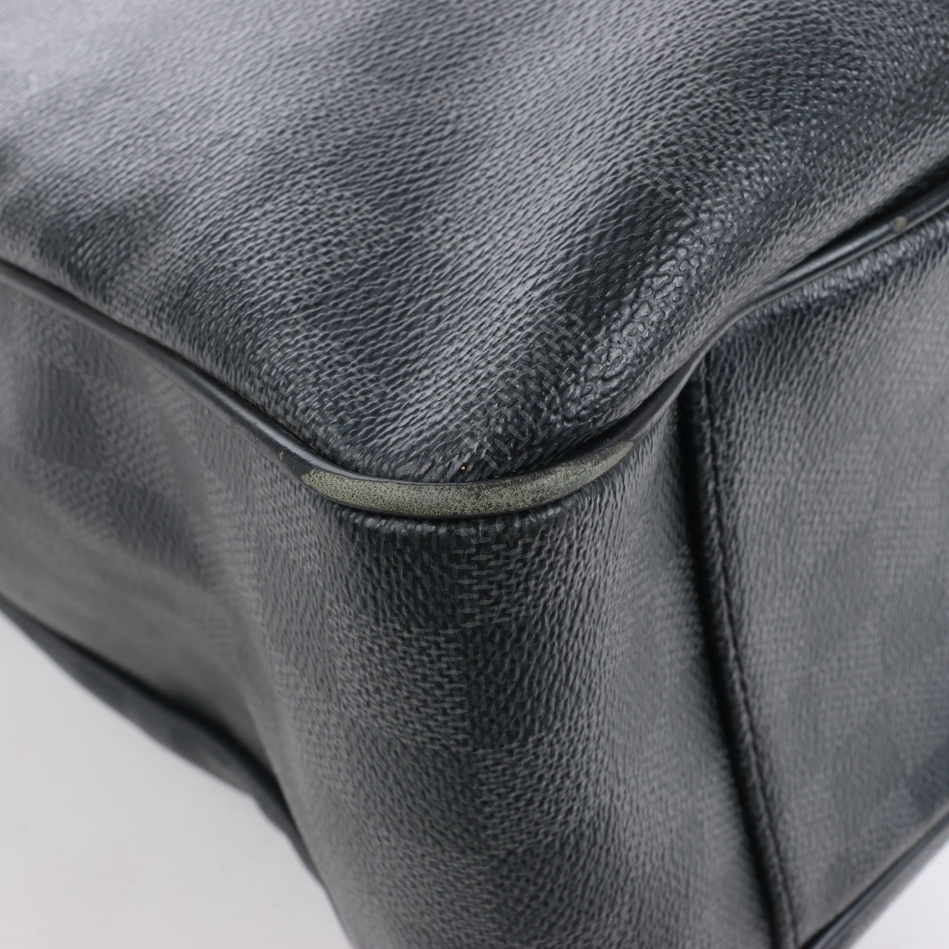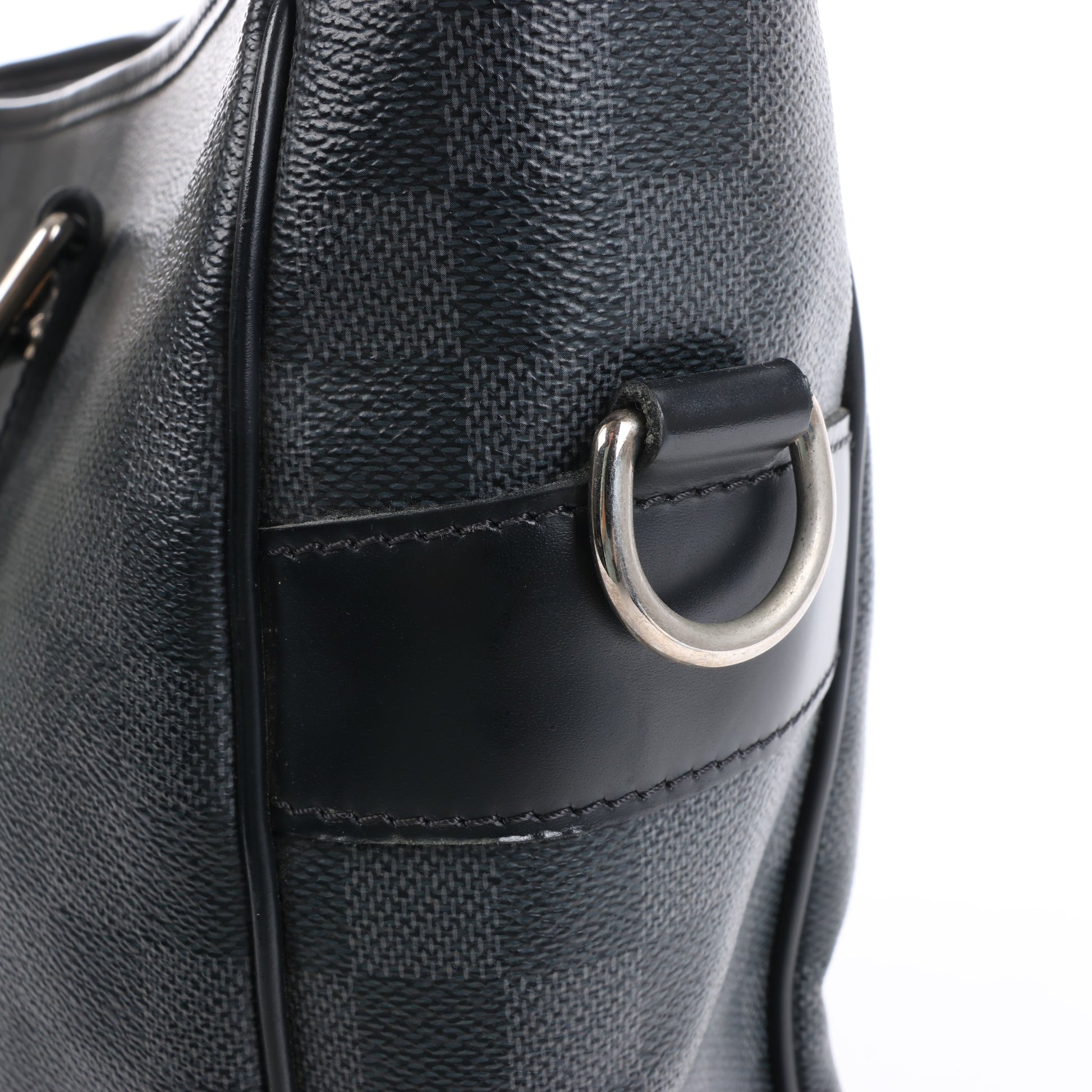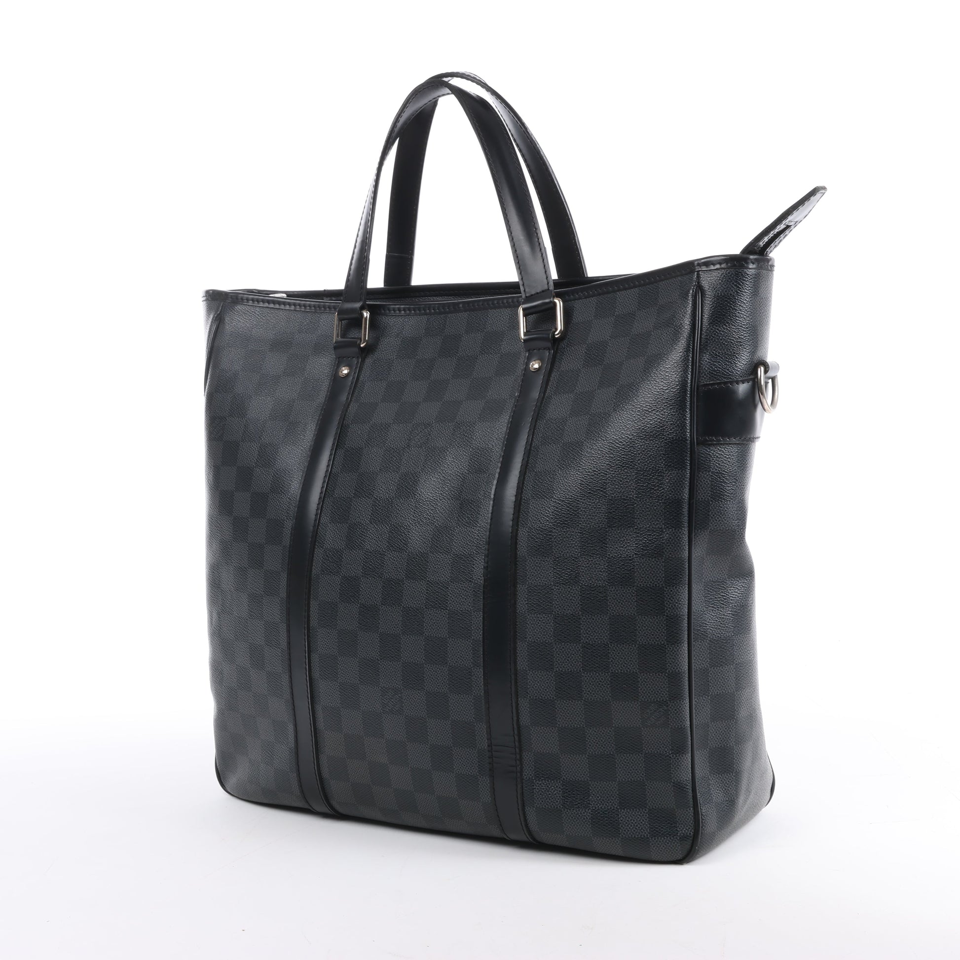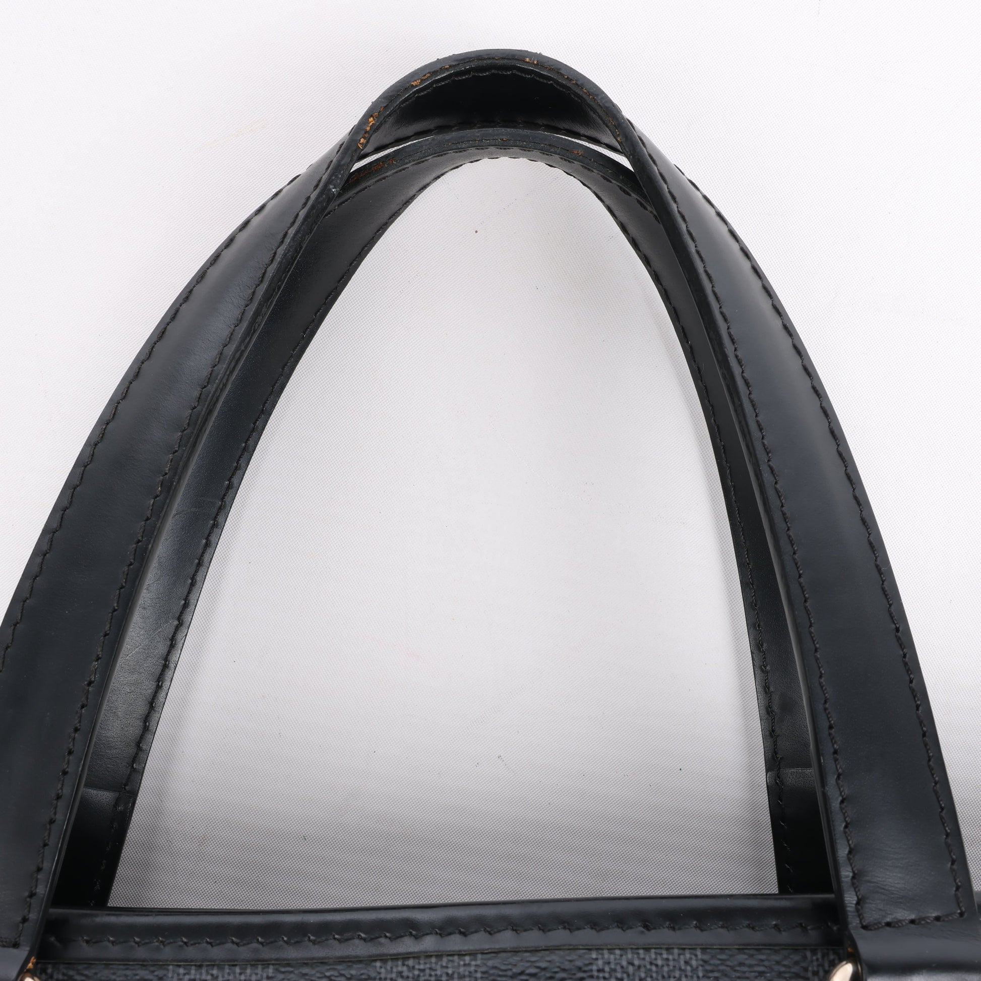 A sleek and versatile tote in Damier Graphite canvas with black leather trim. Features rolled leather handles, adjustable/removable shoulder strap, silver-tone hardware, and a spacious open interior with multiple pockets for organization. Perfect for business or travel.