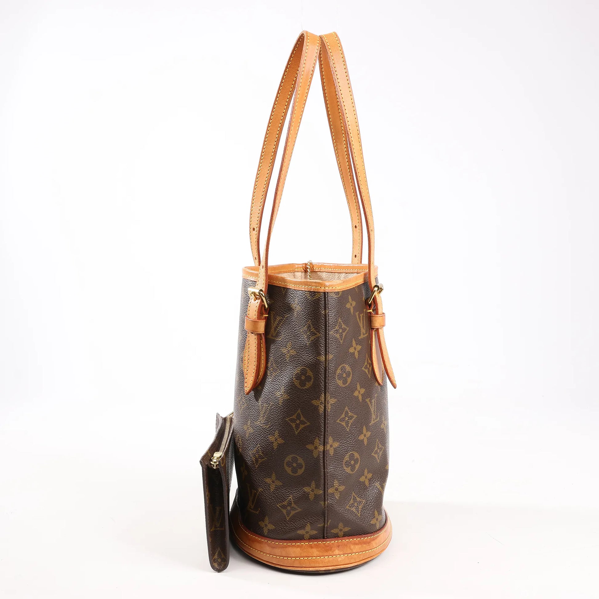 The Louis Vuitton Monogram Canvas Bucket PM M42238 in brown features the iconic coated canvas, natural cowhide trim, and a practical shoulder-carry design - perfect for timeless everyday elegance.