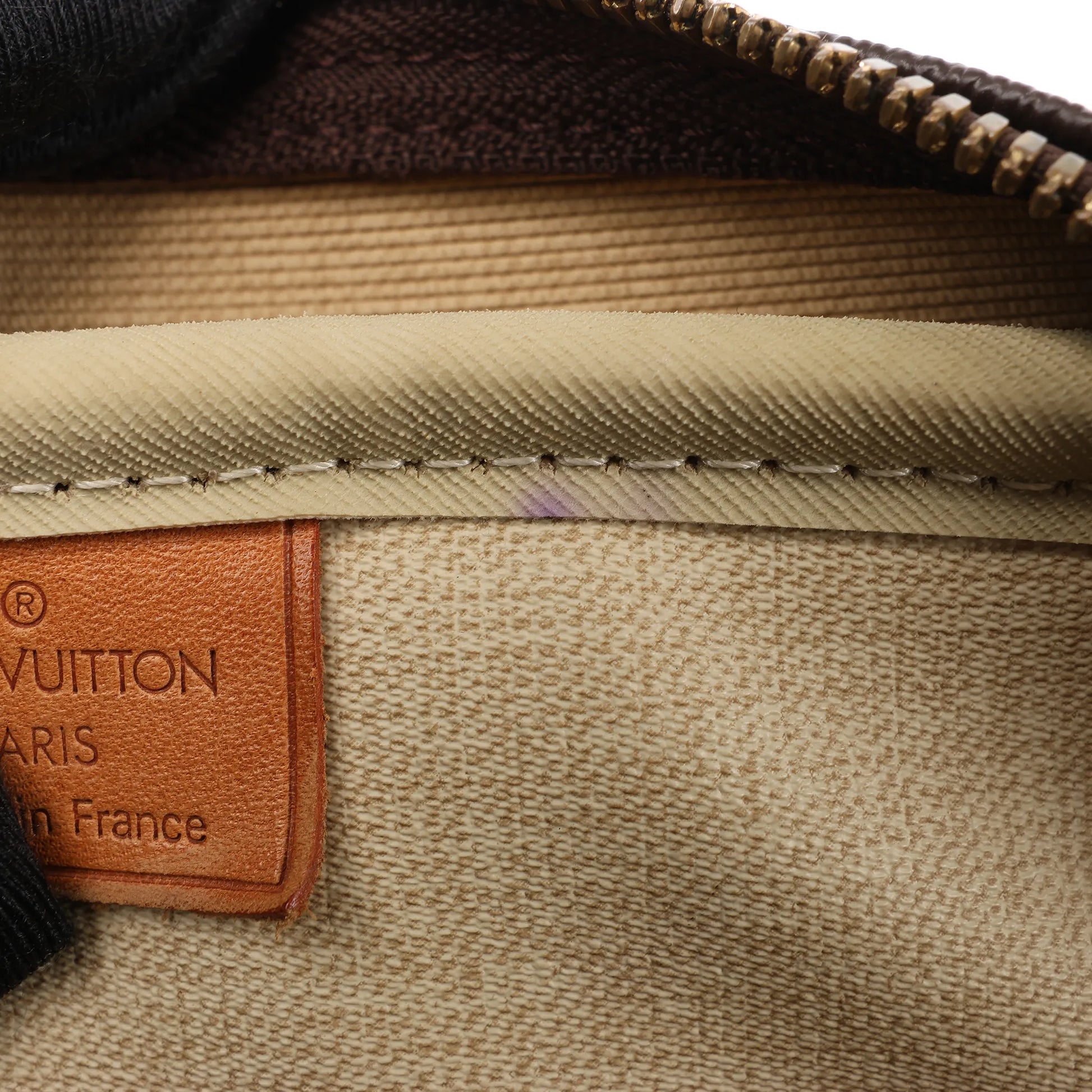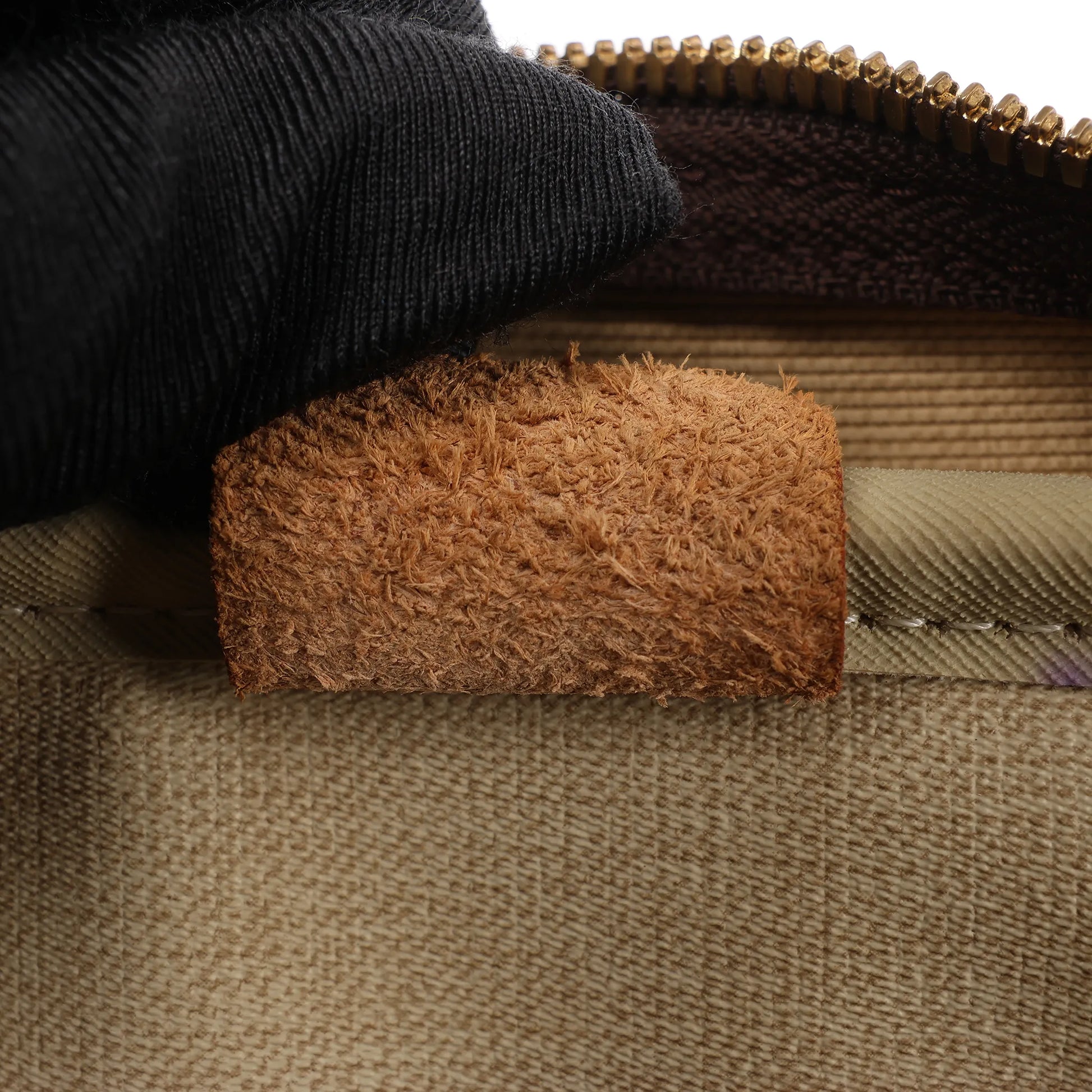Condition Details: The exterior canvas is clean and beautiful. Vachetta leather has developed honey patina in great shape, but with water stains and rubbings. The leather handles are firm and in great condition. The hardware has hairline scratches, has darkened. The interior is in good condition. Date code: unclear.