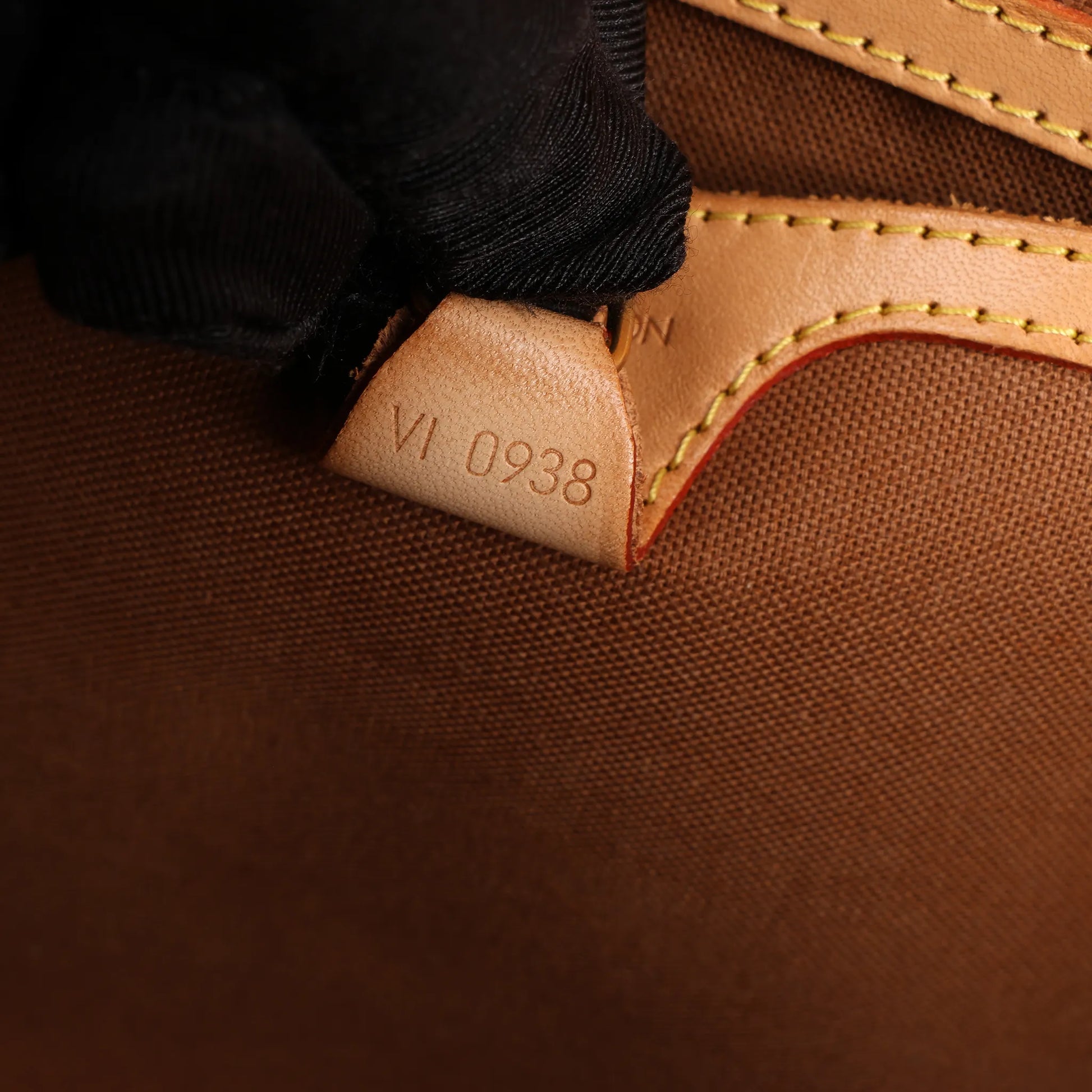 Condition Details: The outer canvas is clean and beautiful in excellent condition. The leather handles and lining are clean and in great condition, but developed dark honey patina and has rubbings. The gold hardware is crisp, but has darkened. The inner lining is clean and in very good condition, but has some dot stains. Widest part is 42 cm. Date code: VI0938