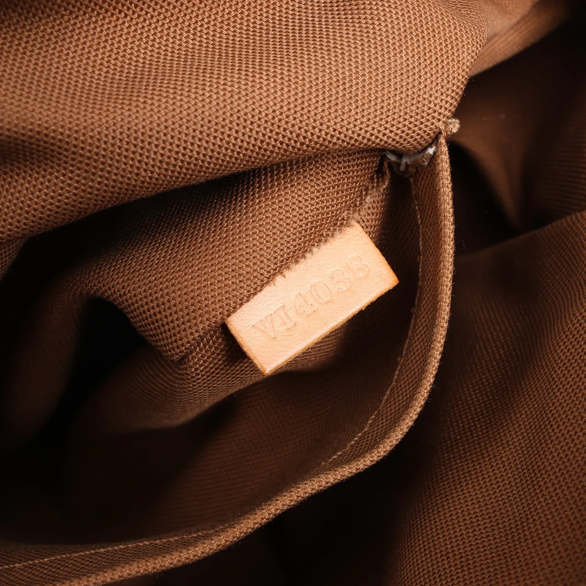 Condition Details: The exterior coated canvas is in excellent condition. The leather trim and handles developed dark honey patina, also has rubbings and creases. The hardware is still bright and crisp with scratches, zipper lost it gold shine. The interior is in good condition, but has some dust. The widest part is 36 cm. Date code: VI4038