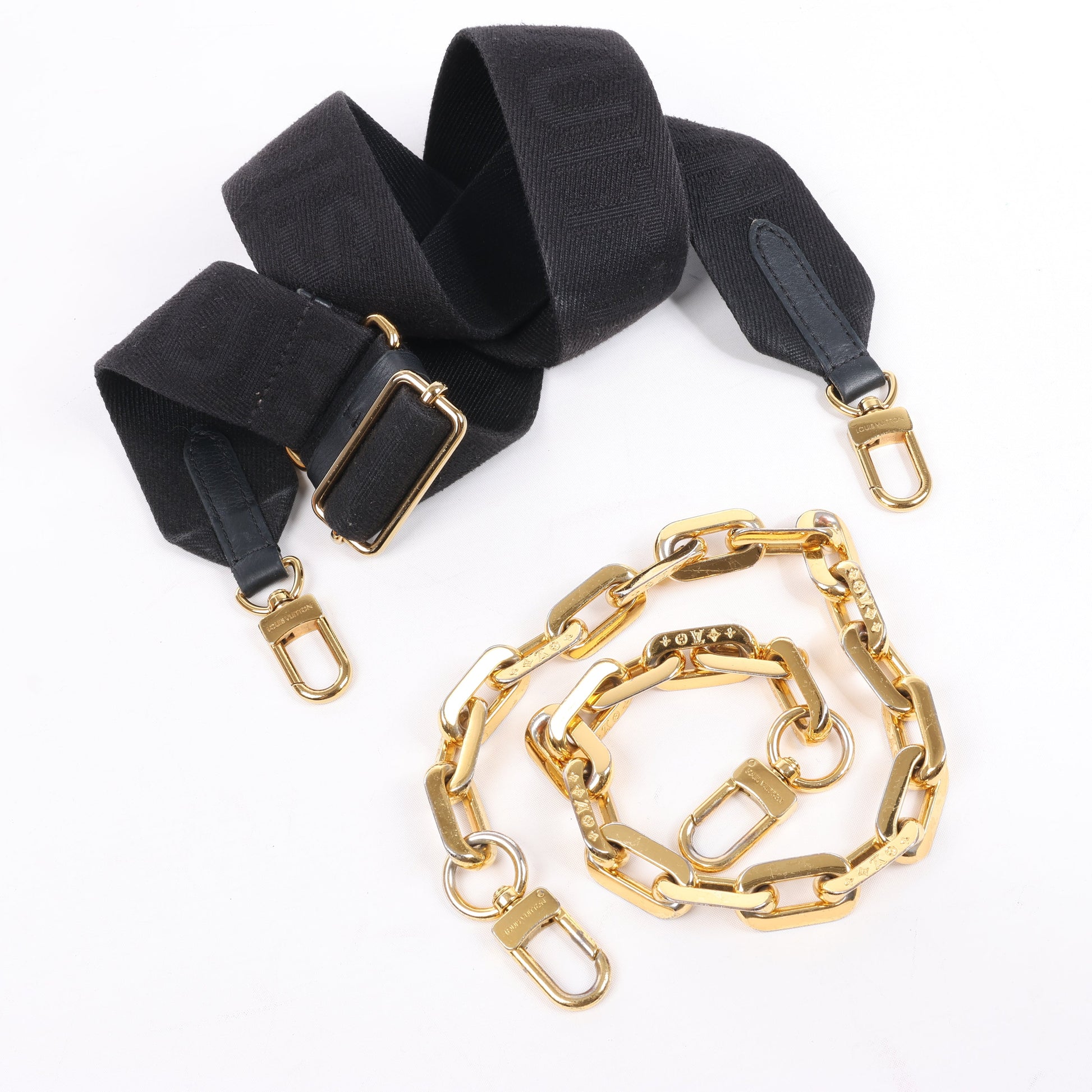 Louis Vuitton Coussin PM in black embossed Monogram leather, featuring a bold gold chain and adjustable shoulder strap. Chic and edgy, this versatile 2-way bag adds modern sophistication to any ensemble.