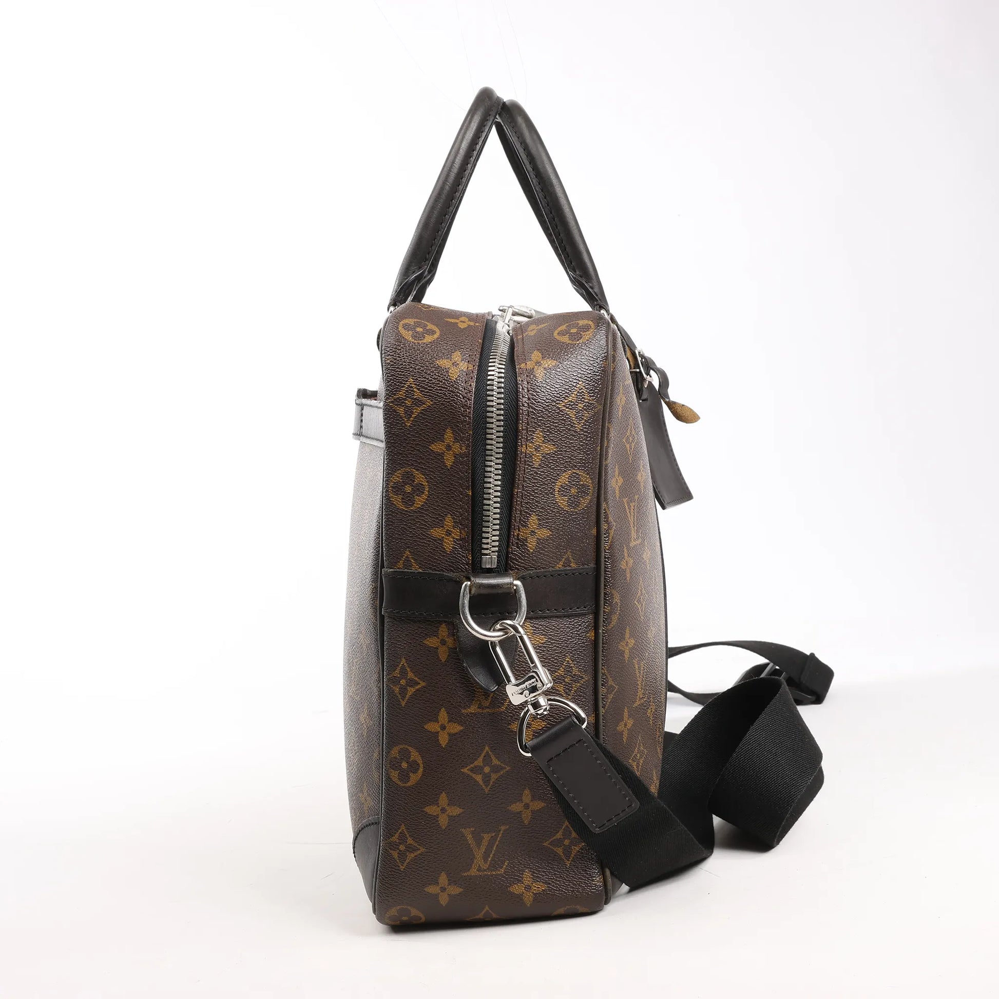 The Louis Vuitton Monogram Macassar Porte-Documents Voyages M40224 blends classic monogram canvas with sleek black leather trim, ideal for business or travel. Durable, stylish, and spacious—this luxury briefcase keeps you organized on the go.