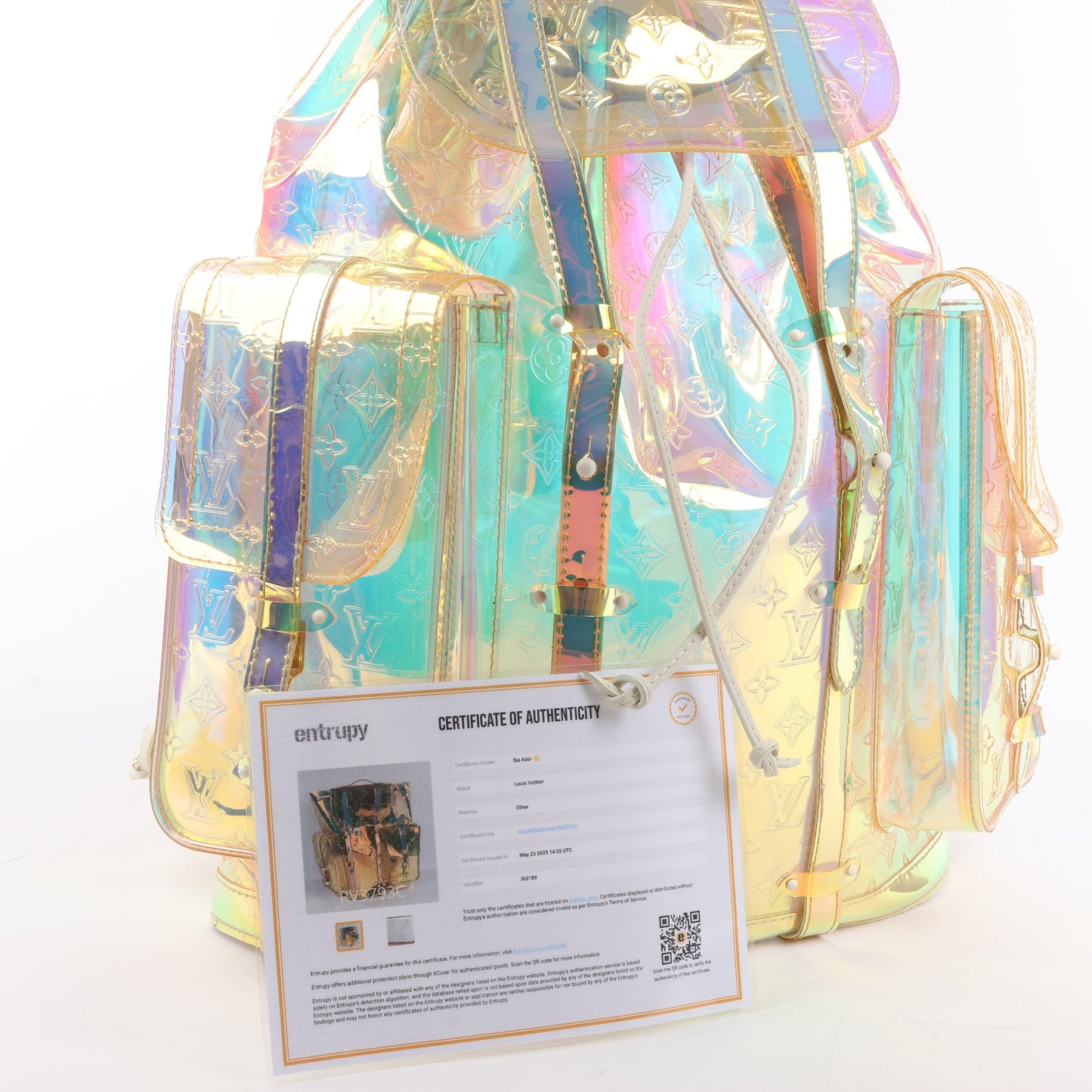 Louis Vuitton Monogram Prism Christopher GM Backpack in iridescent PVC with iconic monogram embossing. A futuristic, statement-making design combining luxury and innovation with spacious, functional style. Model M44766.