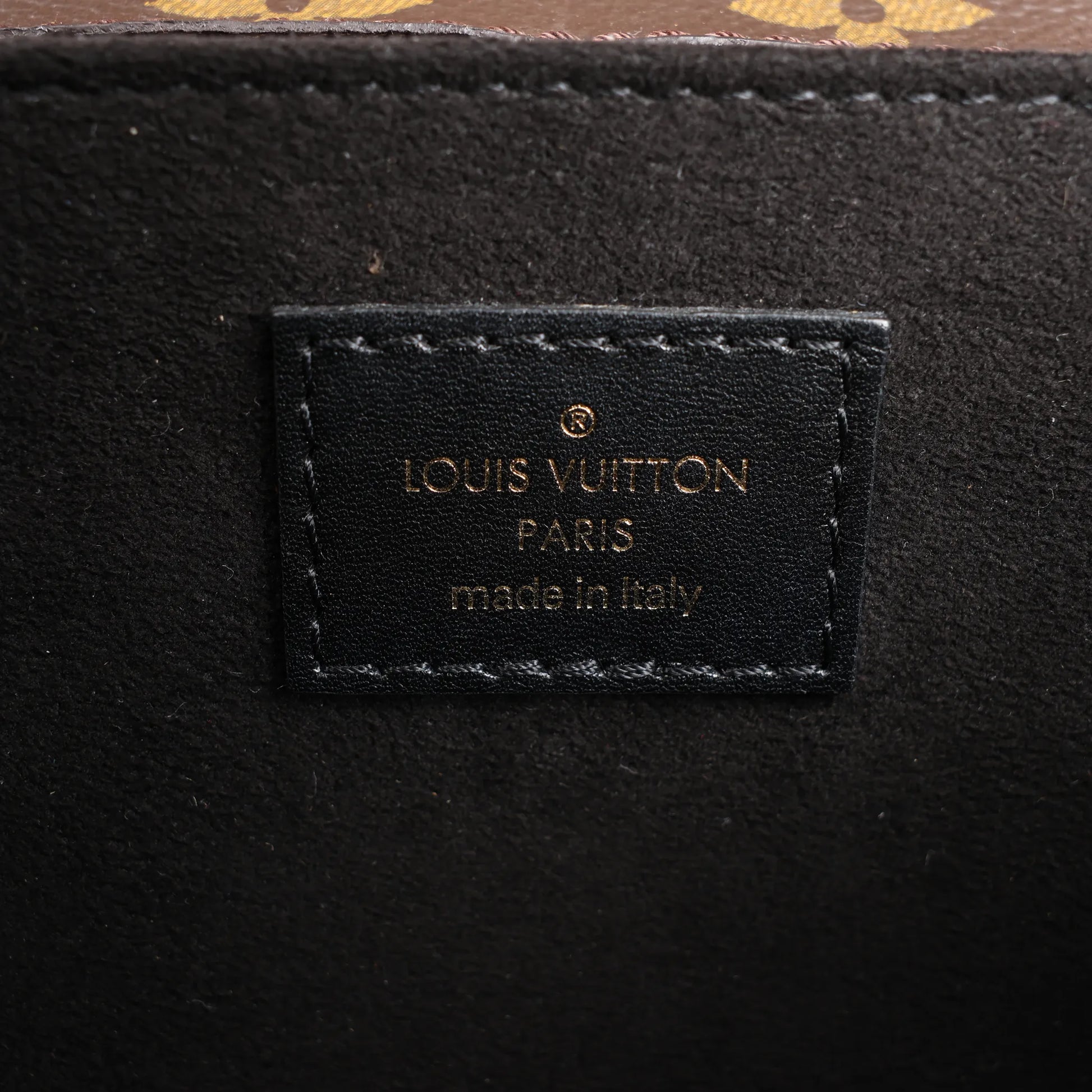 The Louis Vuitton Pochette Metis MM M43488 blends classic monogram canvas with bold reverse and black leather accents. This versatile 2-way handbag features a gold-tone S-lock and chain detail, perfect for elevating any day-to-night ensemble.