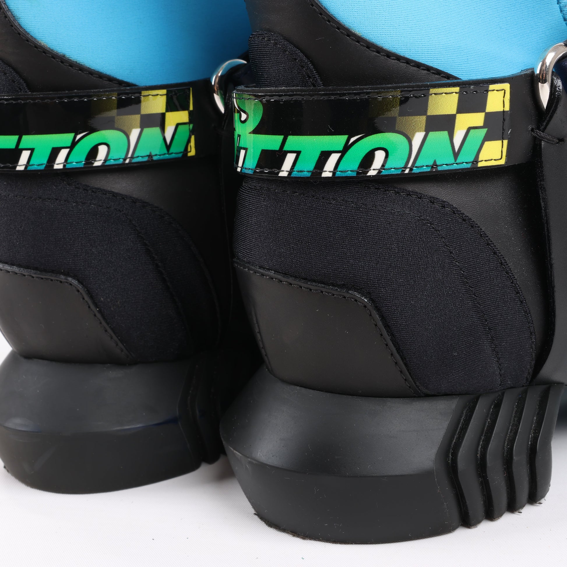 Louis Vuitton Neoprene Deep Sea Ankle Boot in Blue, Size 39 EU, features a bold design with blue and white neoprene panels, a navy leather strap, and a geometric block heel. Accented with vibrant graphics at the back, this statement piece combines sporty elegance with modern style.
