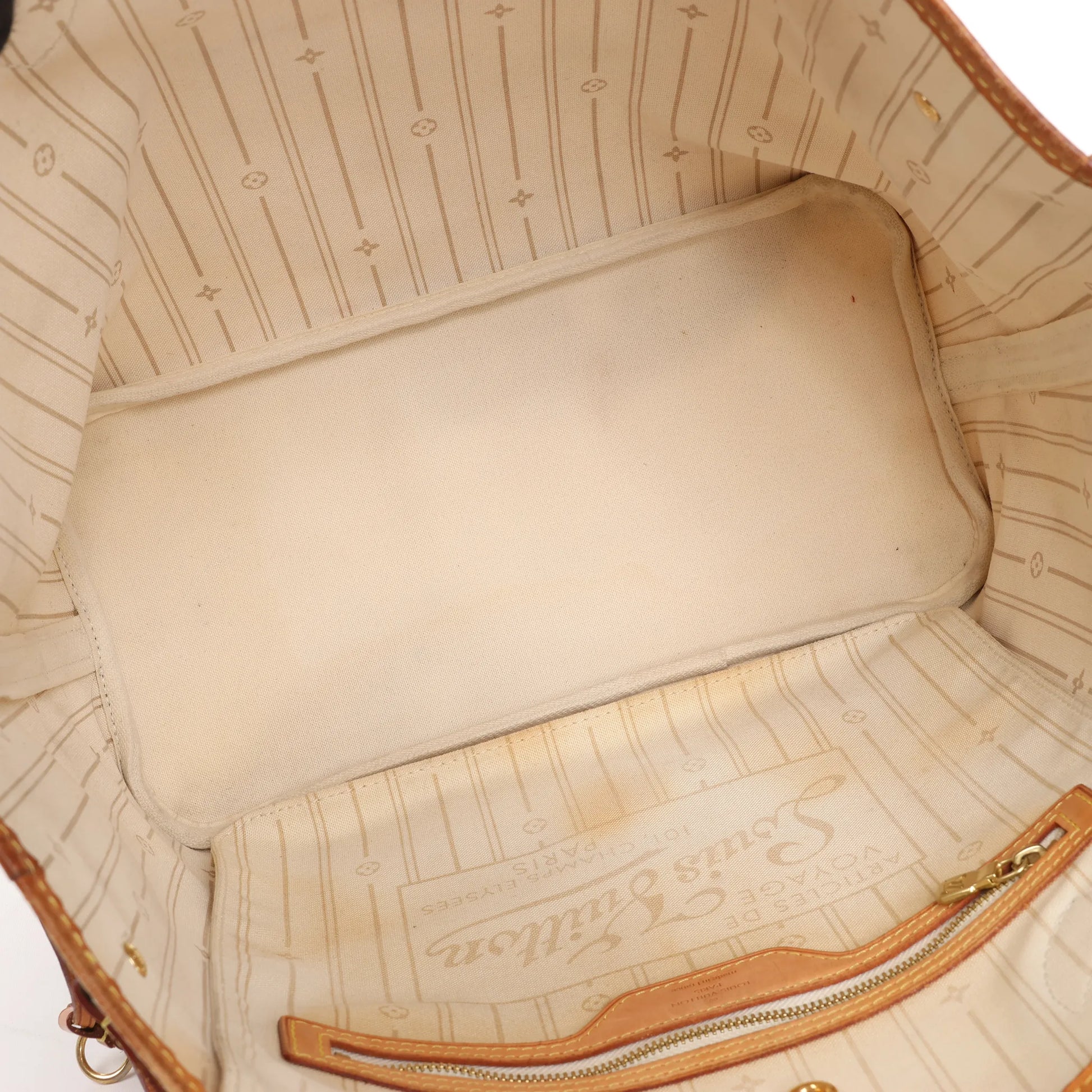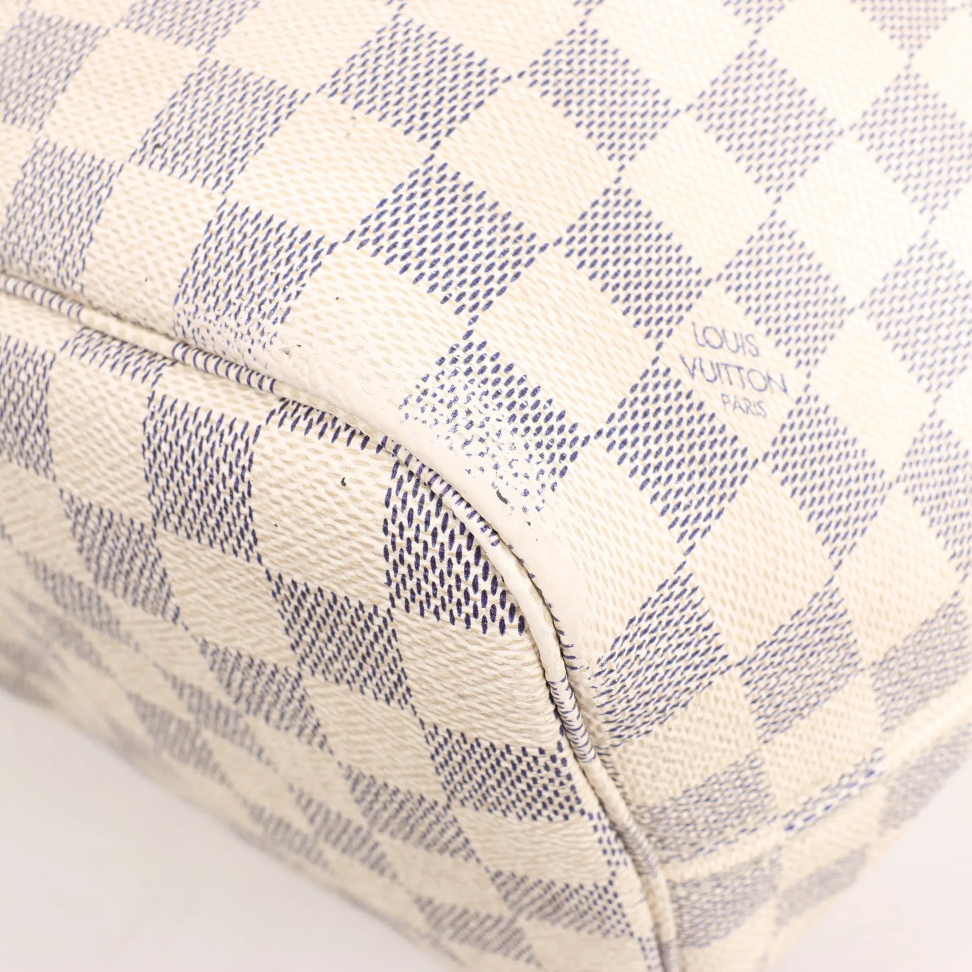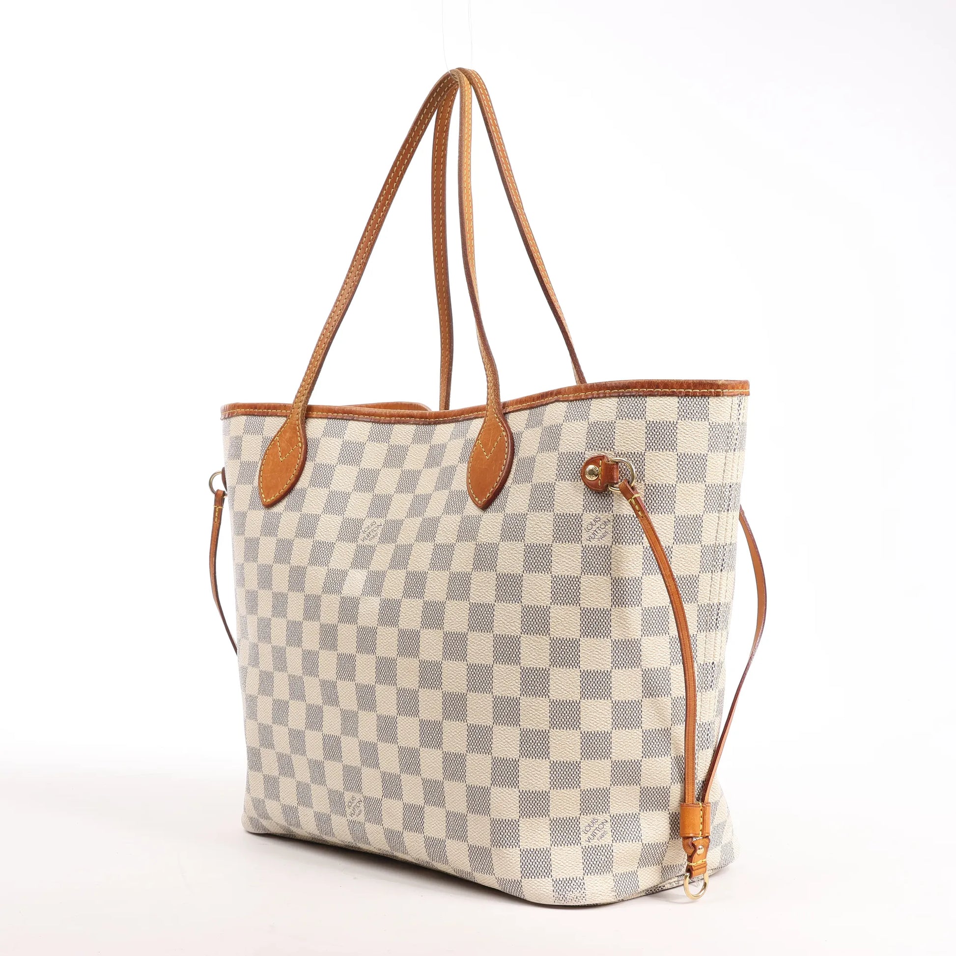 The Louis Vuitton Neverfull MM in Damier Azur Canvas blends timeless elegance with everyday versatility. Featuring natural cowhide leather trim, side drawstring details, and spacious interior, this beige tote is perfect for both casual and sophisticated looks.