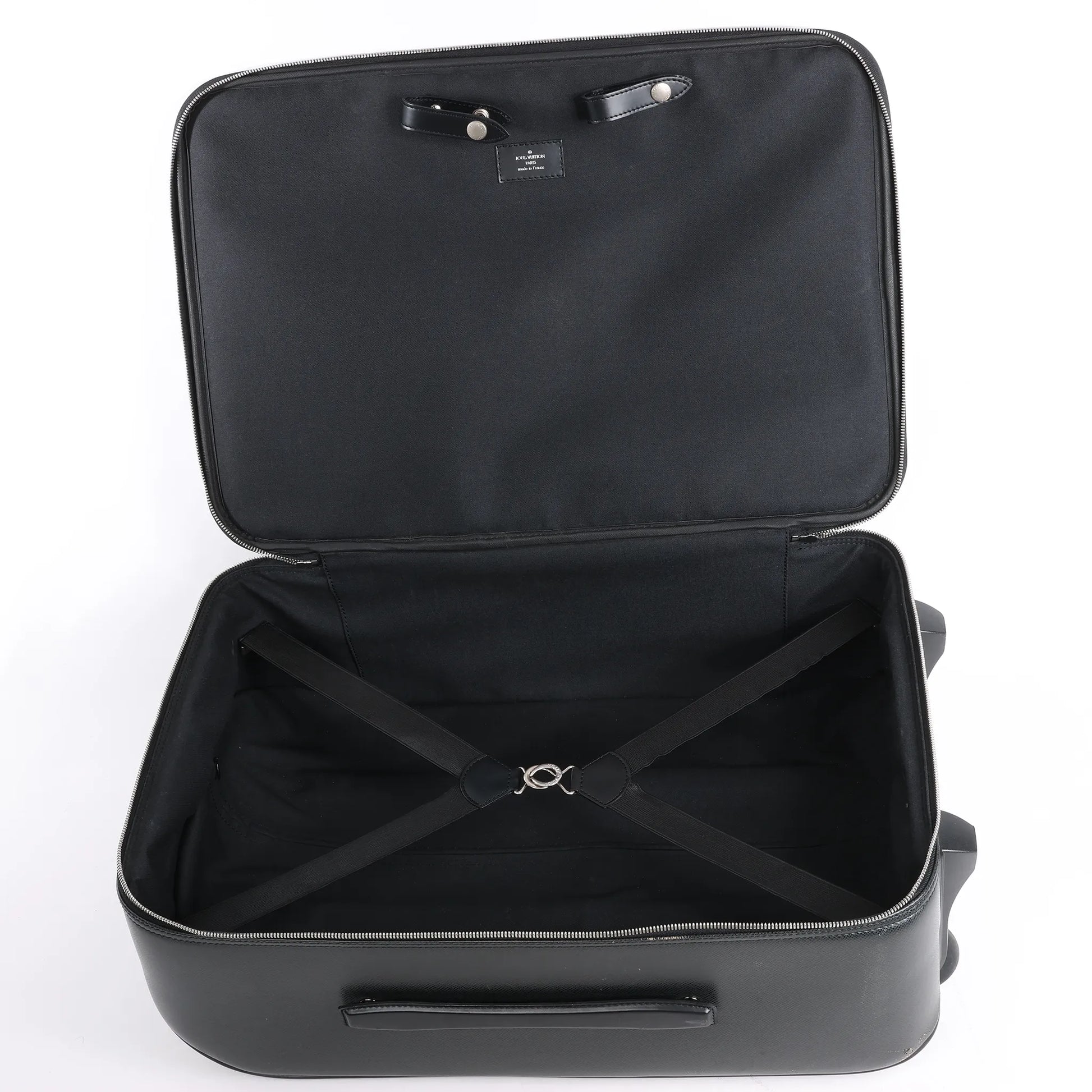 Travel in refined elegance with the Louis Vuitton Pegase 55 Taiga Suitcase M23312. Made from luxurious black Taiga leather, this cabin-size rolling bag combines functionality and sophistication with its sleek design, telescopic handle, and spacious interior.