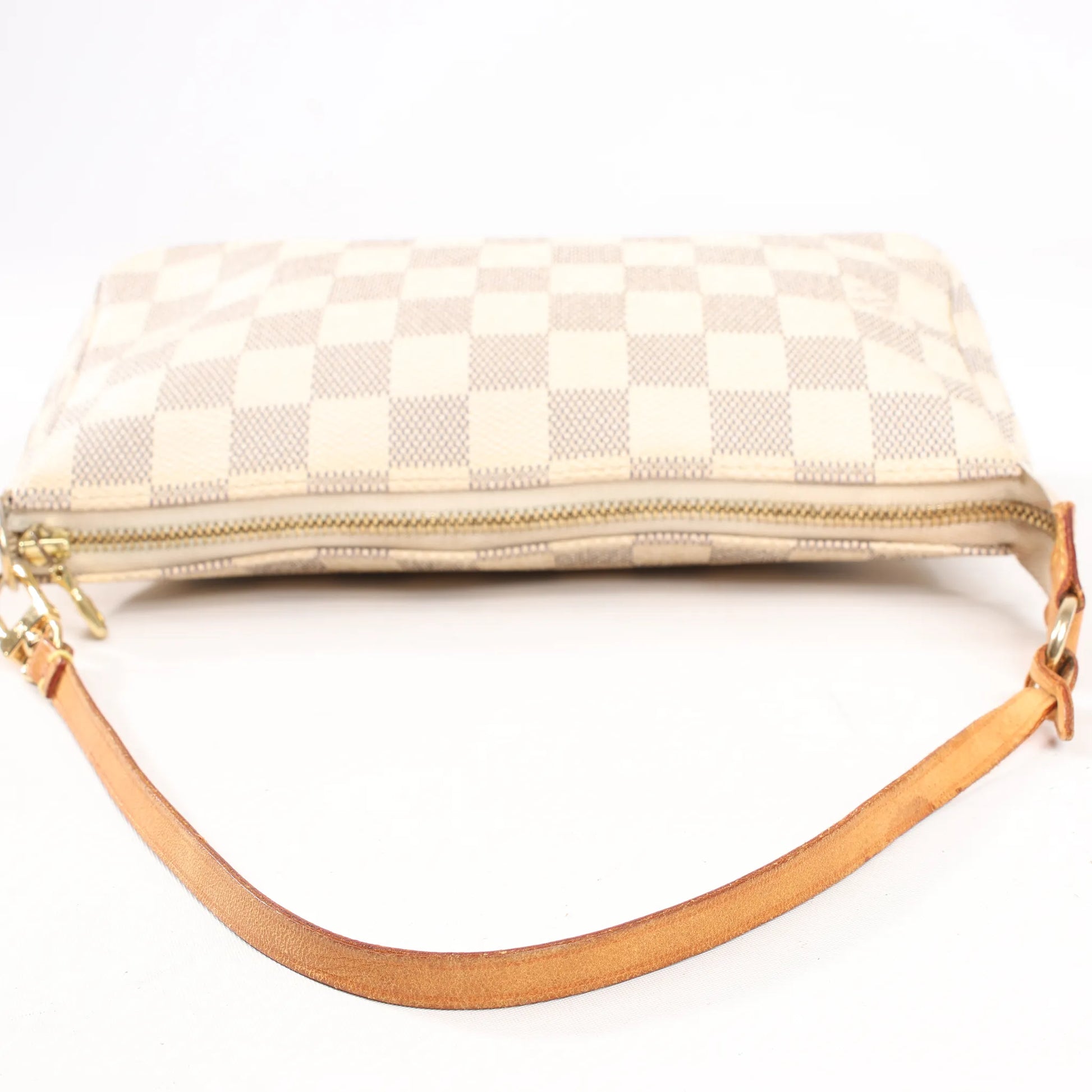 Chic and versatile, the Louis Vuitton Pochette Accessoires N41207 in Damier Azur canvas features a beige checkerboard design, natural leather strap, and gold-tone hardware - perfect for everyday elegance.