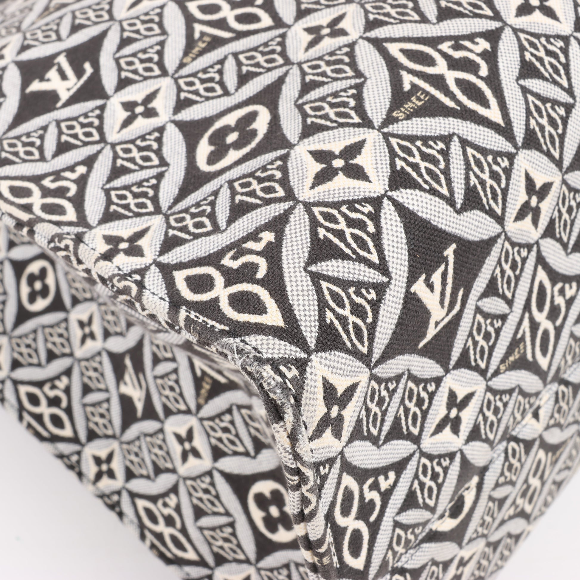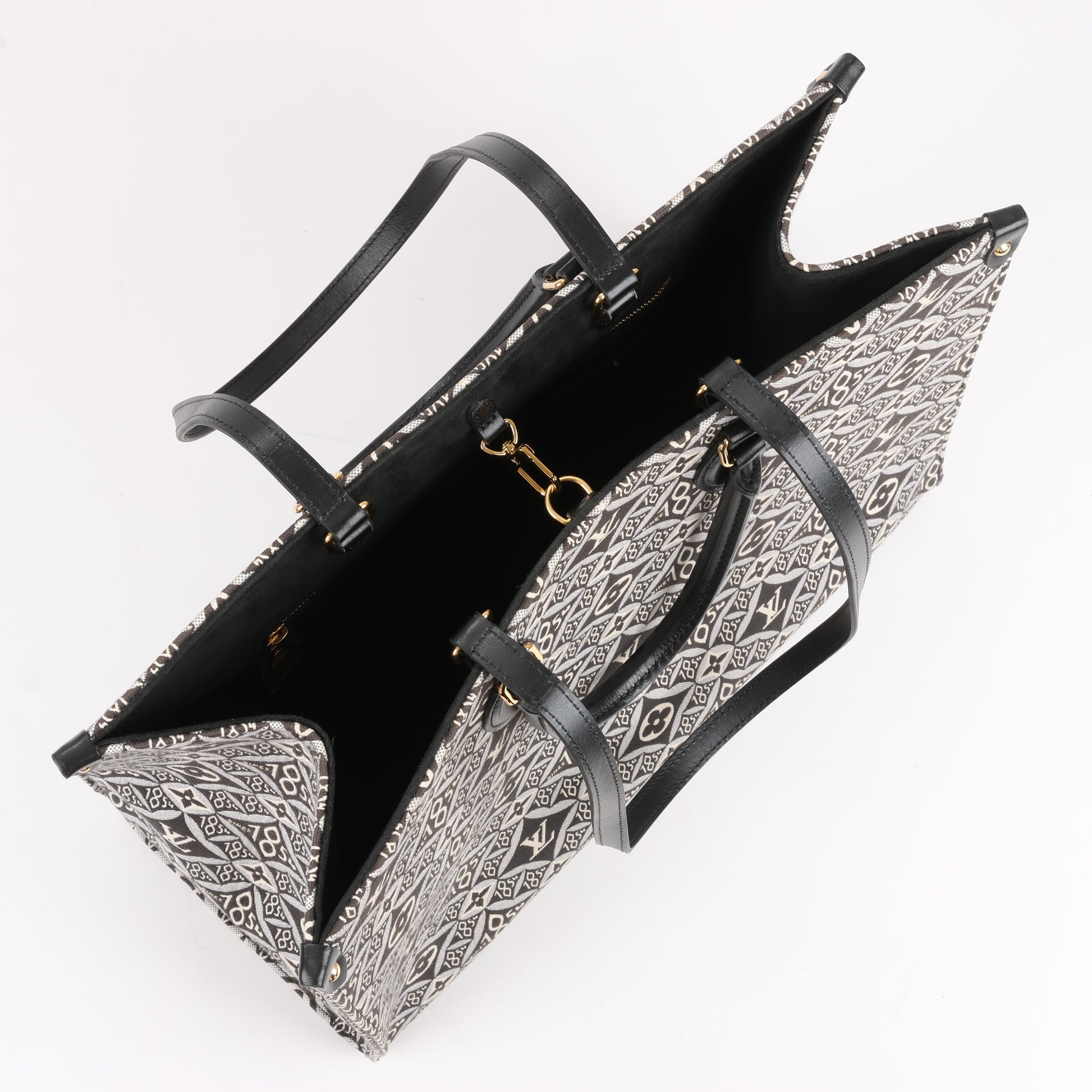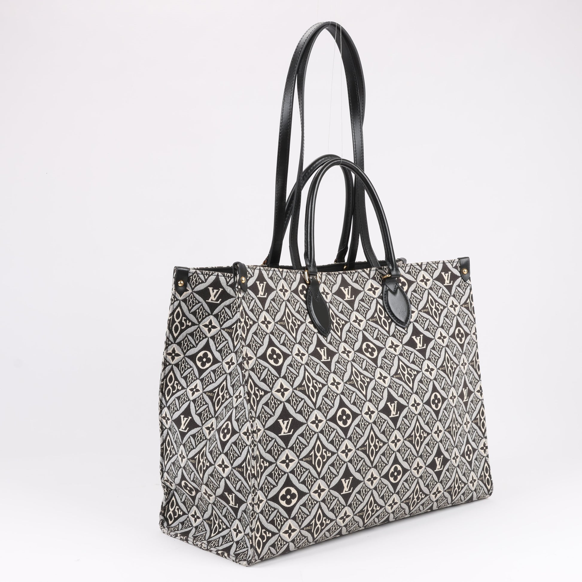 Louis Vuitton Since 1854 OnTheGo GM handbag M57207 in black and white. This spacious tote features the Since 1854 jacquard textile with Monogram and heritage-inspired motifs, complemented by black leather handles. A stylish and functional statement piece for everyday elegance.