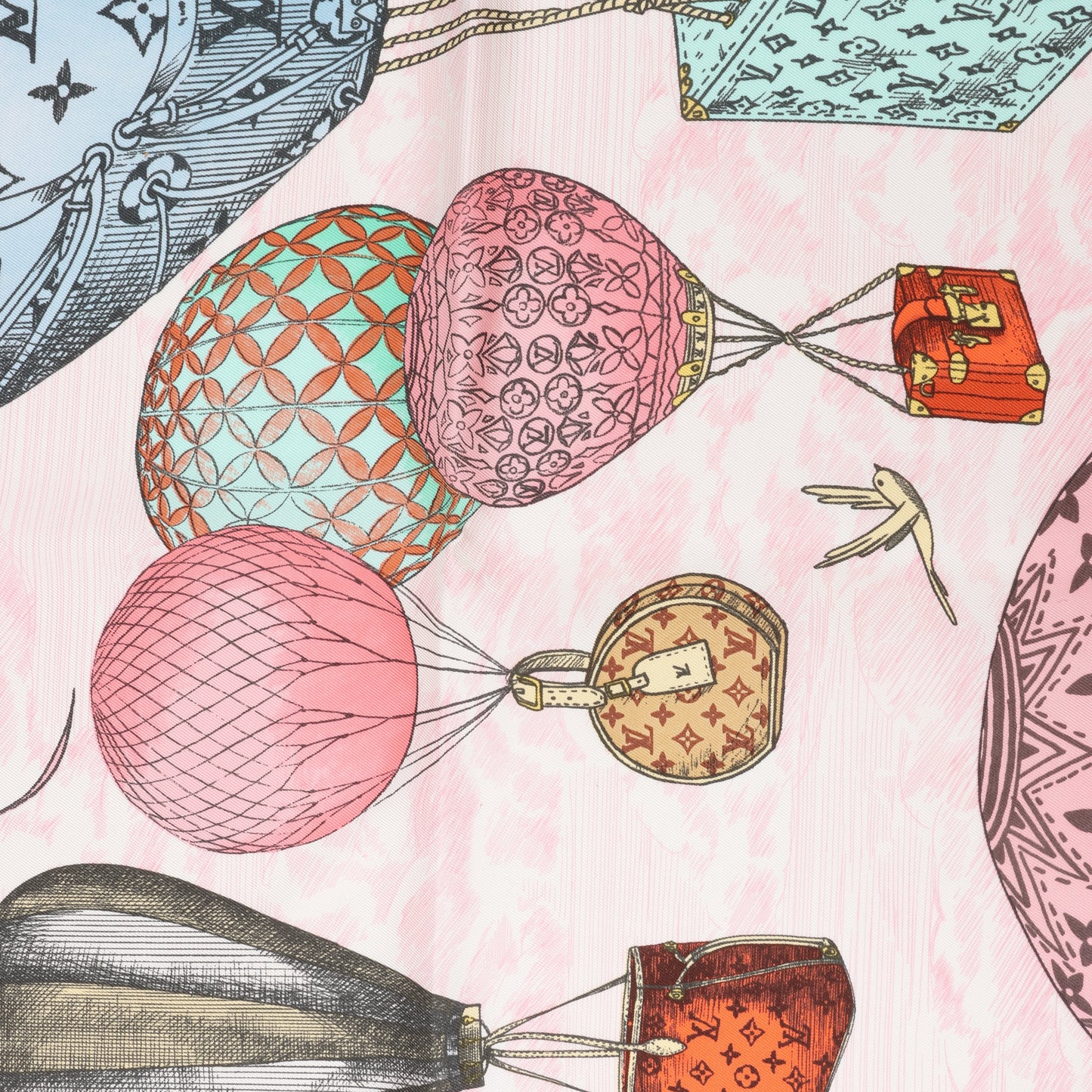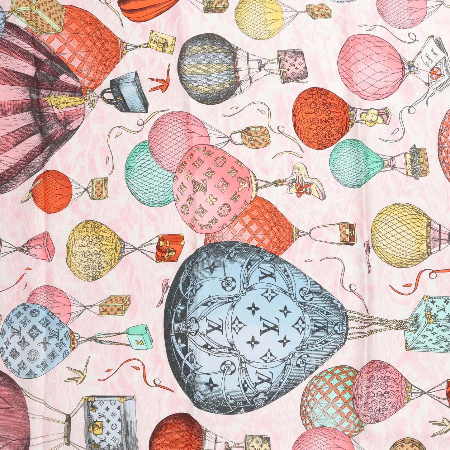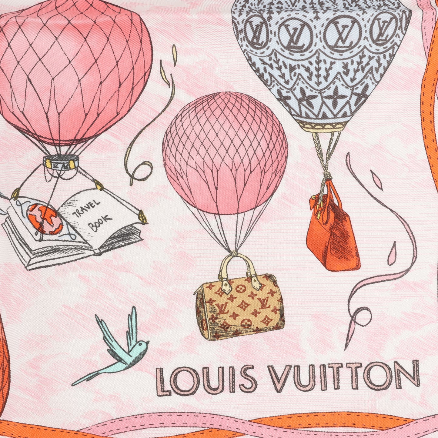 The Louis Vuitton "Up and Away" M77661 silk scarf is a dreamy celebration of travel. Featuring pastel-hued hot air balloons adorned with the iconic LV monogram, this 100% silk piece in soft pink exudes elegance and whimsy. A collector’s must-have for effortless luxury!