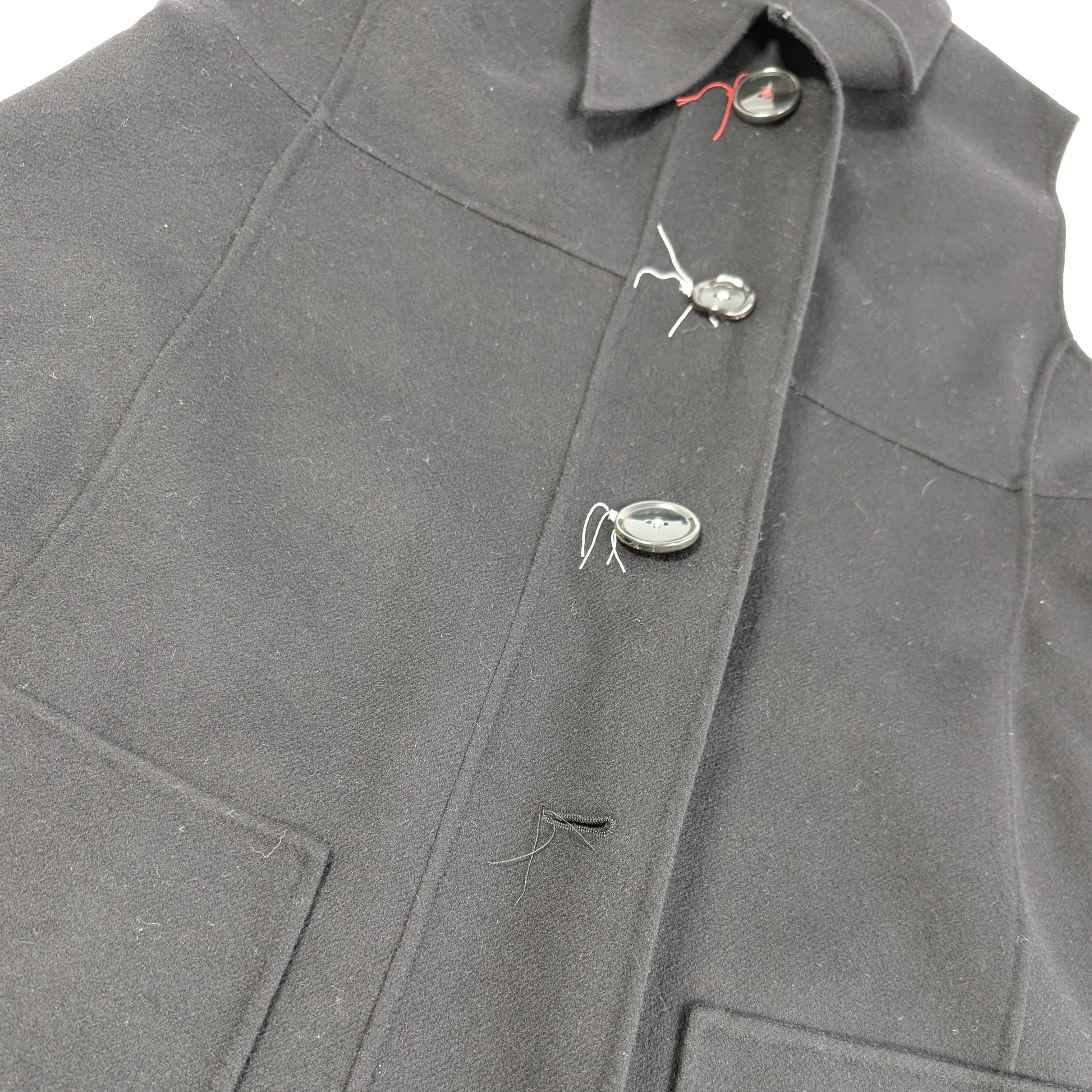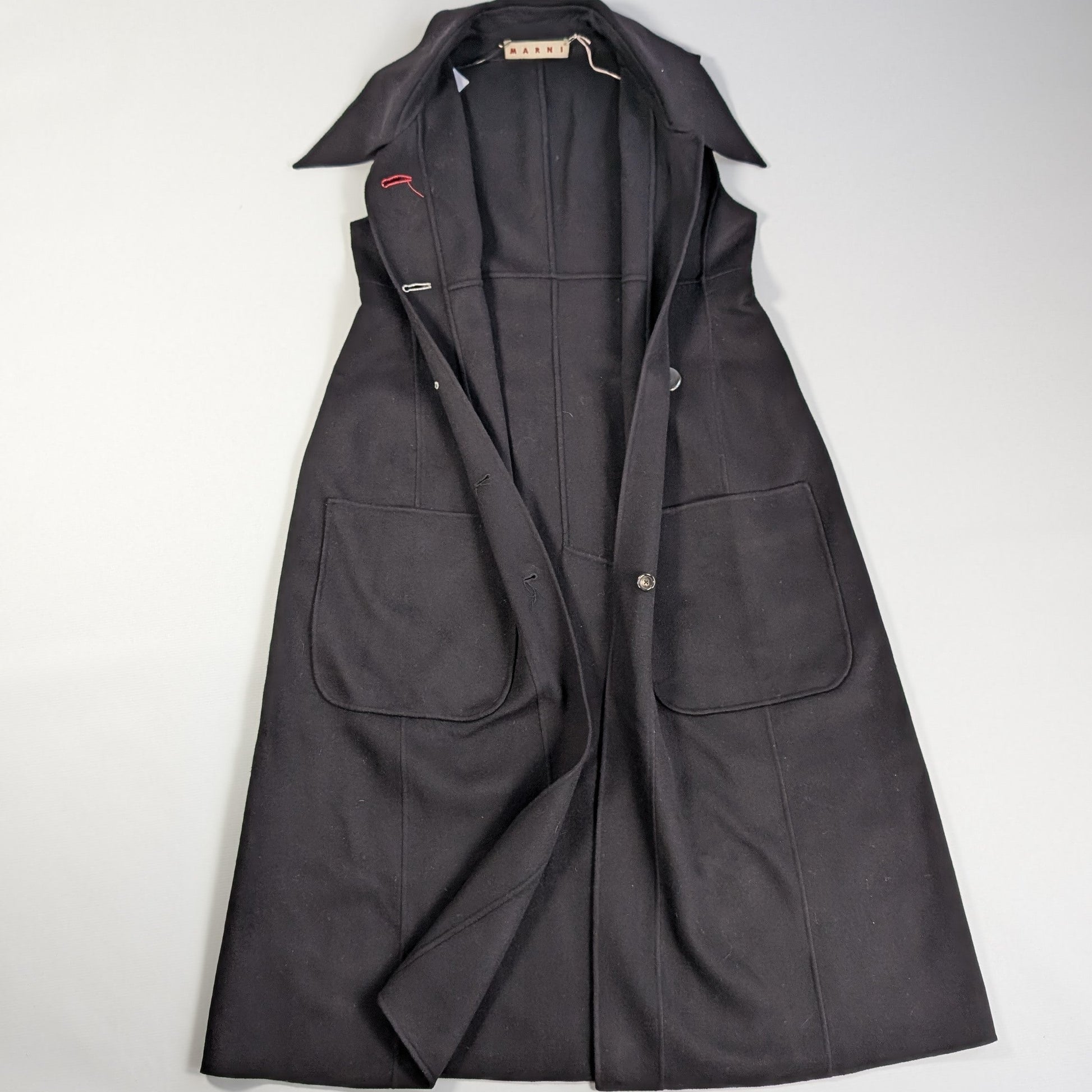 This sleek, sleeveless black dress by Marni features a structured design with oversized front pockets, button closure, and a tailored silhouette. Crafted from high-quality wool, it offers a refined, minimalist aesthetic perfect for layering.