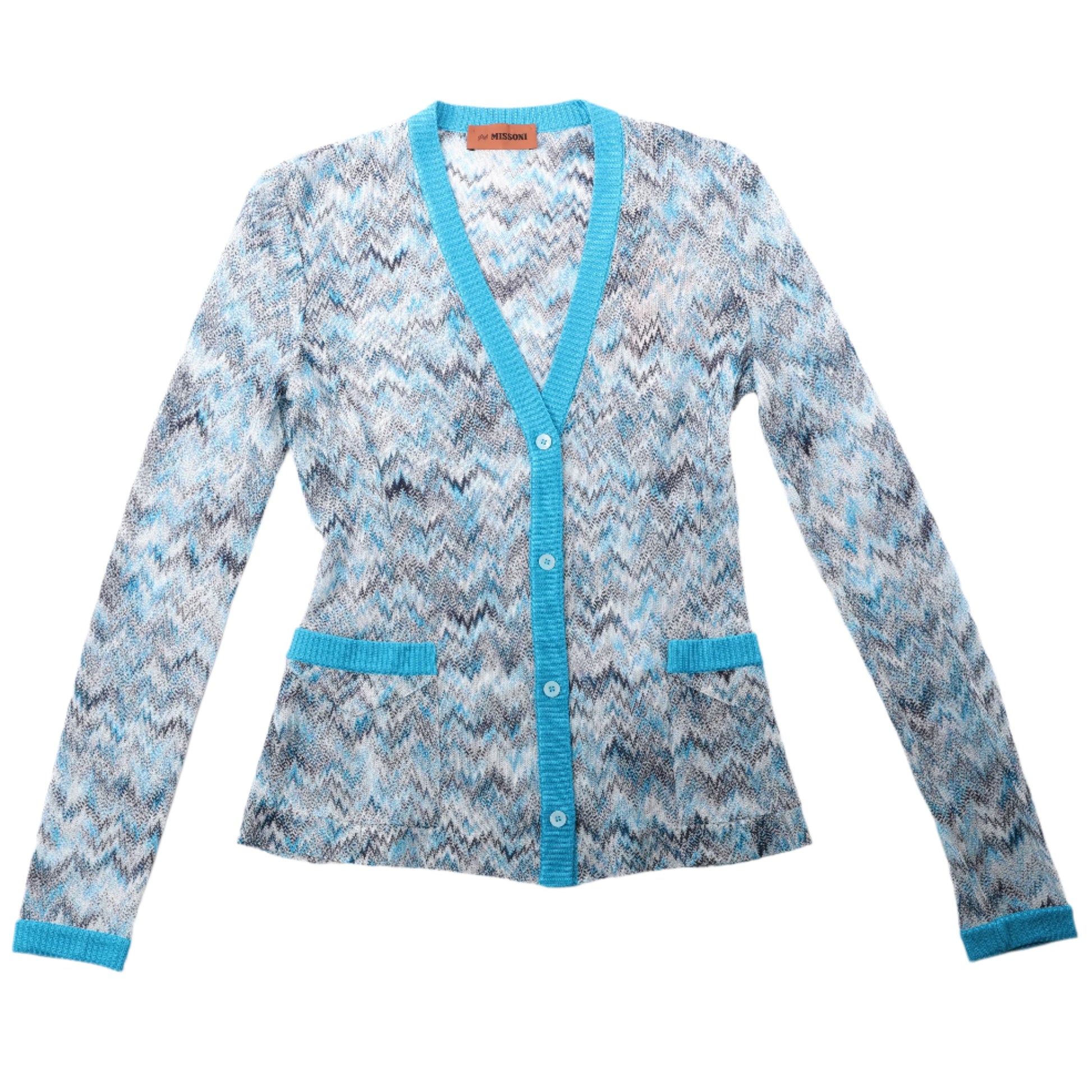 Elegant Missoni crochet-knit cardigan in blue with signature zigzag pattern and contrast trims. A timeless Italian design in size 40 IT, perfect for adding texture and sophistication to your look.