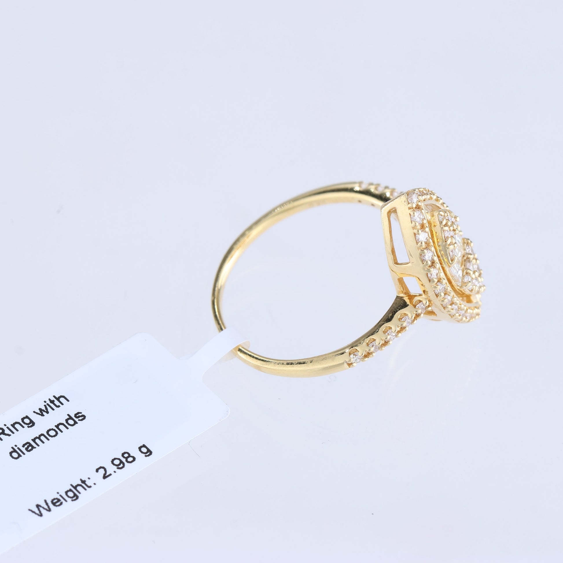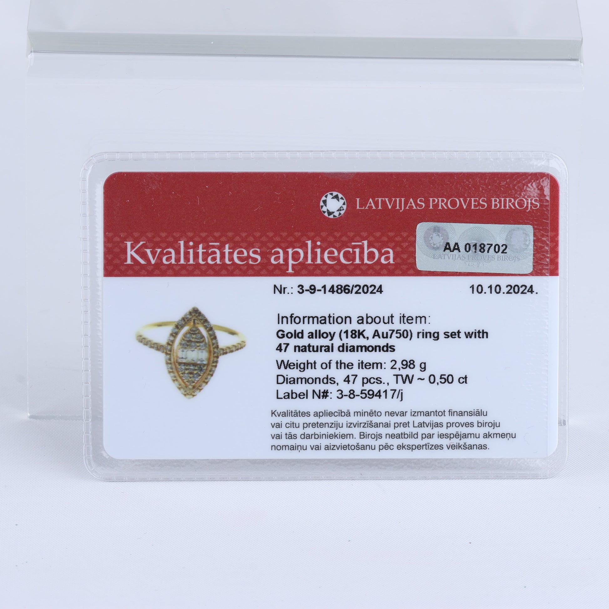 18 carat gold ring set with 47 natural diamonds. Please see photos of quality certificates from Latvia Assay Office for more detailed information.