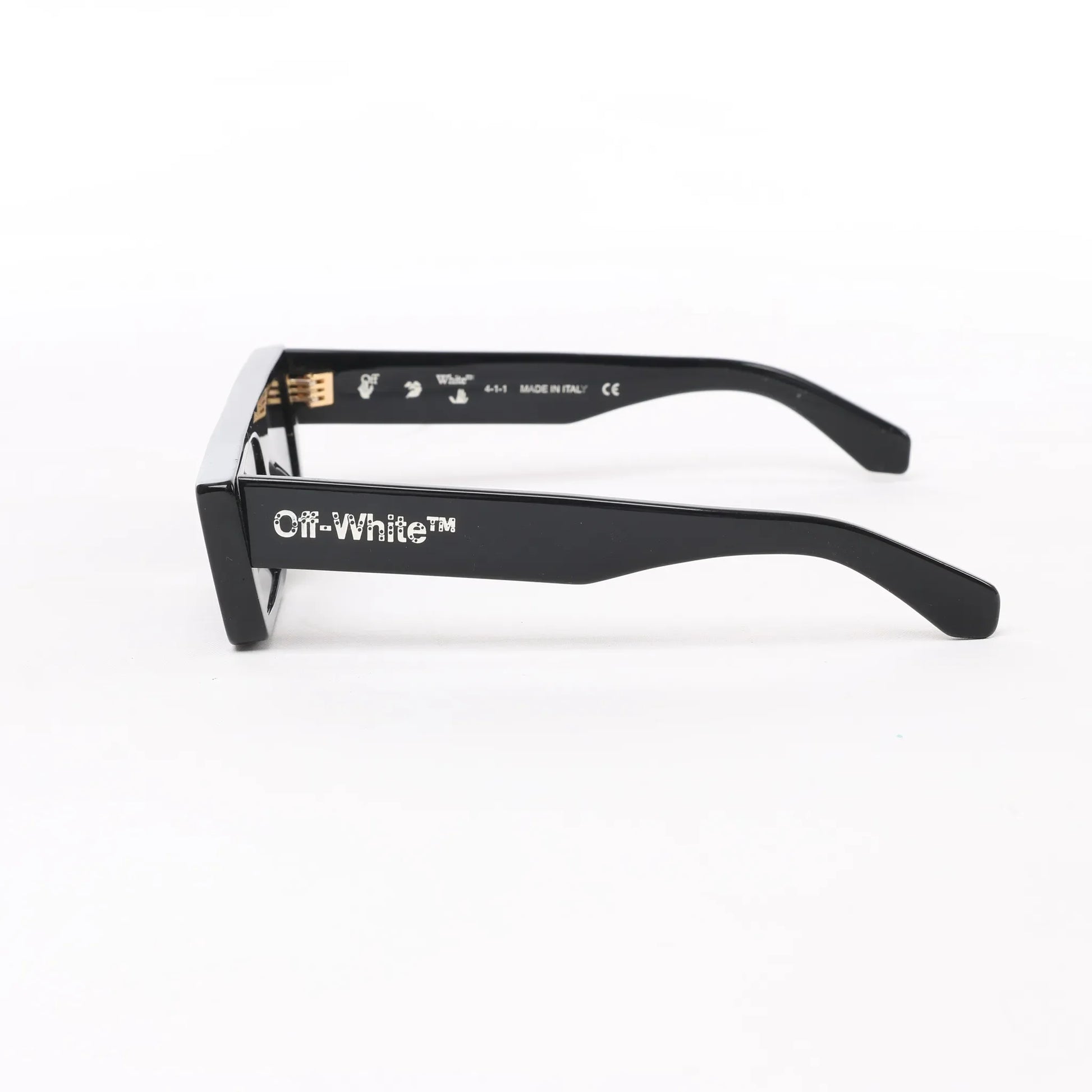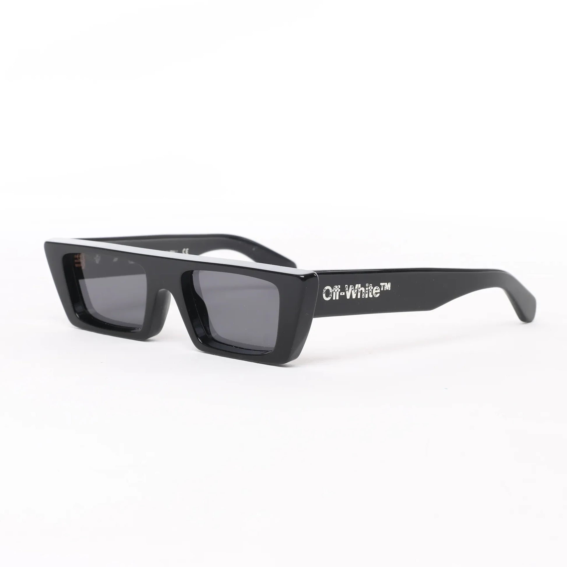 Off-White Manchester Sunglasses OERI010 in black acetate, featuring a sleek rectangular frame with angular edges and dark lenses. A modern, edgy accessory that perfectly embodies Off-White’s urban-luxe aesthetic.