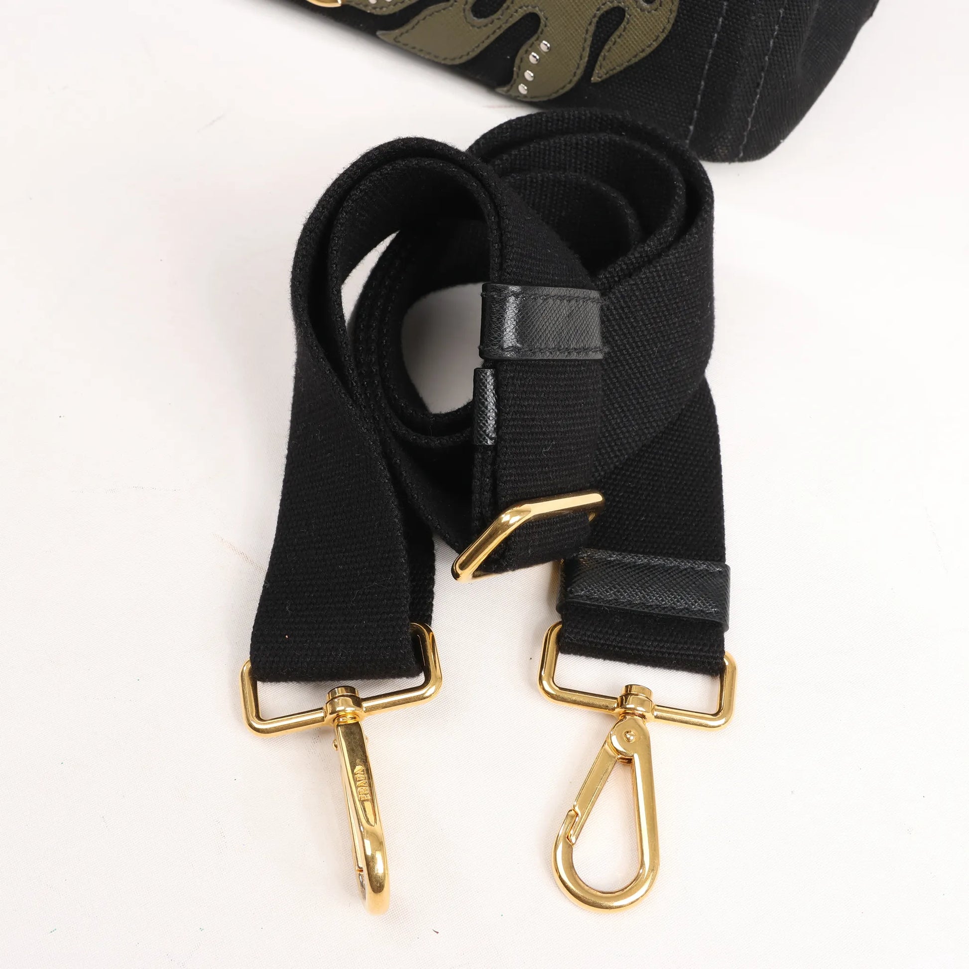 Prada’s Canapa Hawaii 2Way Handbag features black canvas with bold orange and green tropical appliqués. This eye-catching piece is crafted with gold-tone hardware and detachable shoulder strap for versatile styling.
