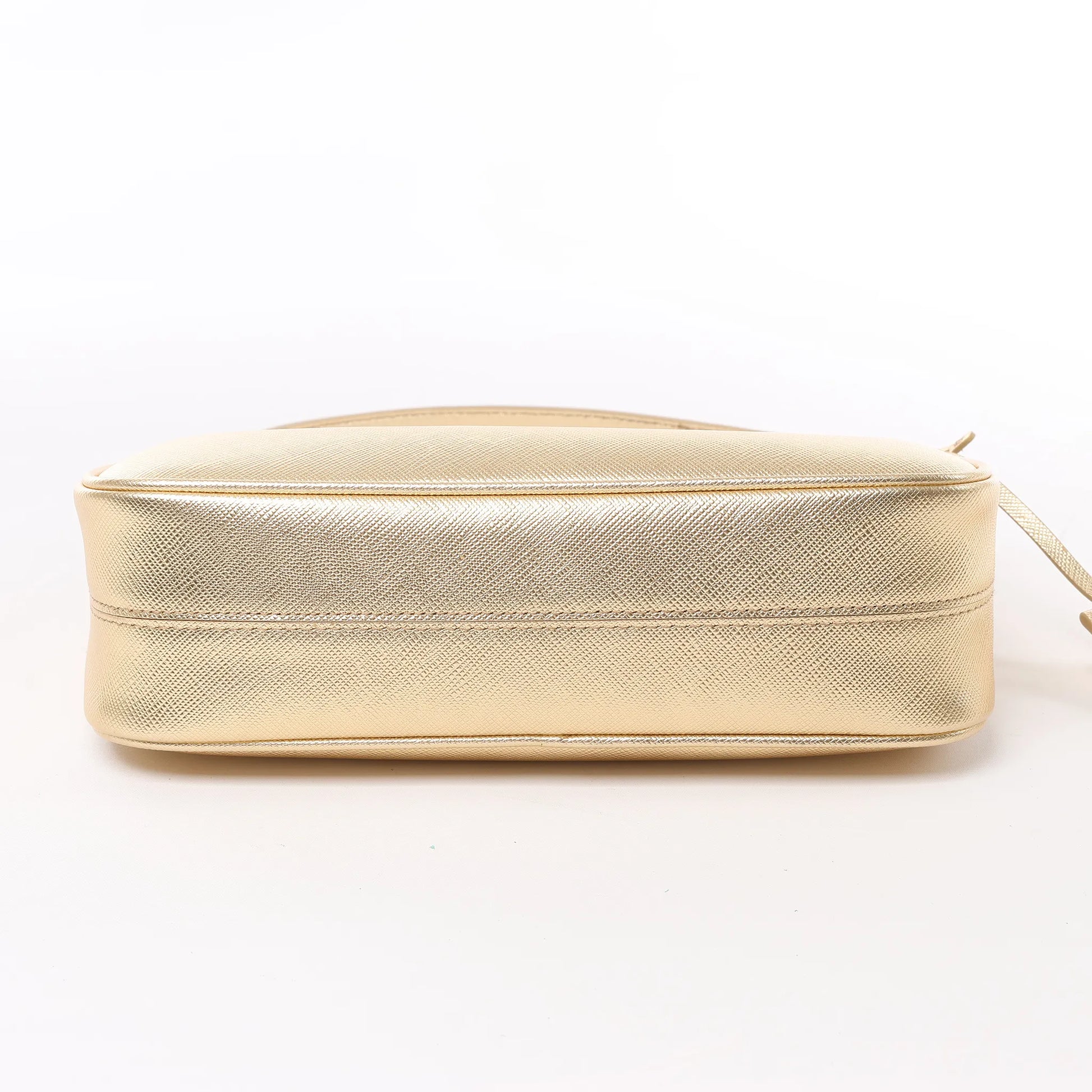 The Prada Saffiano Lux Mini Re-Edition Shoulder Bag 1BC204 in Platino shines in metallic gold leather with signature crosshatch texture. Chic and compact, it’s perfect for adding a glamorous touch to any outfit.