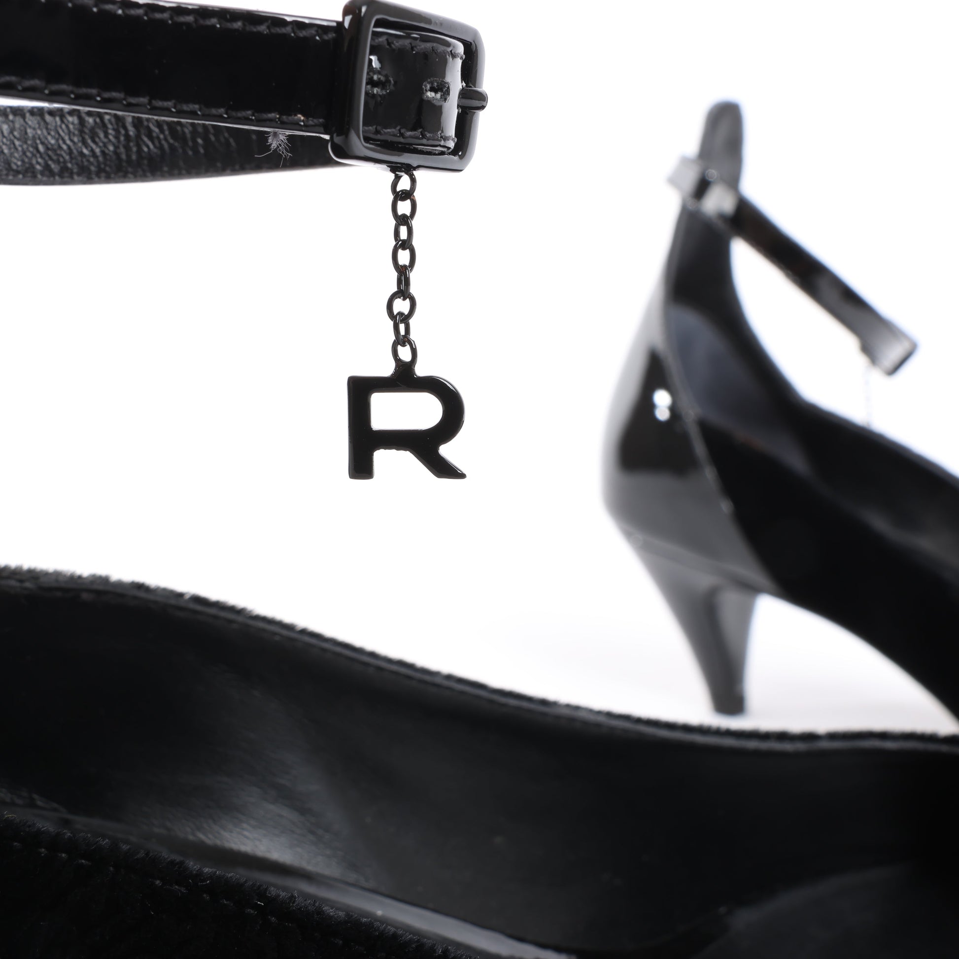 Rochas black pumps in size 37 EU feature a chic mix of velvet and patent leather, a pointed toe, and elegant ankle strap. A sleek kitten heel adds a timeless, feminine finish perfect for sophisticated day-to-night transitions.