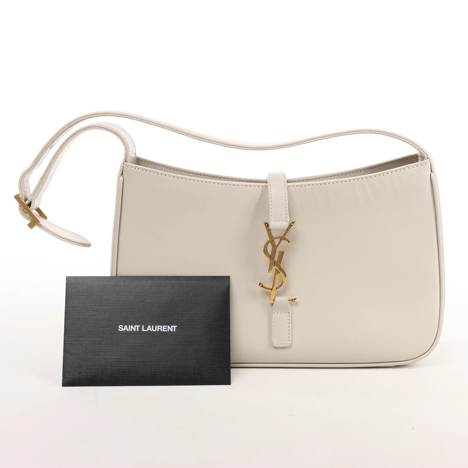 The Saint Laurent Le 5 à 7 Small Shoulder Bag 657228 in beige smooth leather exudes minimalist elegance, featuring a sleek silhouette, adjustable strap, and iconic gold YSL logo—perfect for elevated day-to-night styling.