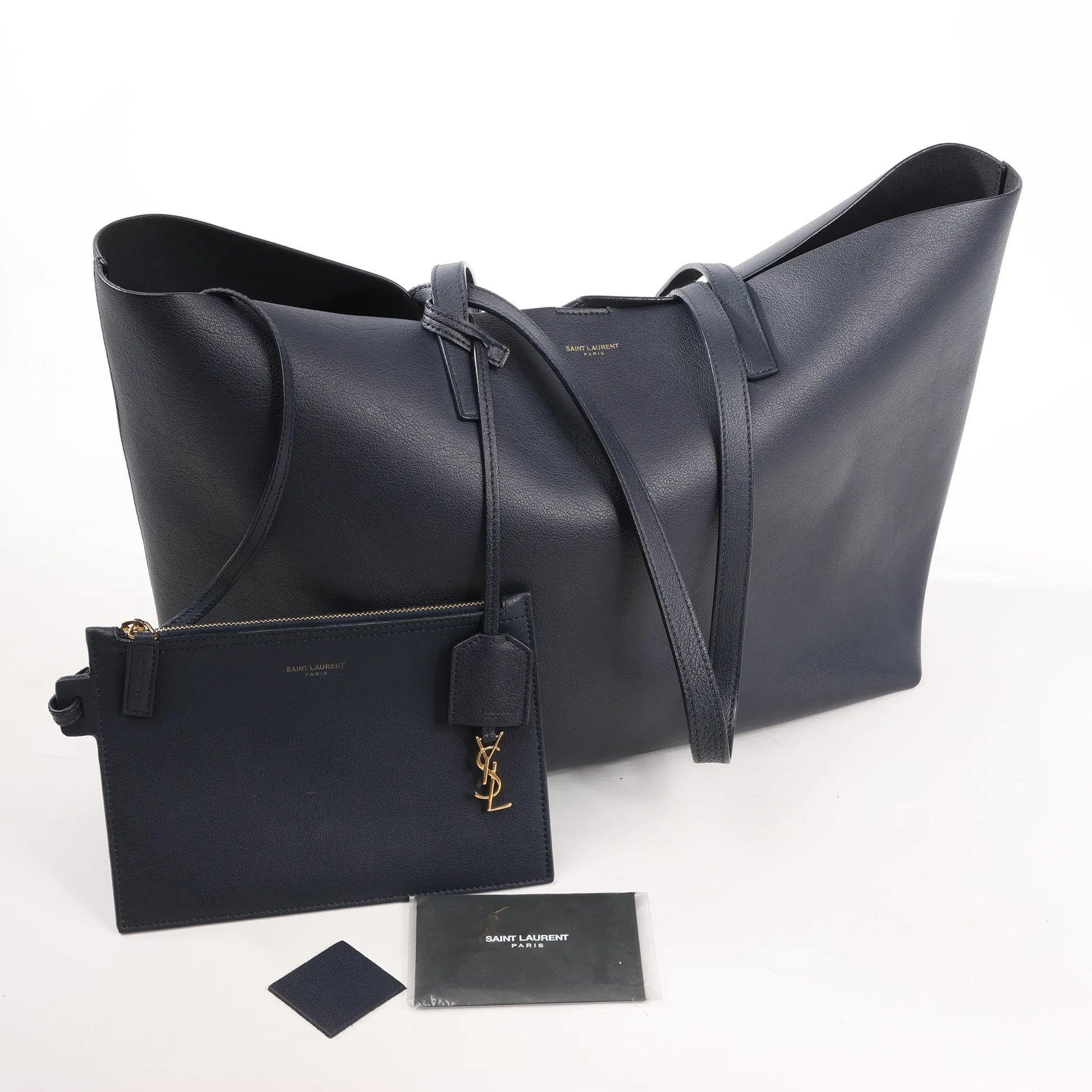 The Saint Laurent Paris Shopping Bag (394195) in navy blue calfskin leather offers minimalist luxury with a spacious interior and detachable pouch. Ideal for everyday use, this sleek tote combines function with signature YSL sophistication.