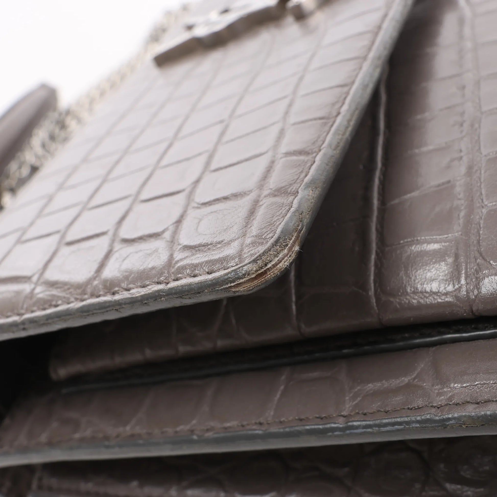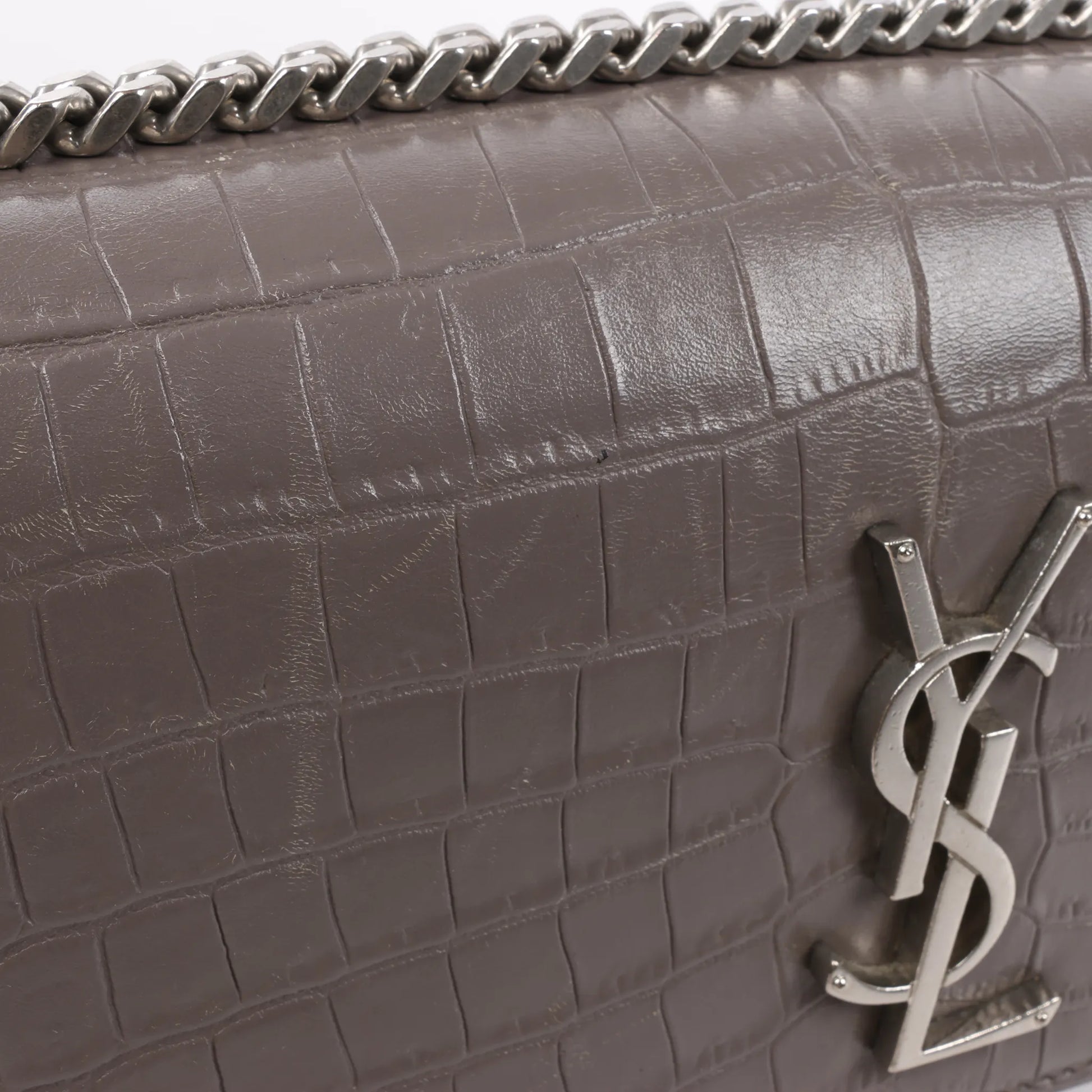 The Saint Laurent Paris Sunset Medium Shoulder Bag 442906 in gray mock croc leather is a bold expression of modern elegance. Featuring a structured silhouette, silver-tone chain strap, and iconic YSL logo, it's perfect for day-to-night sophistication.