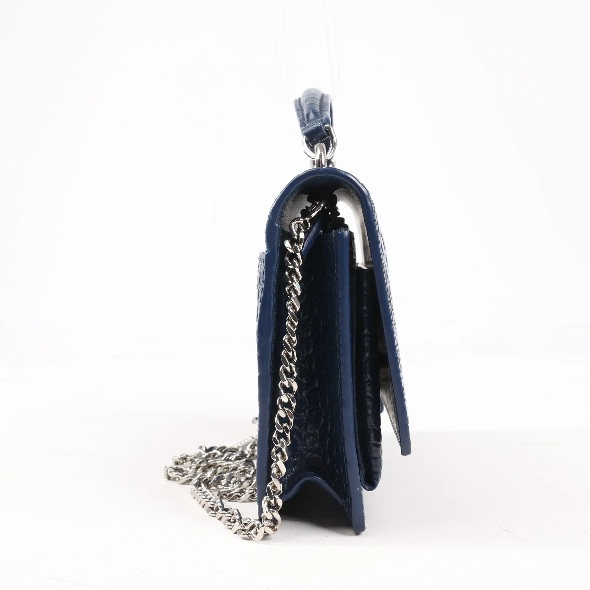 Turn heads with the Saint Laurent Paris Sunset Shoulder Bag 533026 in navy blue mock croc embossed leather. Featuring silver-tone hardware and the iconic YSL logo, this structured piece blends luxury craftsmanship with edgy elegance.