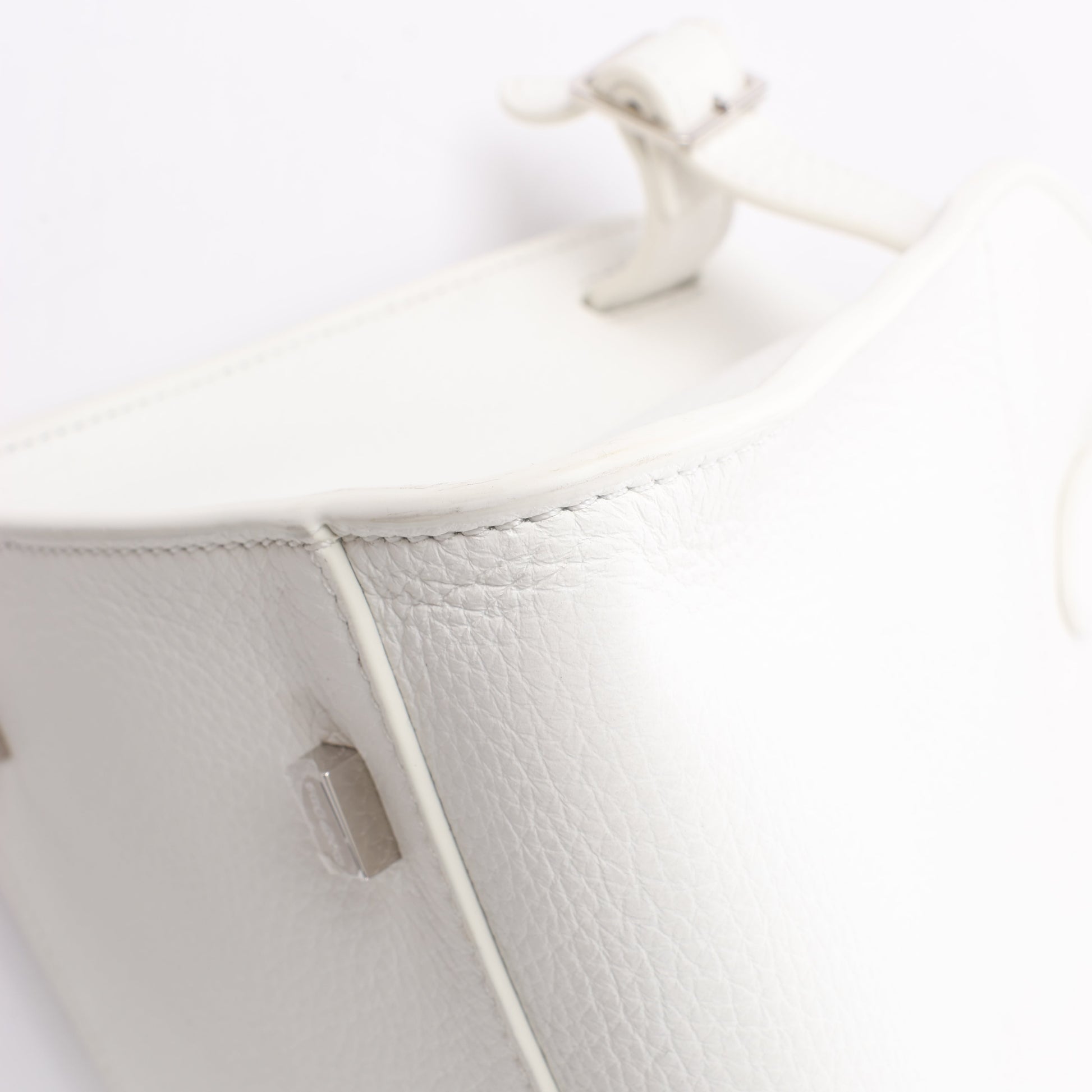 The Row Soft Margaux 10 in white leather embodies quiet luxury with its sculpted silhouette, pebbled texture, and minimalist design. A refined 2-way piece that balances elegance and everyday ease.