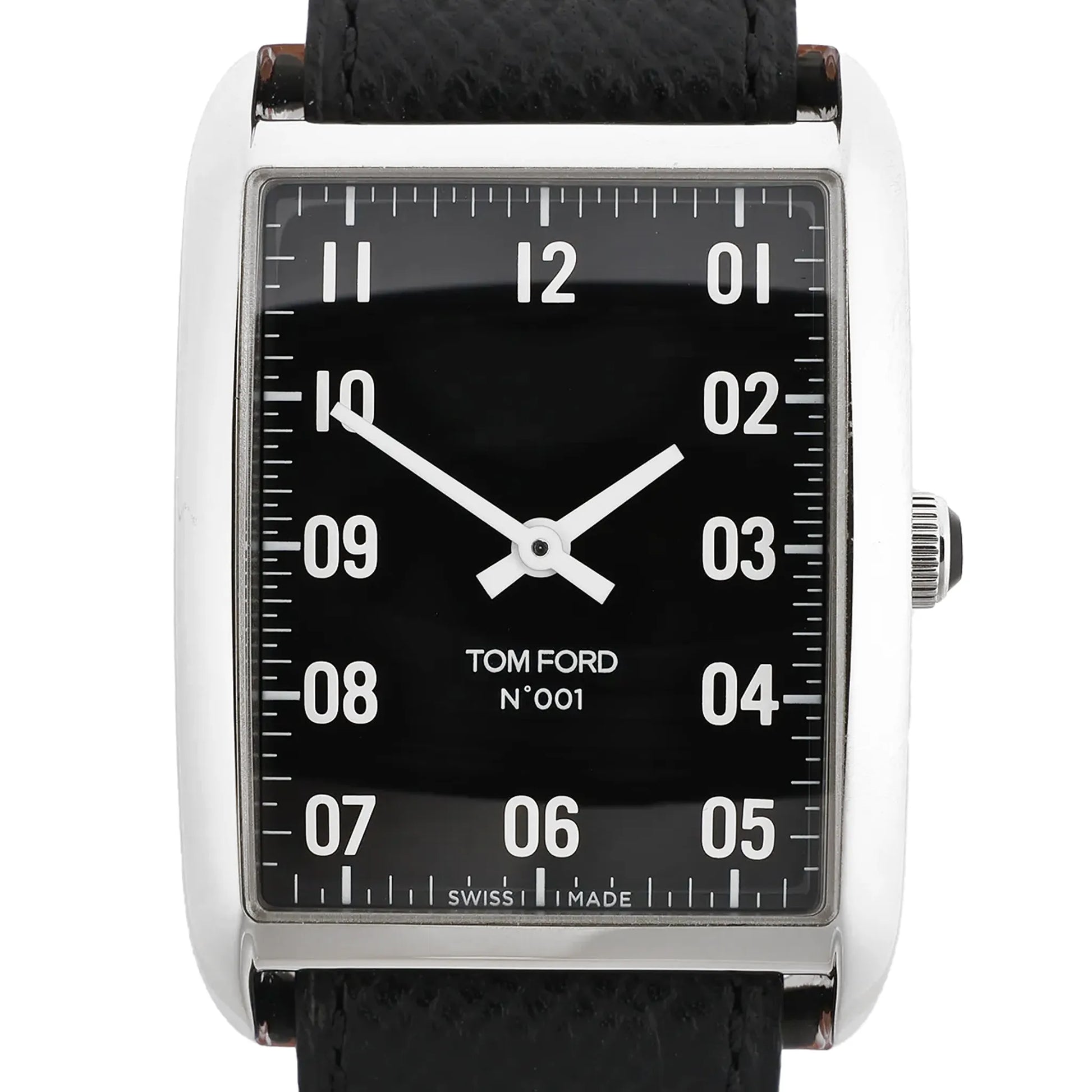 The Tom Ford N.001 TFT001003 blends bold modernism with timeless elegance, featuring a sleek stainless steel case, black dial, and textured leather strap—Swiss-made precision meets signature designer style.