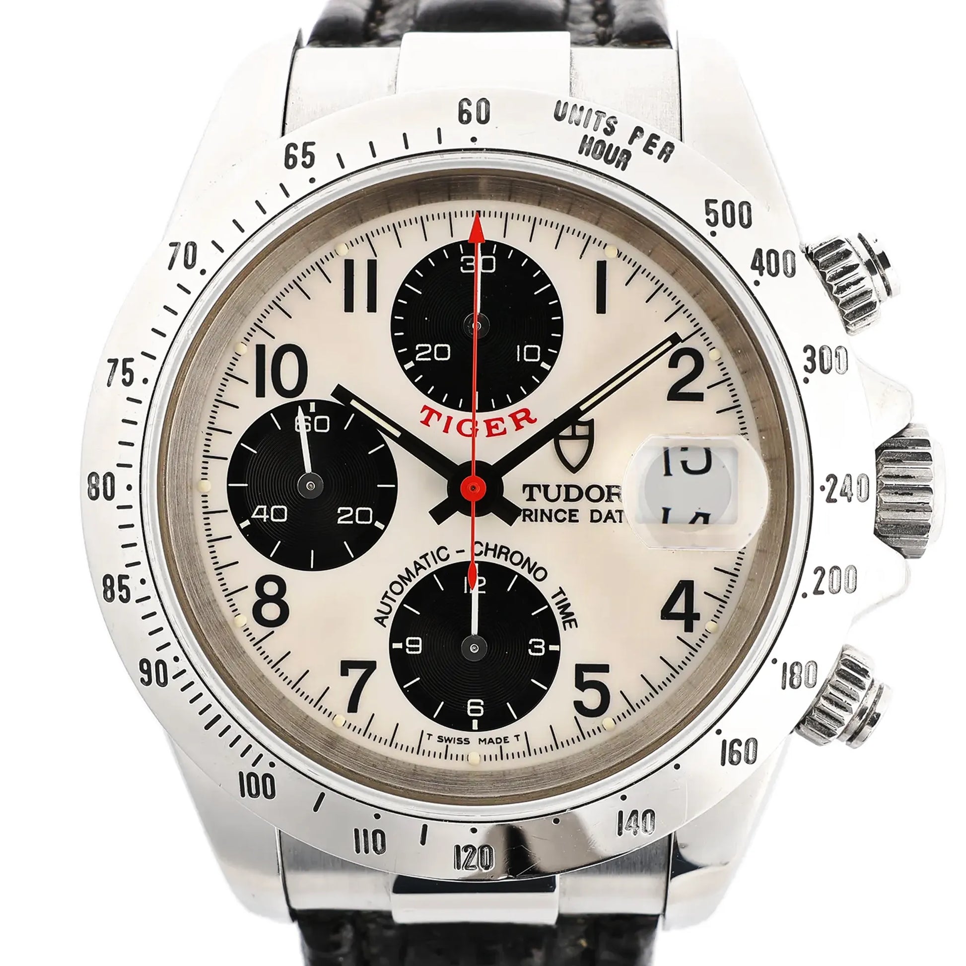 The Tudor Prince Tiger Chrono 79280P is a bold stainless steel automatic chronograph featuring a striking silver dial, black subdials, and a classic black leather strap. Designed for precision, it’s a collector’s favorite from the Prince Date line.