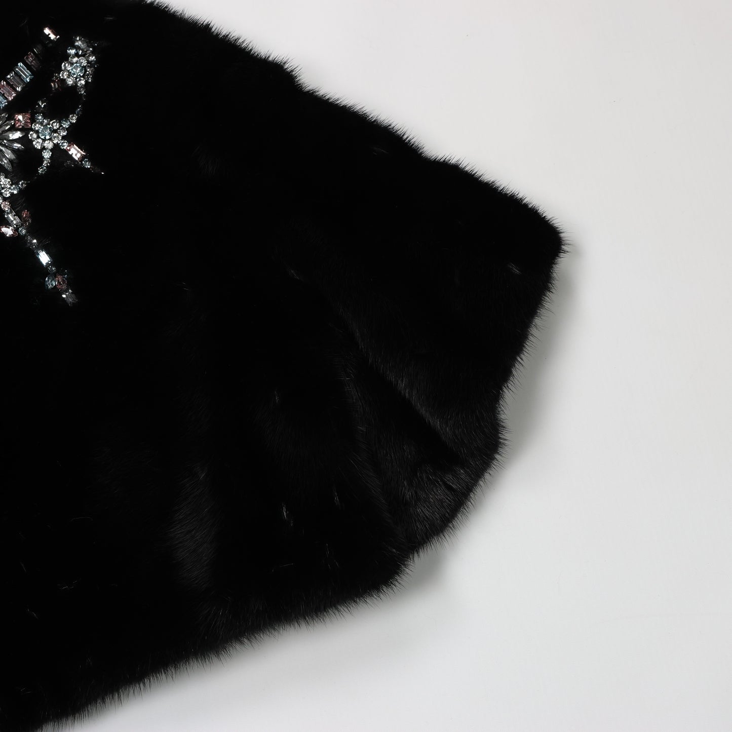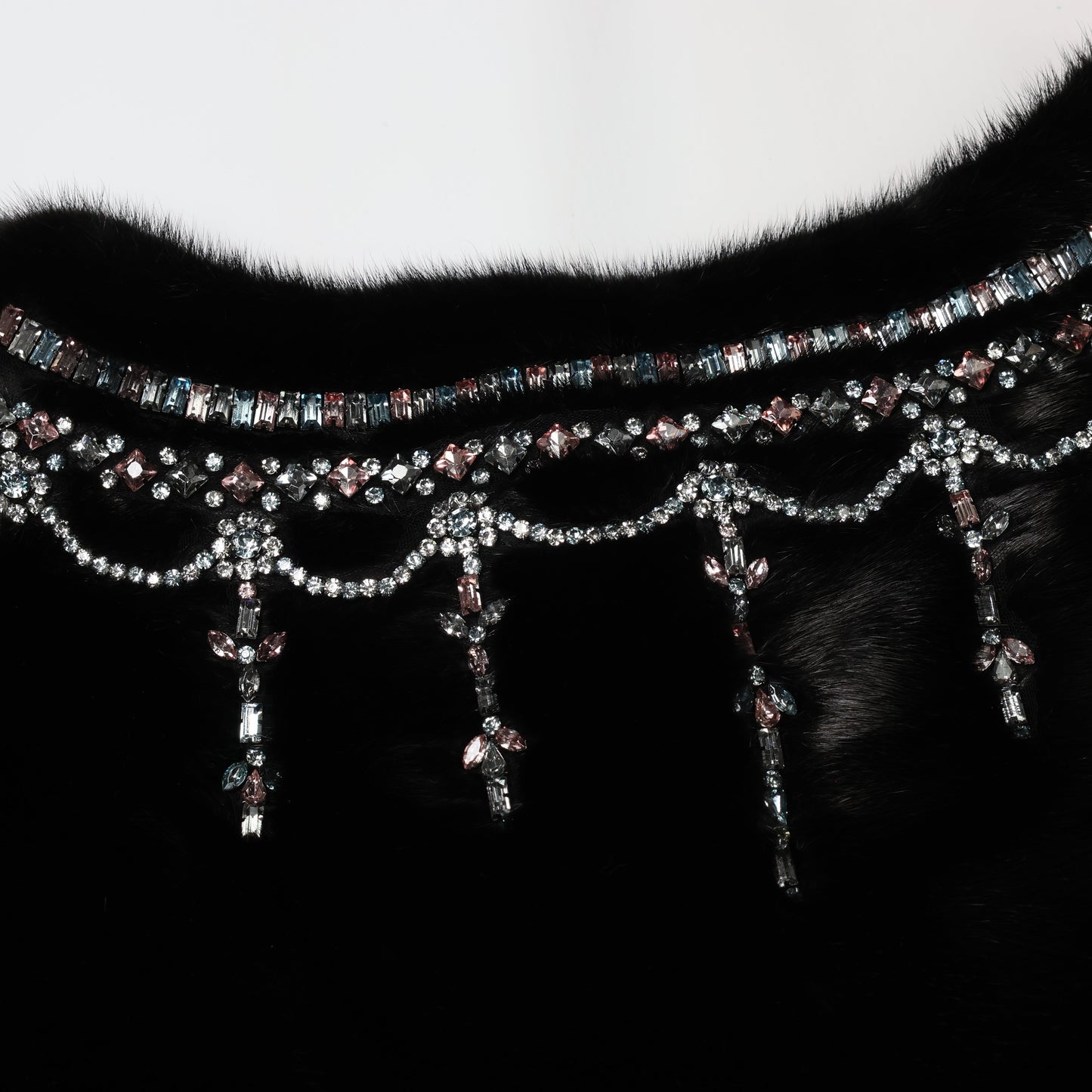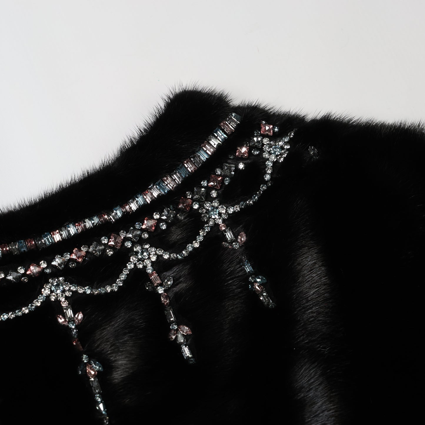 Luxurious Valentino black mink fur capelet adorned with stunning crystal embellishments for a glamorous touch. Soft and elegant, perfect for evening events or adding sophistication to any outfit. Made in Italy.
